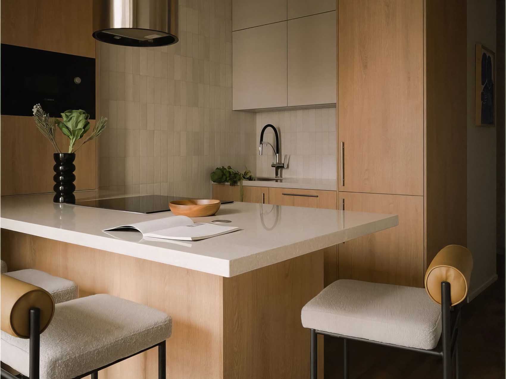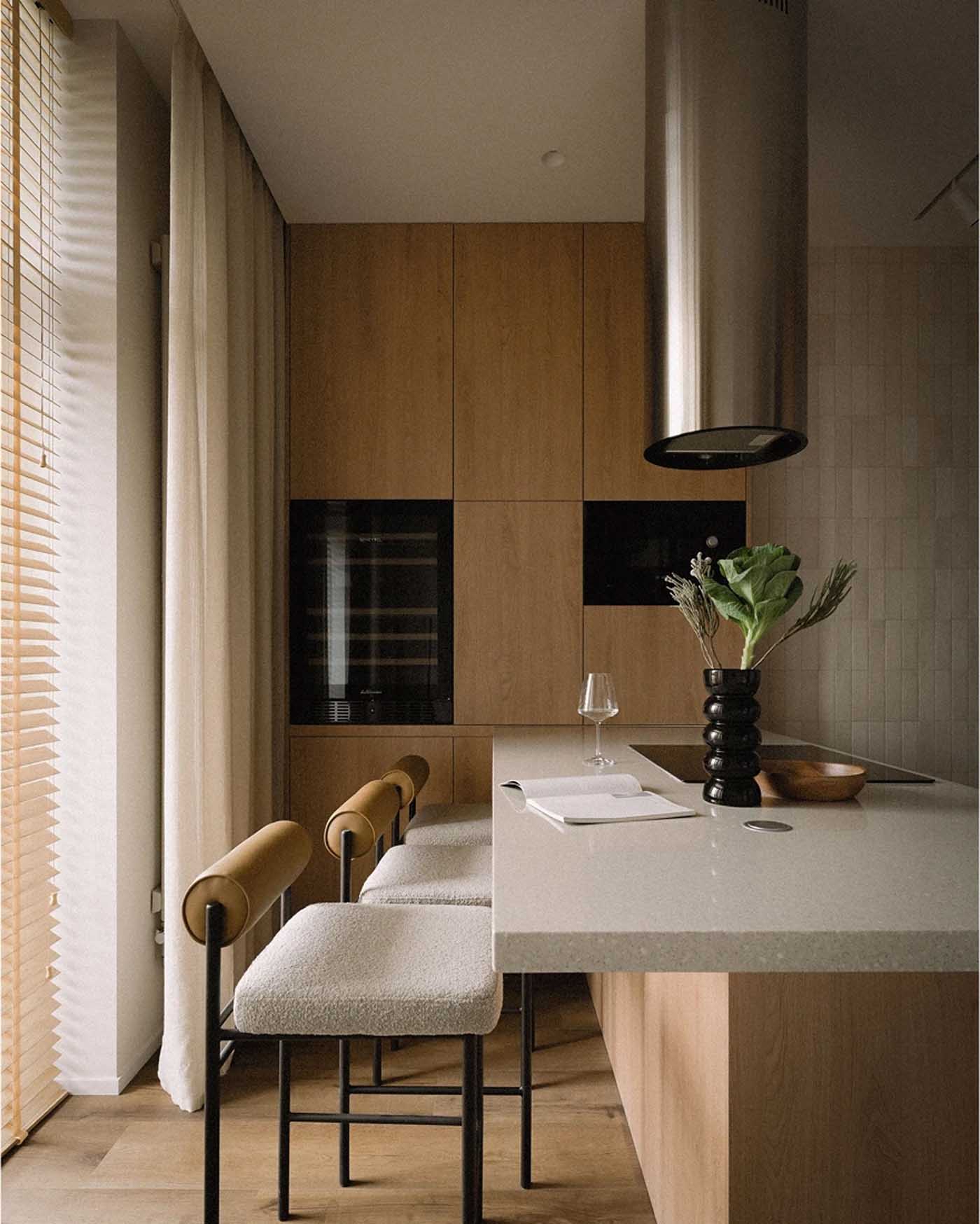 A tervező egy konyhaszigetet alakított ki, amely nemcsak munkafelületként szolgál, hanem a tér központi elemévé, a társasági élet színterévé vált – legyen szó egy esti borozásról vagy a reggeli kávézásról.