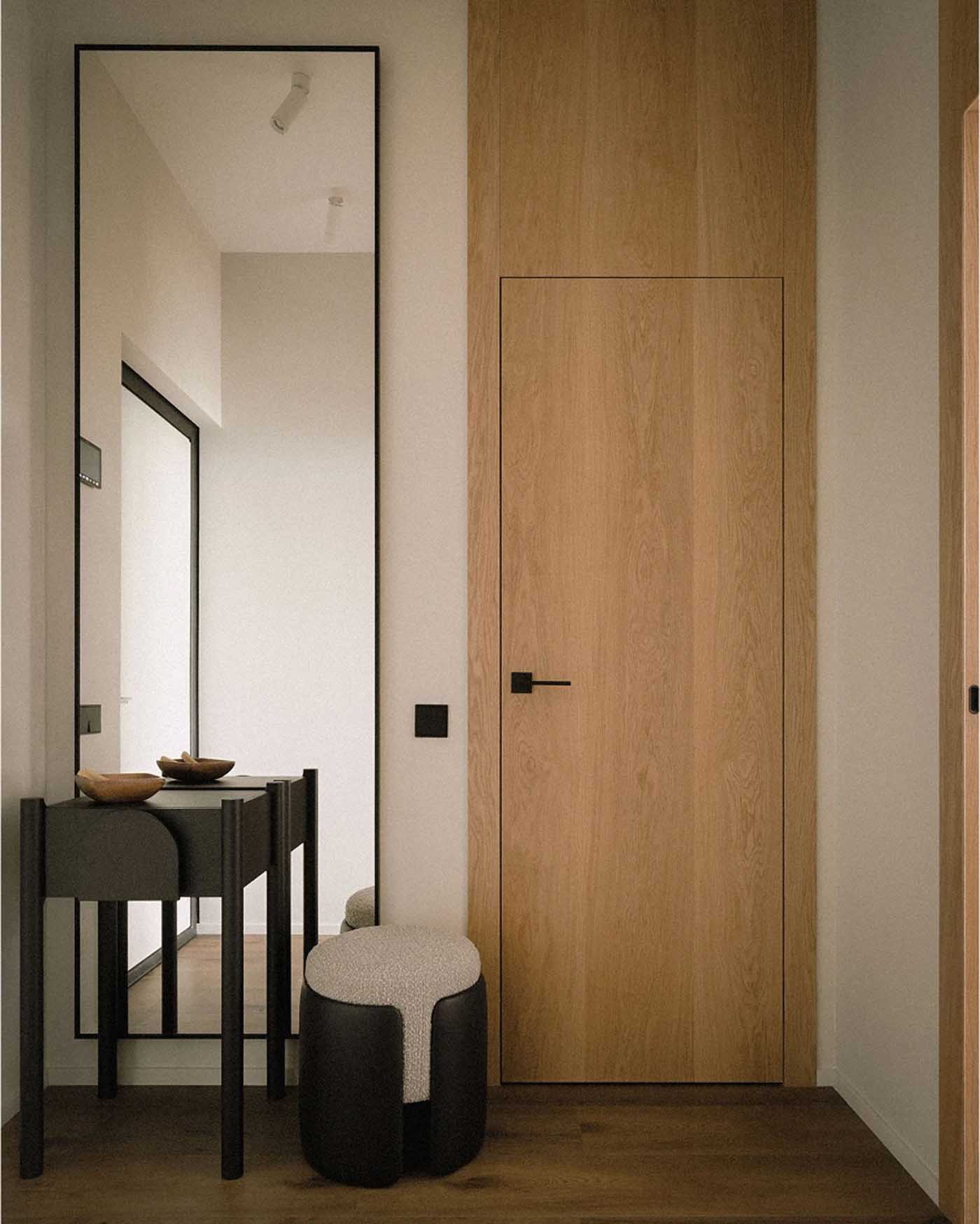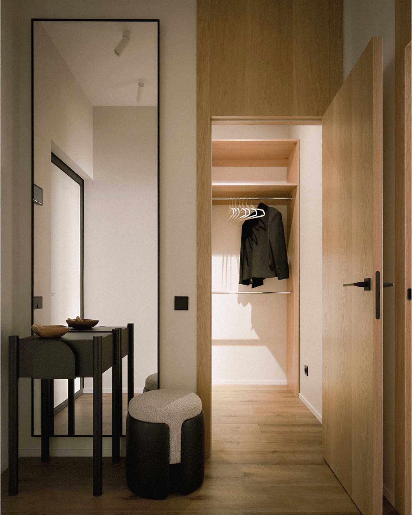 Ebben a projektben a szigorú költségkeret nem zárta ki az egyedi, magas színvonalú dizájnt. A tervező a japán esztétika letisztultságát hívta segítségül, hogy egy természetes hangulatú, minimalista enteriőrt hozzon létre. Az 50 négyzetméteres lakás tulajdonosának fő kérése volt, hogy az enteriőrben jelenjenek meg a keleti kultúrát idéző motívumok, anélkül, hogy az a funkcionalitás rovására menne.