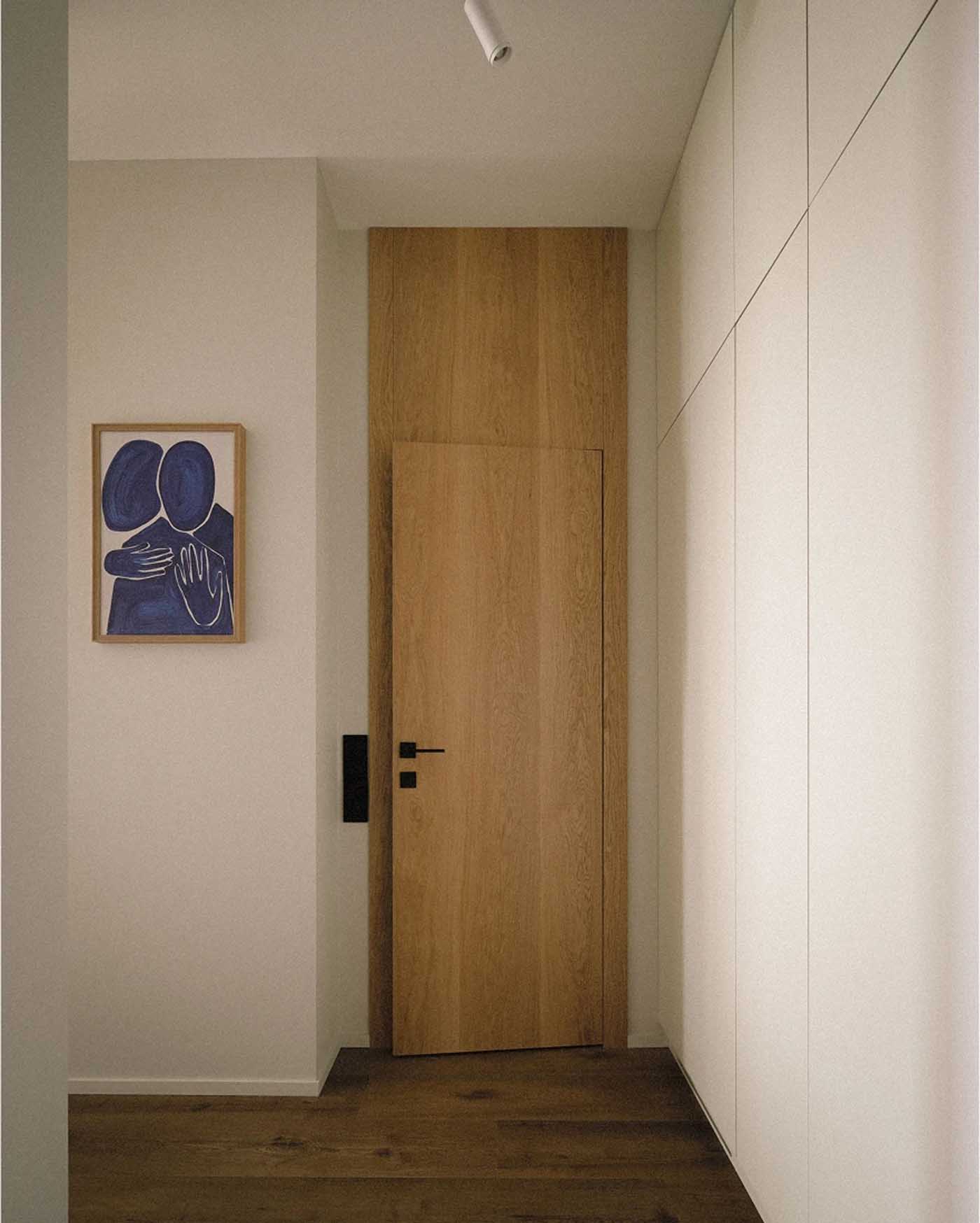 A lakás közepén elhelyezkedő tartóoszlop adta lehetőséget kihasználva a hálóban egy rejtett könyvespolcot alakítottak ki. Ez a tárolóelem nyitott ajtónál láthatatlan marad, így felfedezése gyakran kellemes meglepetést okoz a látogatóknak. A projekt során korlátozott büdzséből, de átgondolt tervezéssel harmonikus és időtálló életteret alkottak.