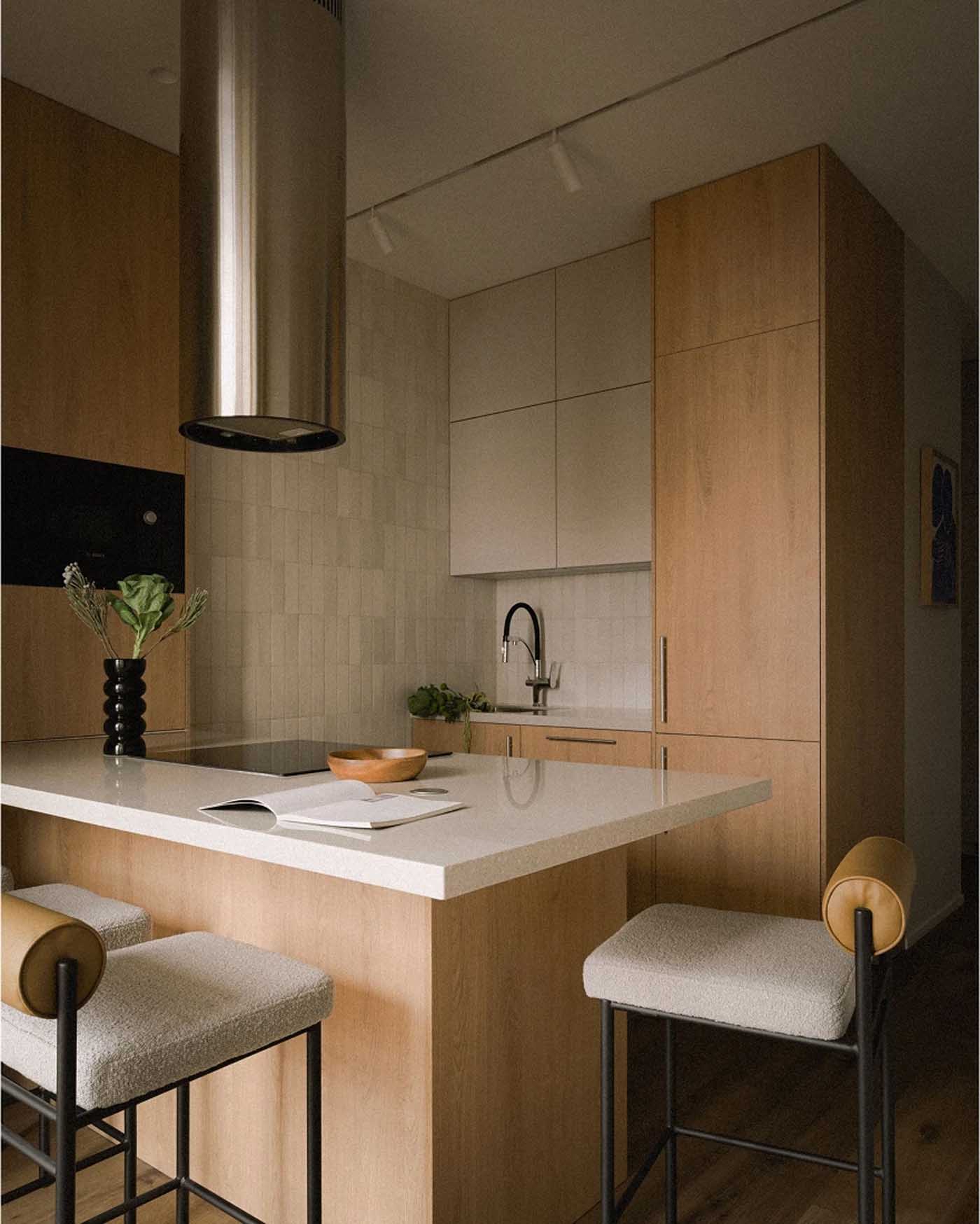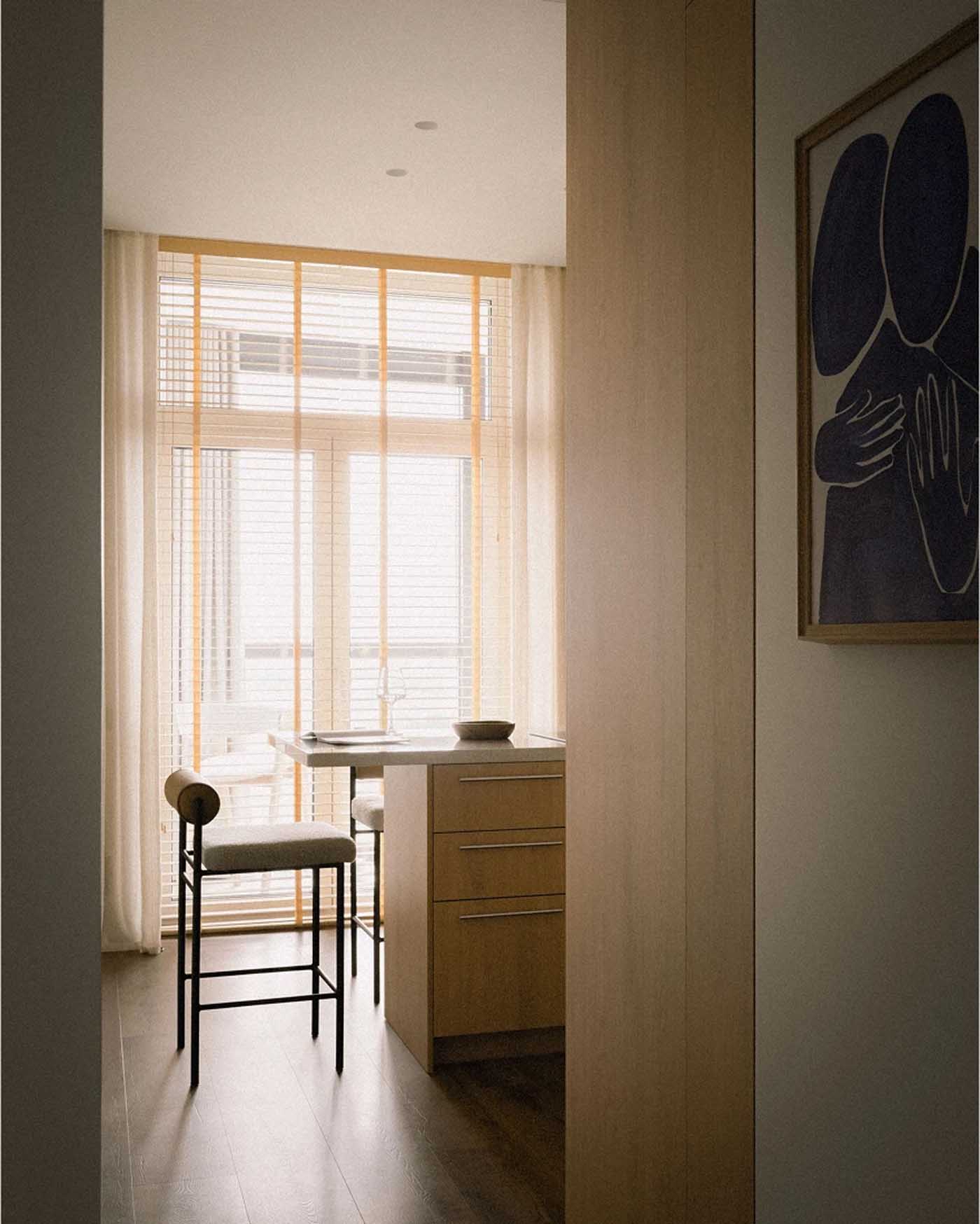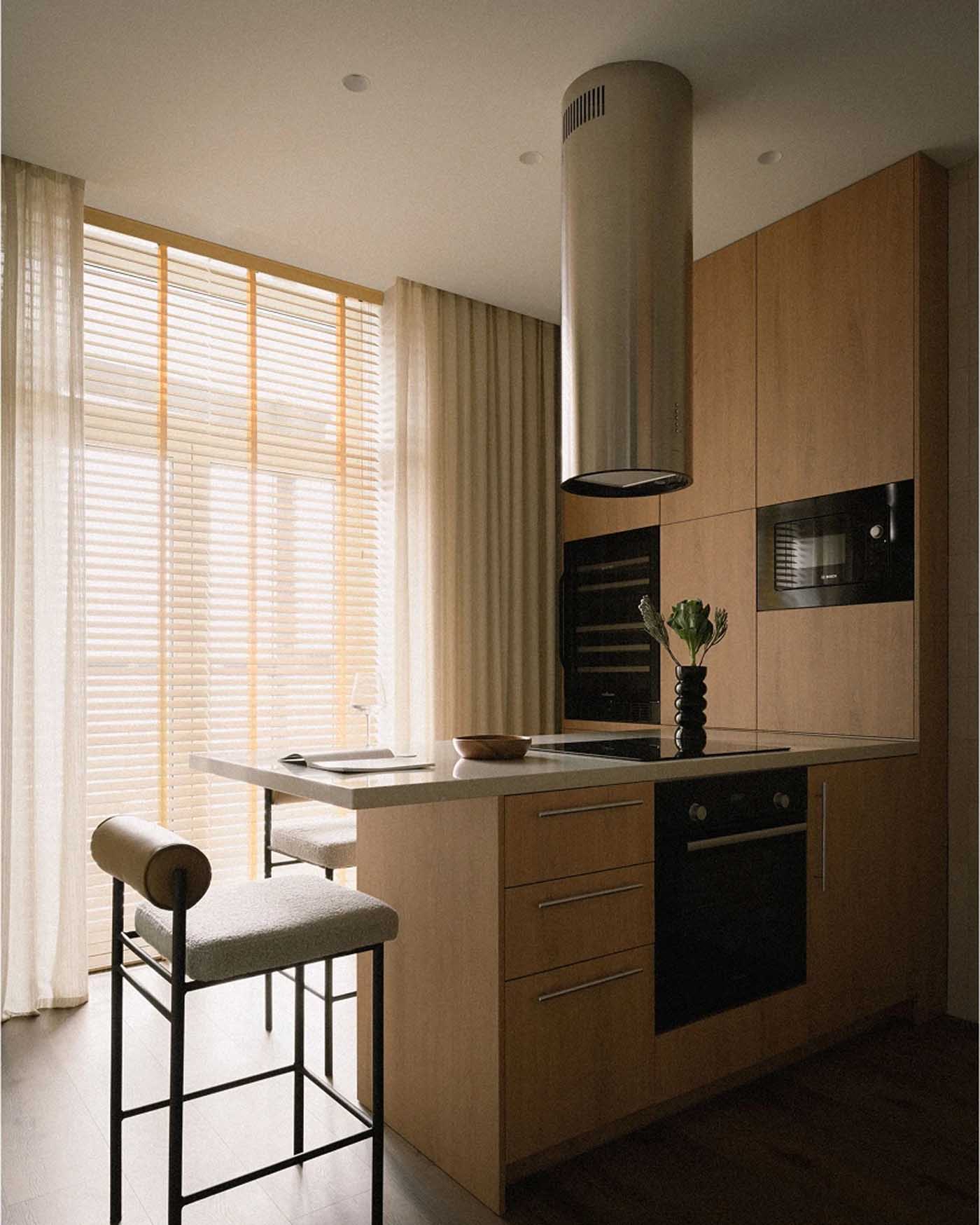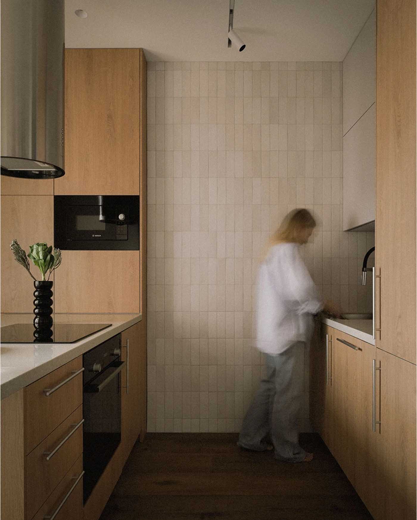 A költséghatékonyság érdekében a szerkezeti átalakításokat minimalizálták. A háló és a konyha közötti átjárót befalazták, így két teljesen szeparált helyiséget nyertek. A konyhai ablak alatti parapetfal elbontásával és padlótól mennyezetig érő erkélyajtók beépítésével maximalizálták a beáramló természetes fényt. Érdekes vizuális trükk a beltéri ajtók feletti, mennyezetig futó falpanelek alkalmazása: bár a költségvetés nem engedte a teljes magasságú nyílászárókat, ez a megoldás optikailag nyújtja a teret, míg a konyha felé nyitott, teljes magasságú nyílás tovább erősíti a tágasság érzetét.