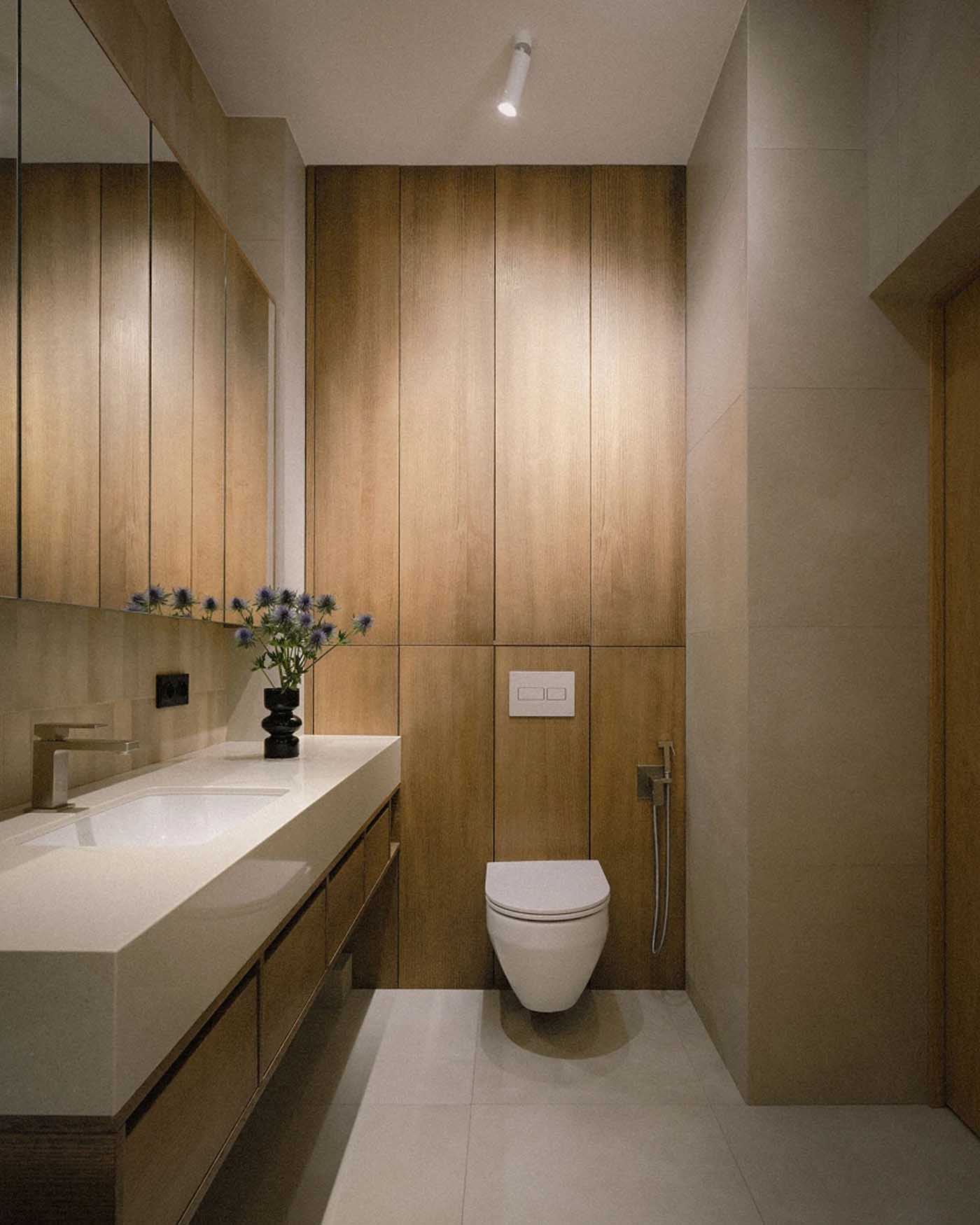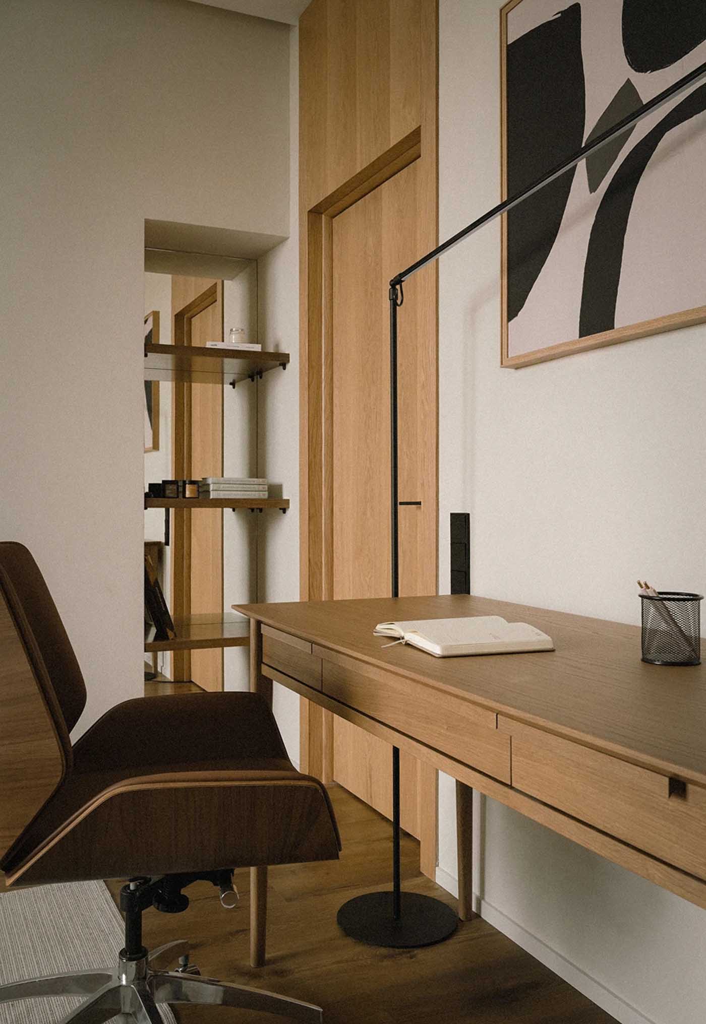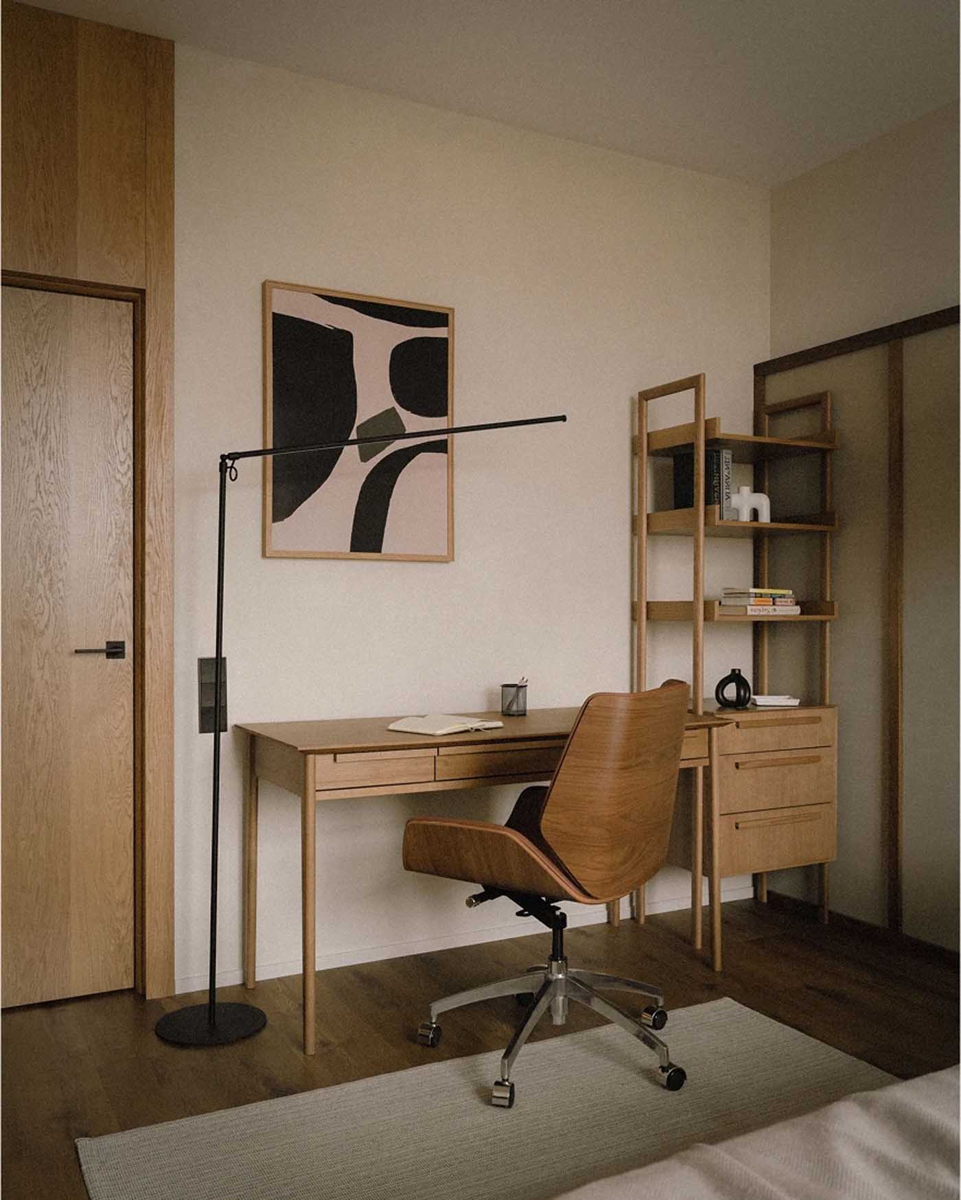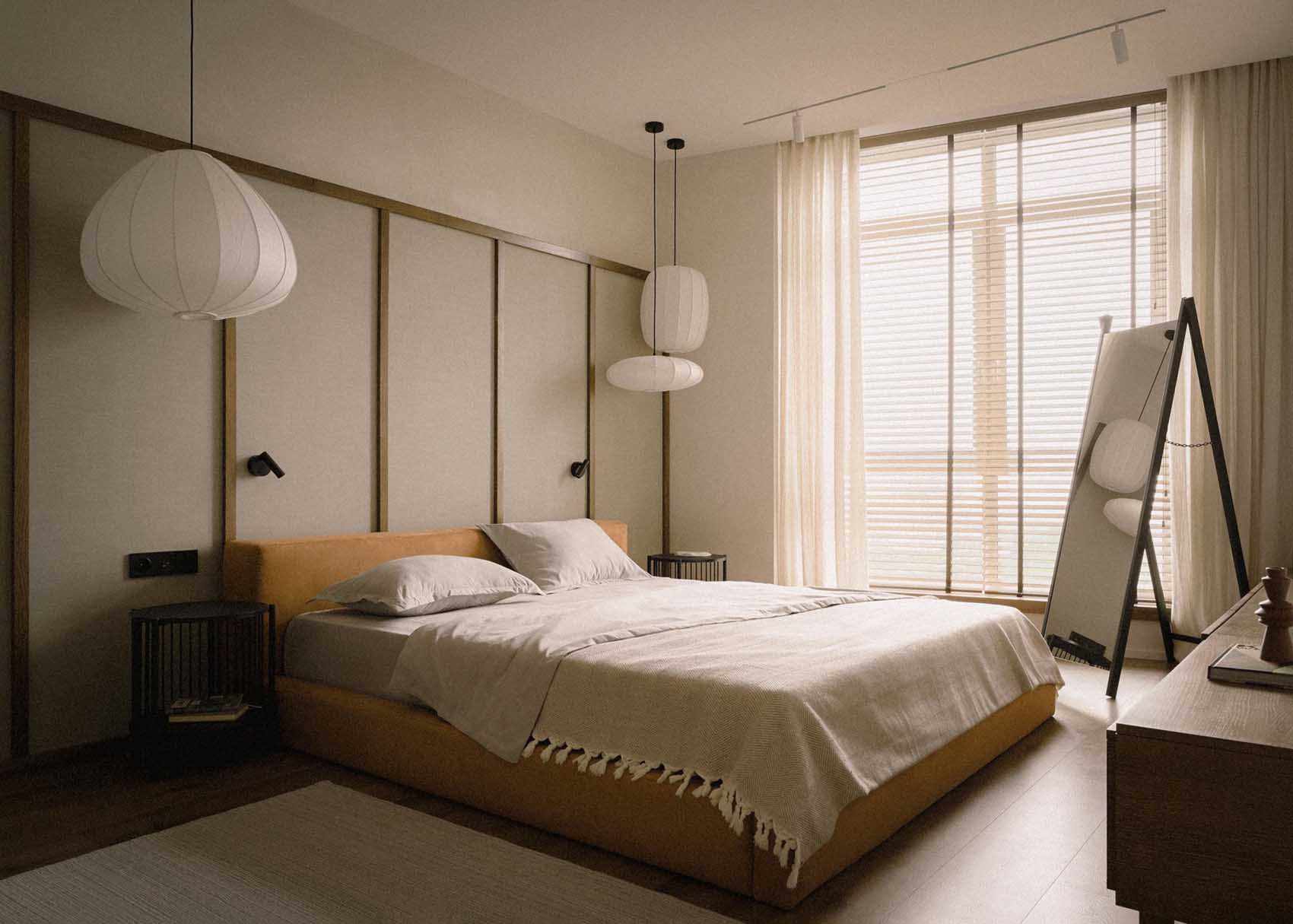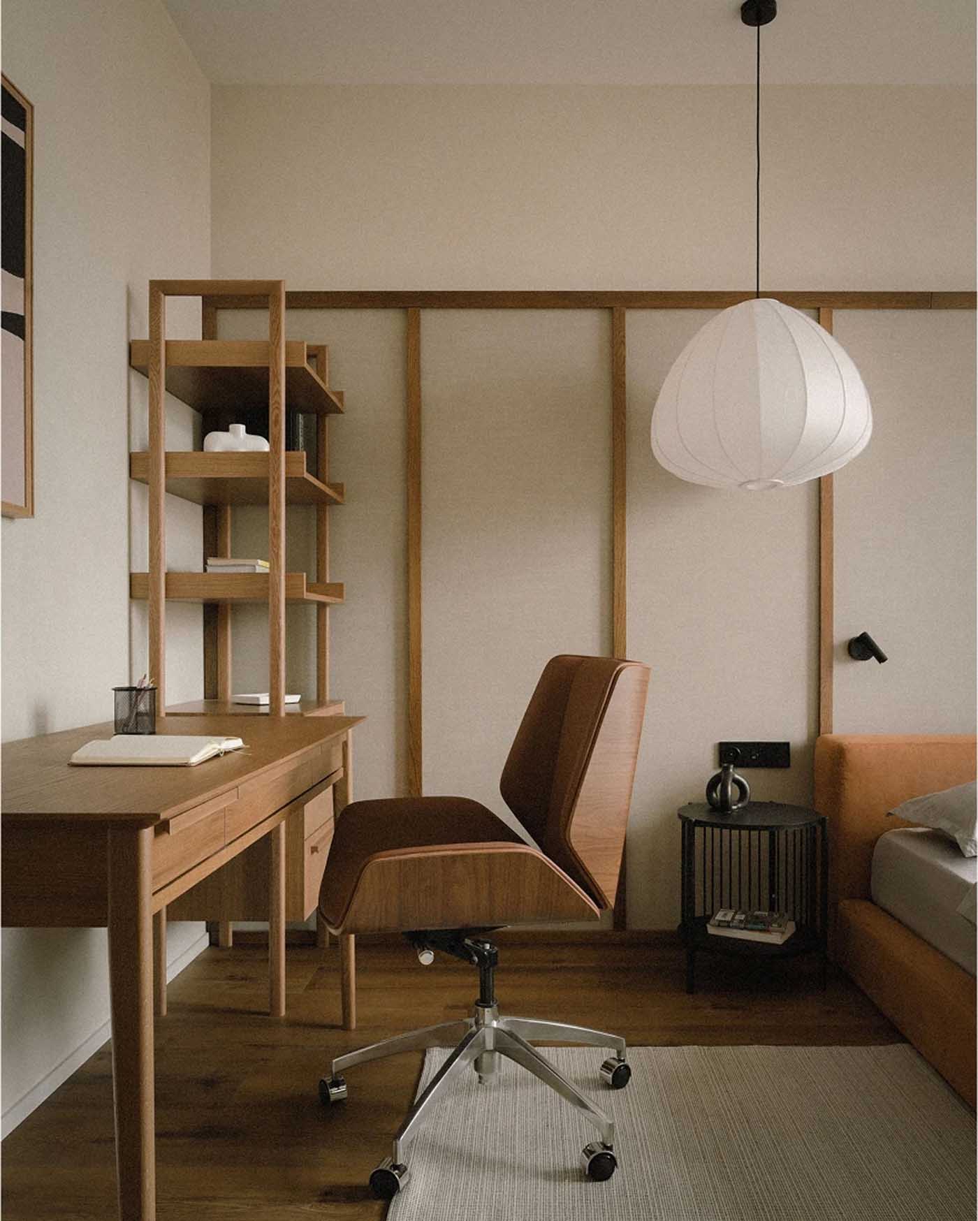 A fa felületek dominanciája, a bézs, az okker és a meleg szürke árnyalatok kiegyensúlyozott használata barátságos atmoszférát teremt. A bútorozás és a textilválasztás egyértelműen a japán minimalizmust tükrözi: fa reluxák és finom batiszt függönyök szűrik a fényt. Minden tárgyat a tiszta vonalvezetés és a funkcióközpontúság jellemez, a térben nincsenek felesleges, öncélú elemek.