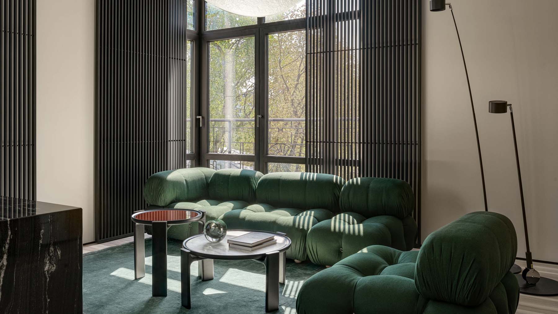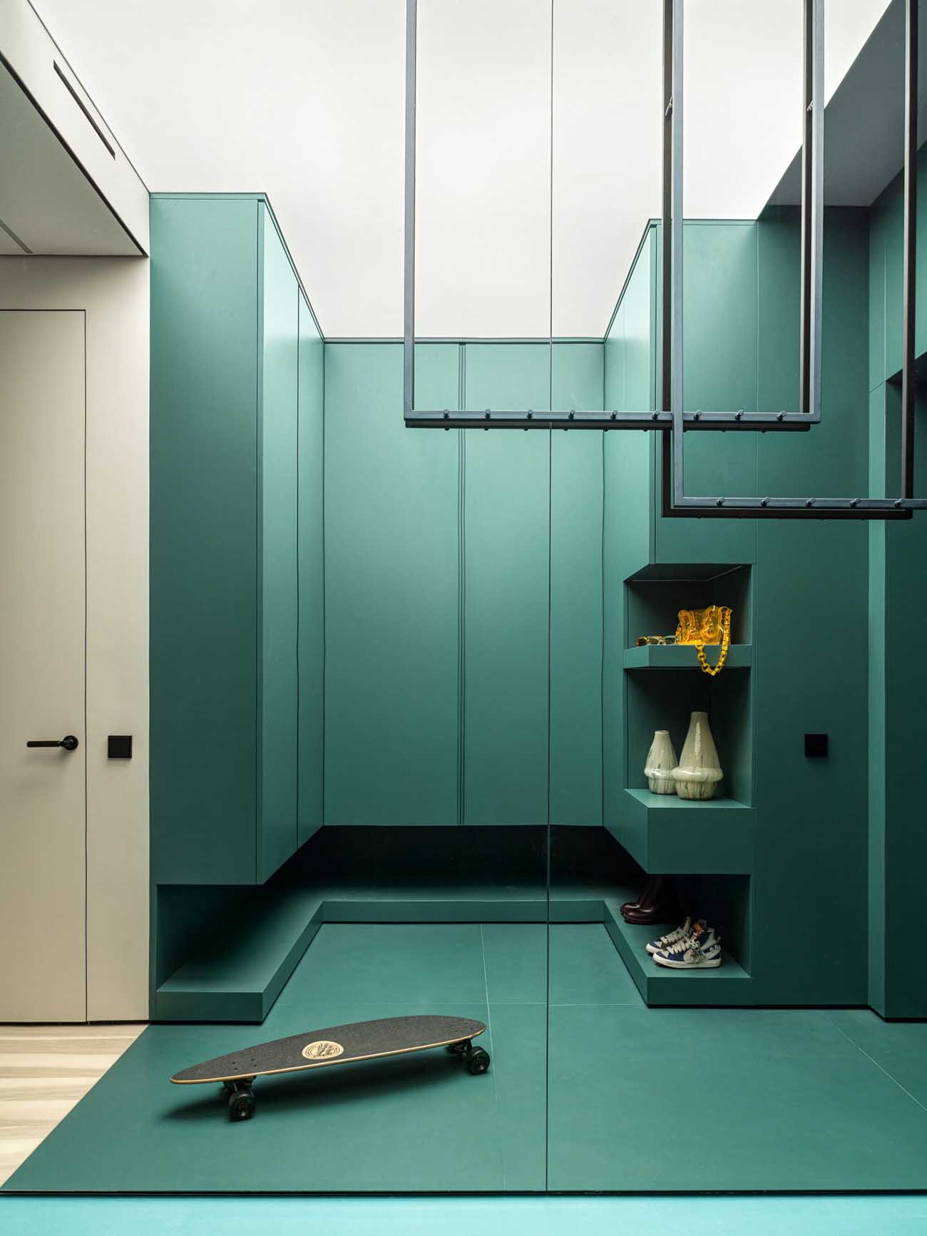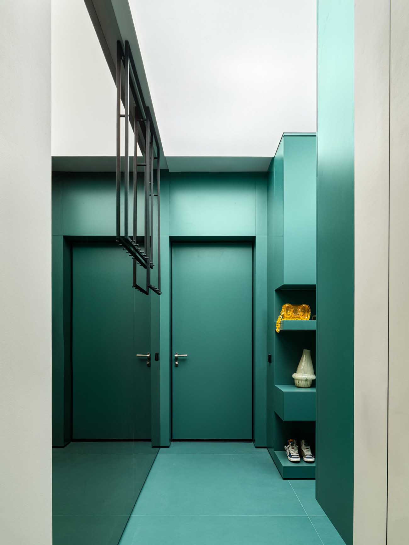 „Ha egyetlen kedvenc megoldást kellene választanom, az a vibráló zöld előszoba lenne. Belépve szinte egy másik dimenzióba csöppenünk; a nagyméretű tükör játéka miatt egy pillanatra elbizonytalanodunk, mi is a valóság” – meséli a tervező.