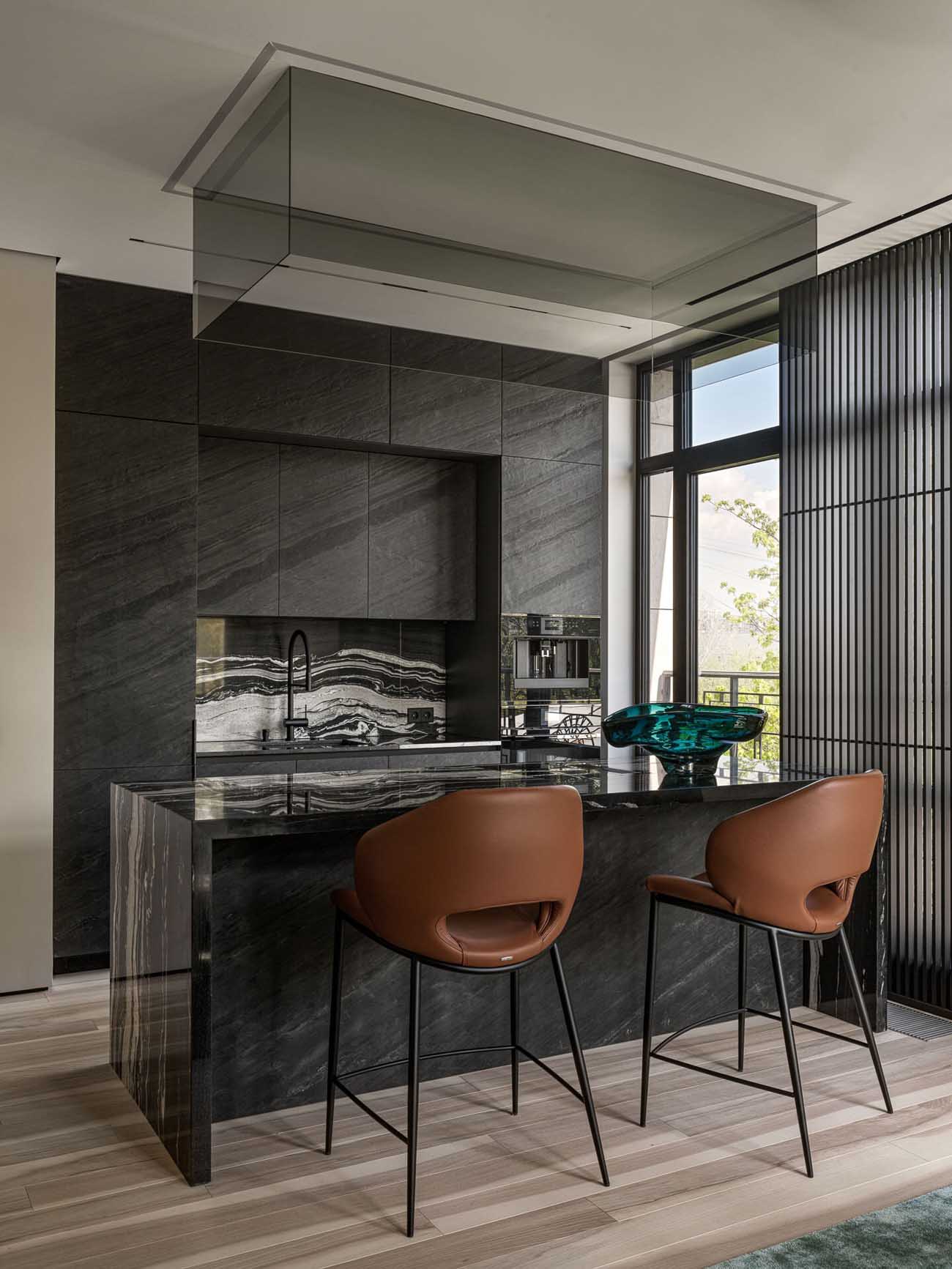 A tervező szerint a koncepció sikerét az anyaghasználat is garantálta: a világos kőris padló, a természetes travertin és gránit időtlen eleganciát sugároz. Ezt a hatást erősíti a szegélylécek tudatos elhagyása és a számos, gondosan elhelyezett színfolt. „Az érdekes technológiai részletek közül kiemelkedik a konyhasziget fölé tervezett, megvilágított üvegkocka. Ez egyszerre látja el a páraelszívó és a függőlámpák szerepét, de sokkal letisztultabb, nem vonja el a figyelmet és szervesen illeszkedik a belsőépítészeti koncepcióba.”