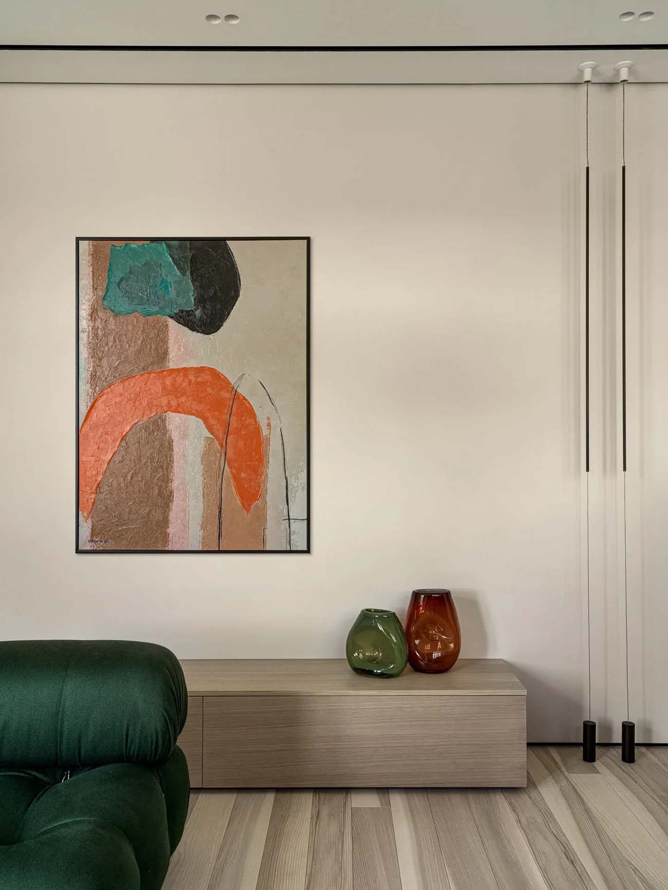 A hölgy kérése a lakberendező felé egyértelmű volt: karakteres, színekben gazdag enteriőr, amiben megjelennek a kedvencei is, a bíbor és a zöld. A tervező bátran nyúlt ezekhez az árnyalatokhoz a hangsúlyos elemeknél, ami határozott, grafikus jelleget kölcsönzött a modern stílusban berendezett tereknek.