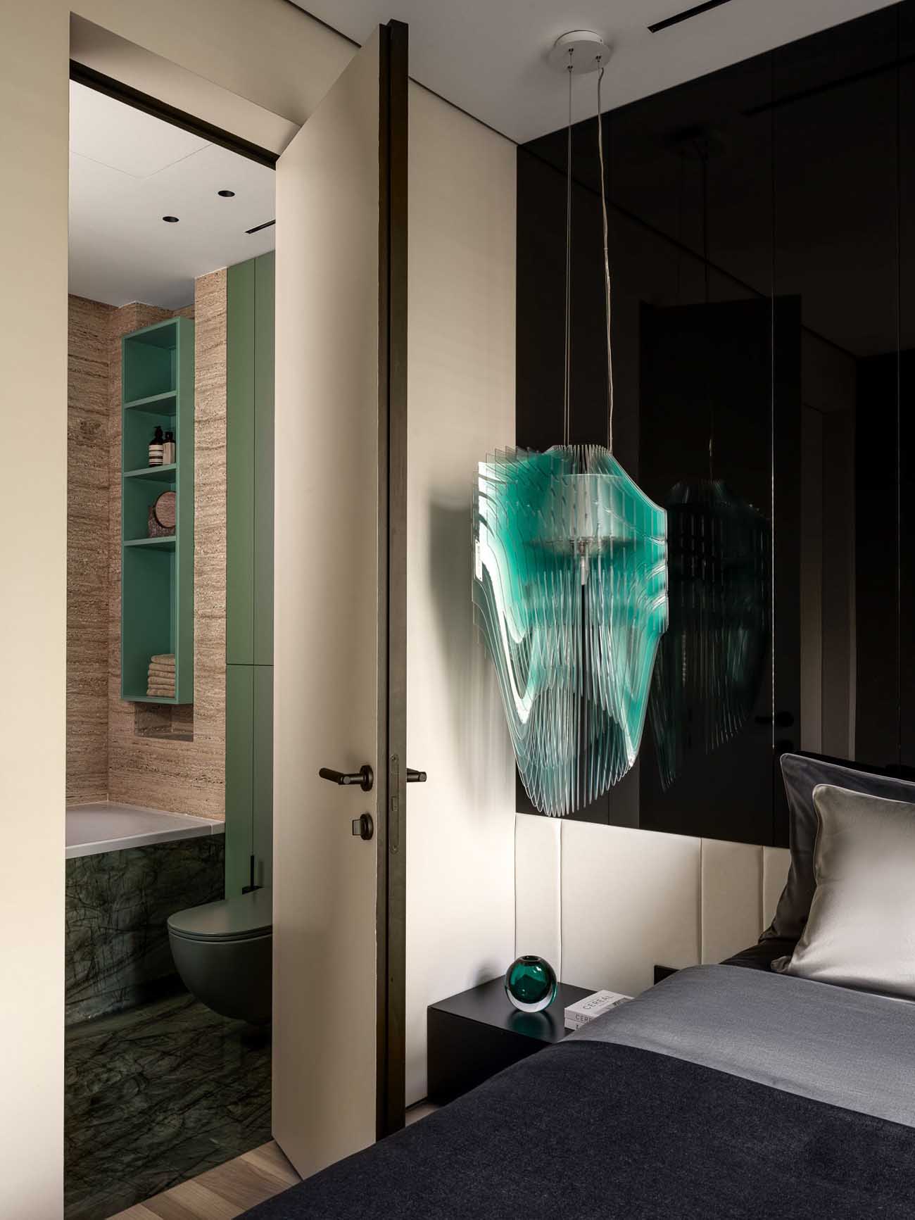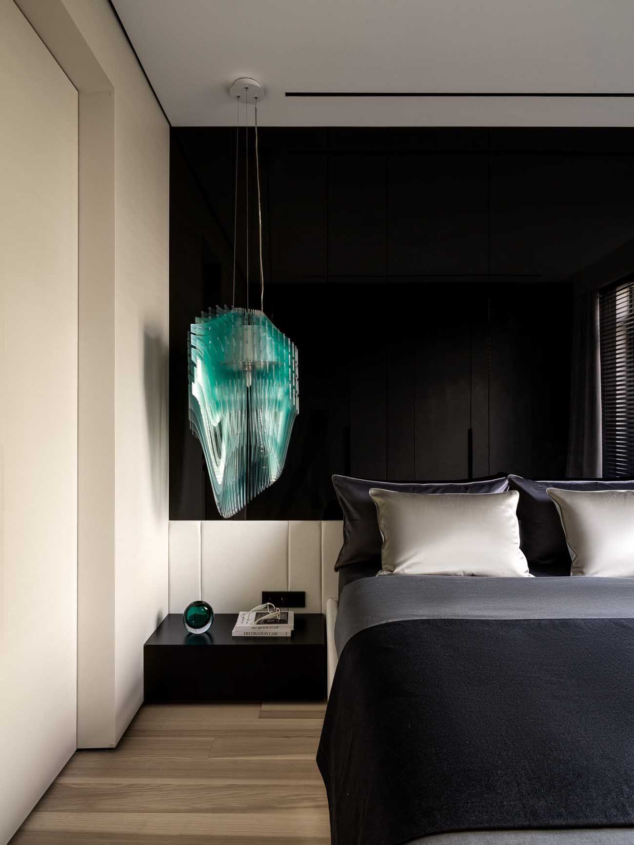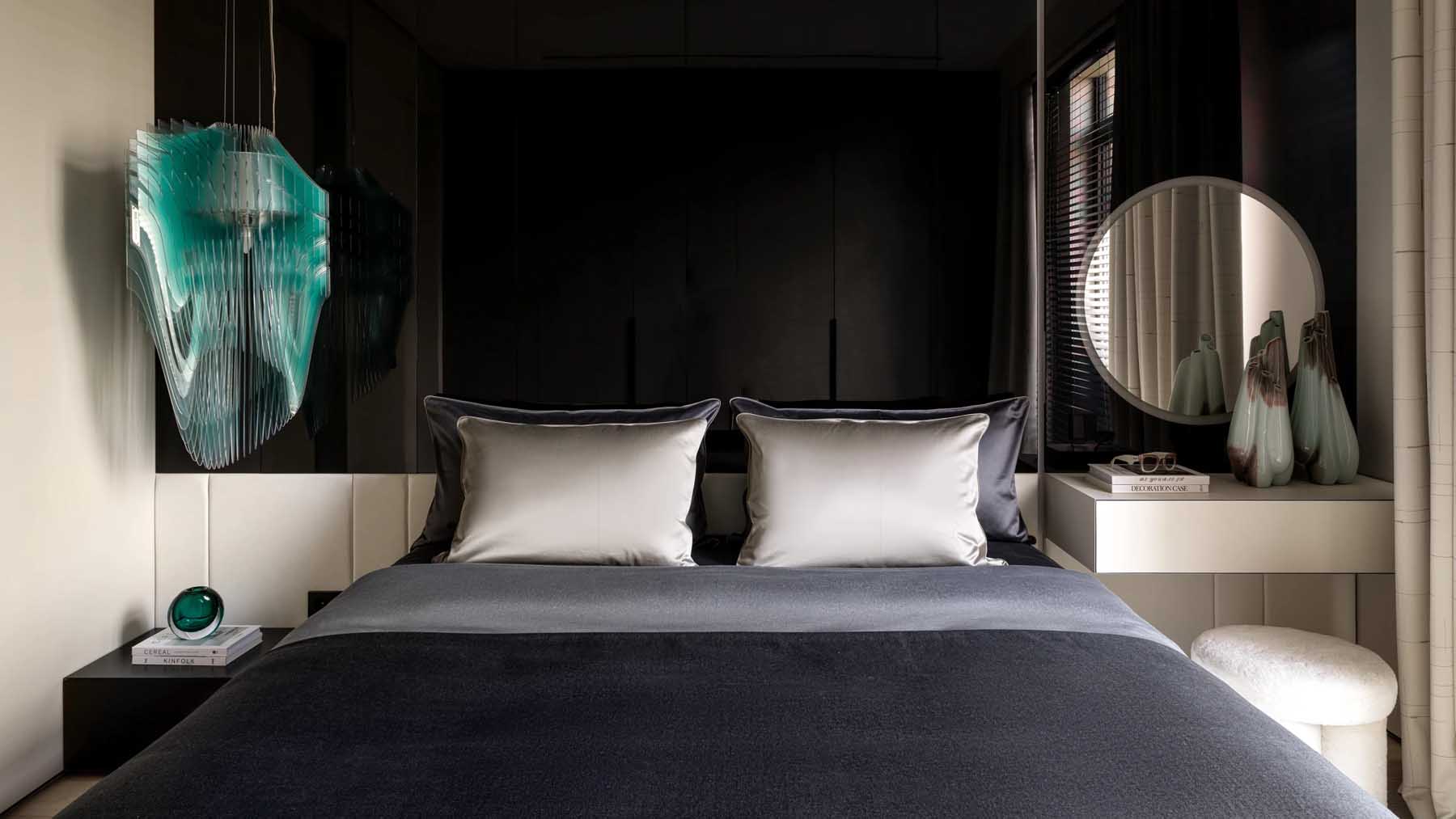A hálószoba az intim elegancia jegyében született – az ágy mögött a falon megjelenő sötét, fényes felület mélységet ad a térnek, és sejtelmesen tükrözi vissza a fényt. Ezt a drámai hatást oldja a világos ágy a puha textíliákkal és az ággyal szemben a gardróbszekrény a letisztult, szövethatású frontokkal. A szoba éke egyértelműen az ágy melletti, türkiz rétegekből álló, szoborszerű függeszték, amely egyedi karaktert kölcsönöz a helyiségnek.