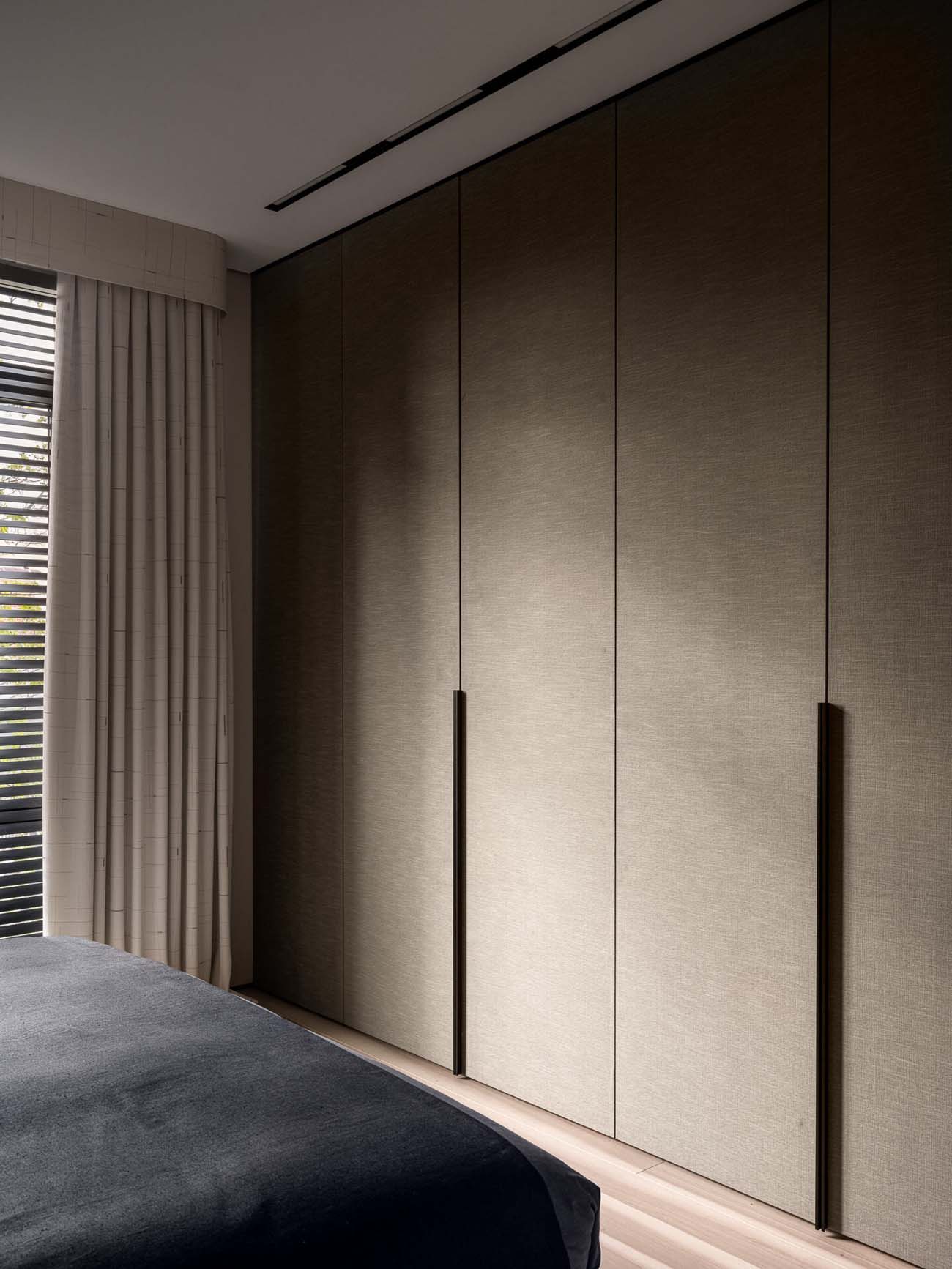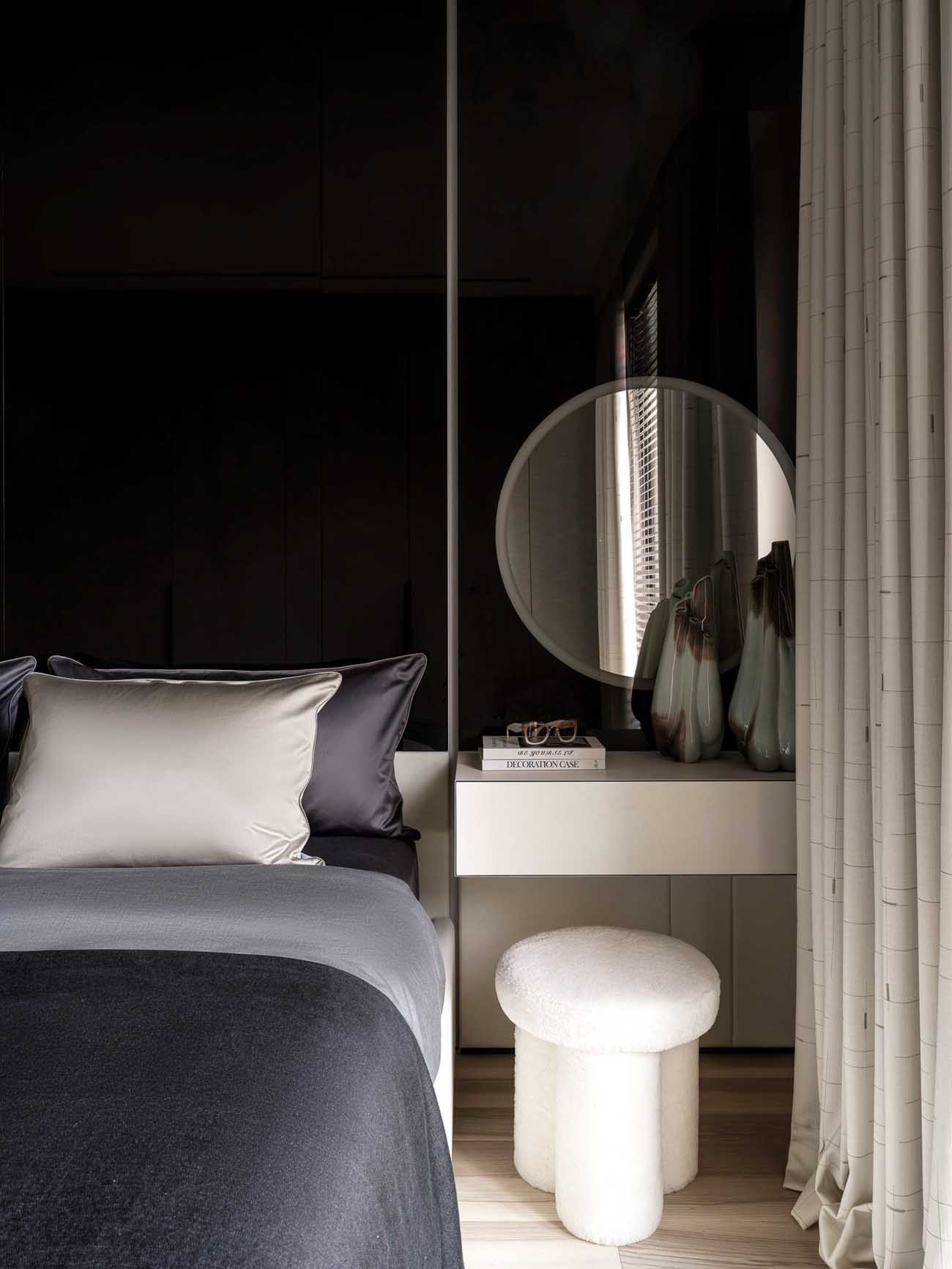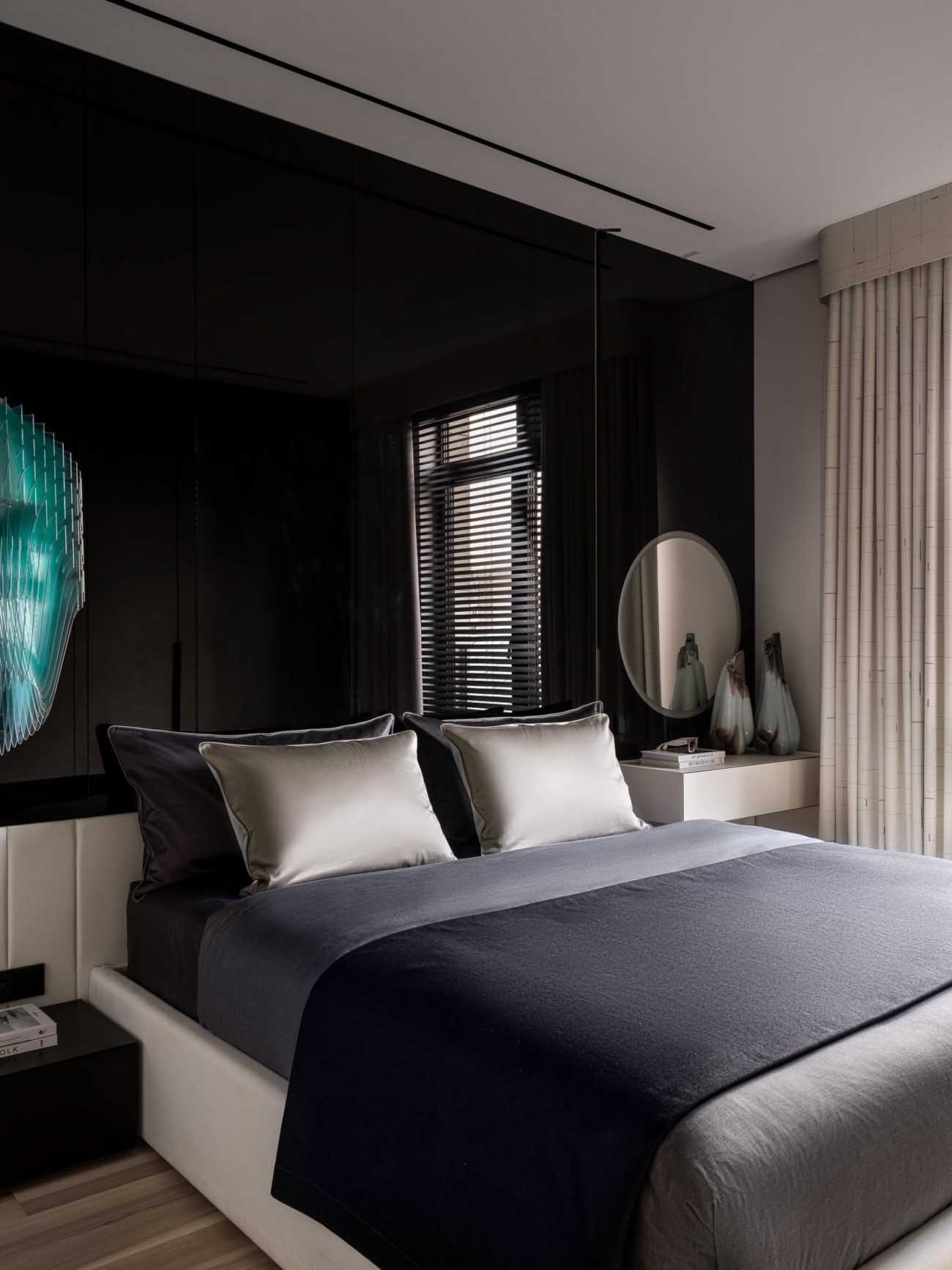 A hálószoba az intim elegancia jegyében született – az ágy mögött a falon megjelenő sötét, fényes felület mélységet ad a térnek, és sejtelmesen tükrözi vissza a fényt. Ezt a drámai hatást oldja a világos ágy a puha textíliákkal és az ággyal szemben a gardróbszekrény a letisztult, szövethatású frontokkal. A szoba éke egyértelműen az ágy melletti, türkiz rétegekből álló, szoborszerű függeszték, amely egyedi karaktert kölcsönöz a helyiségnek.