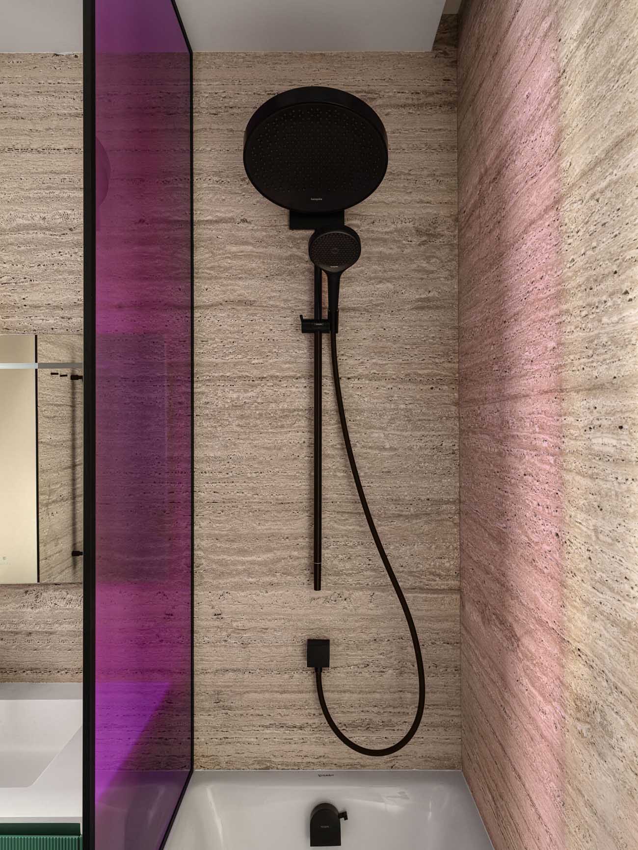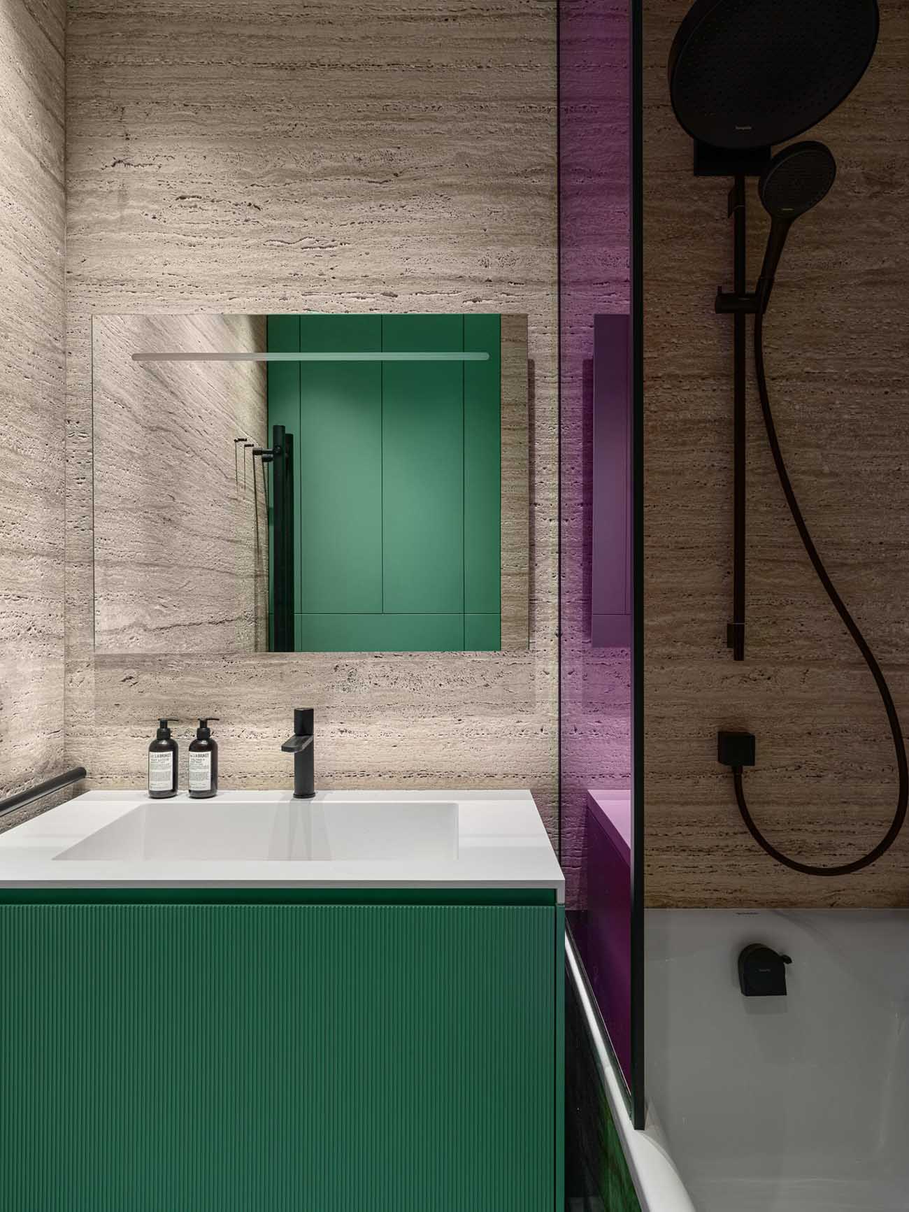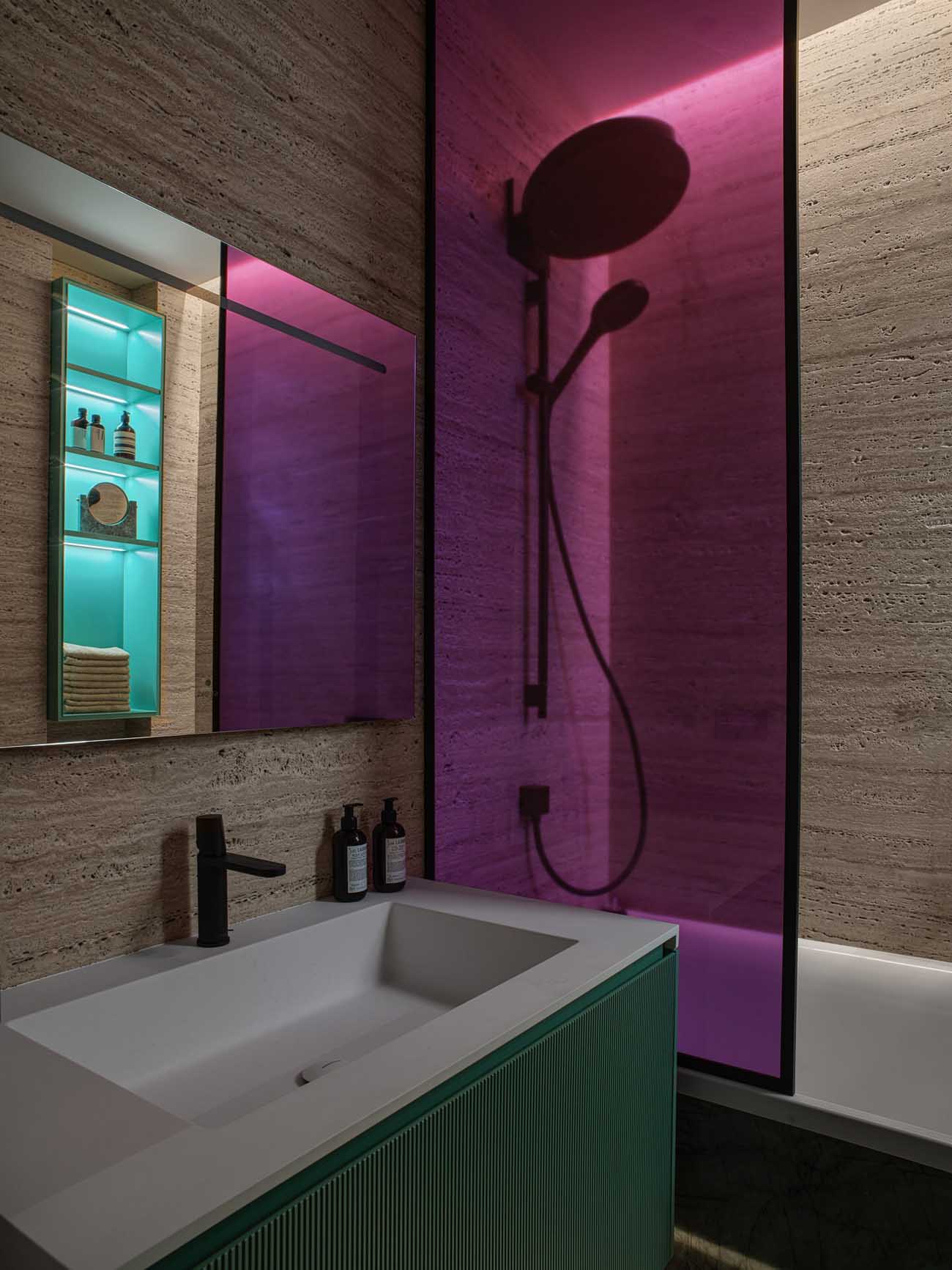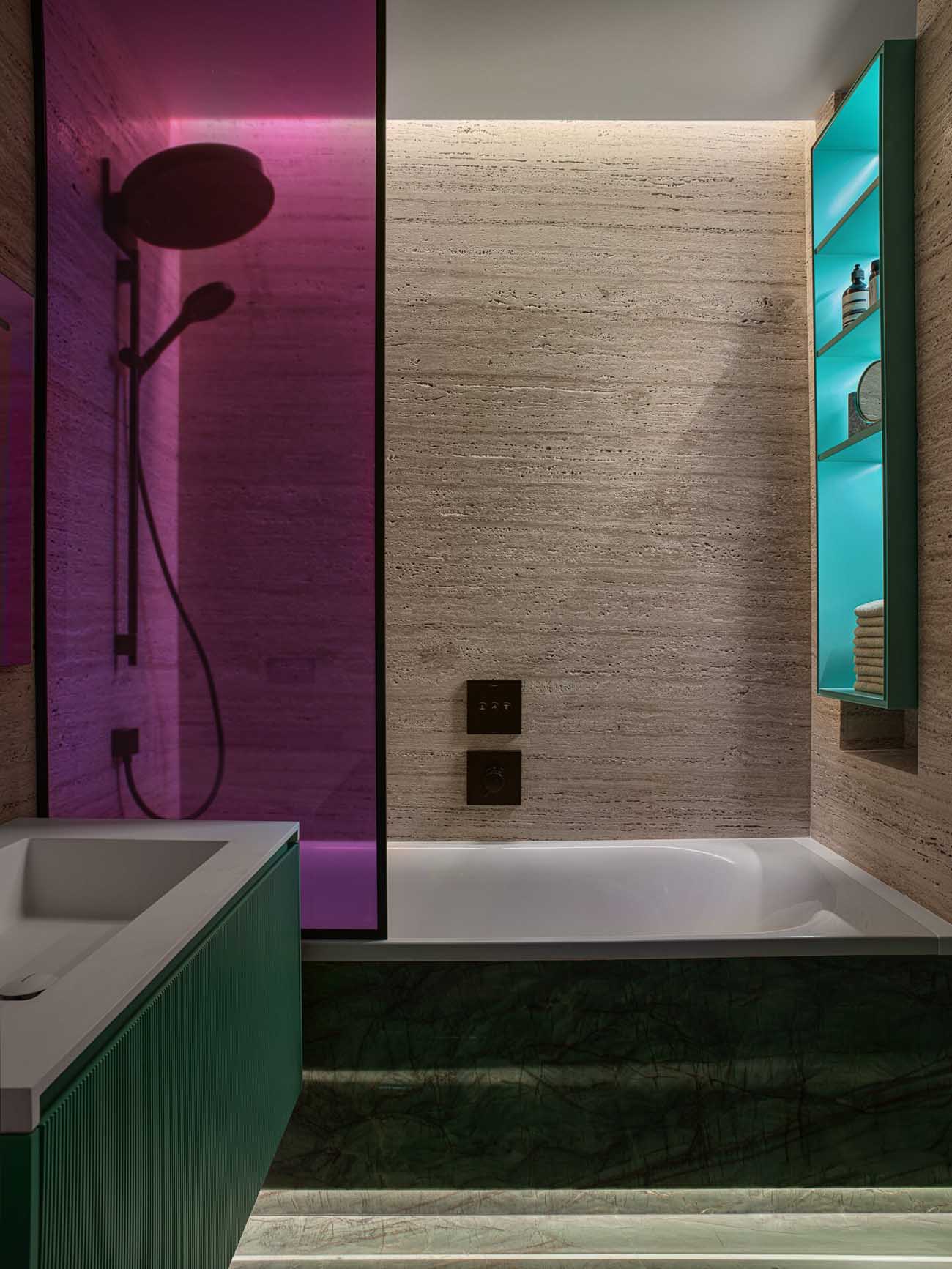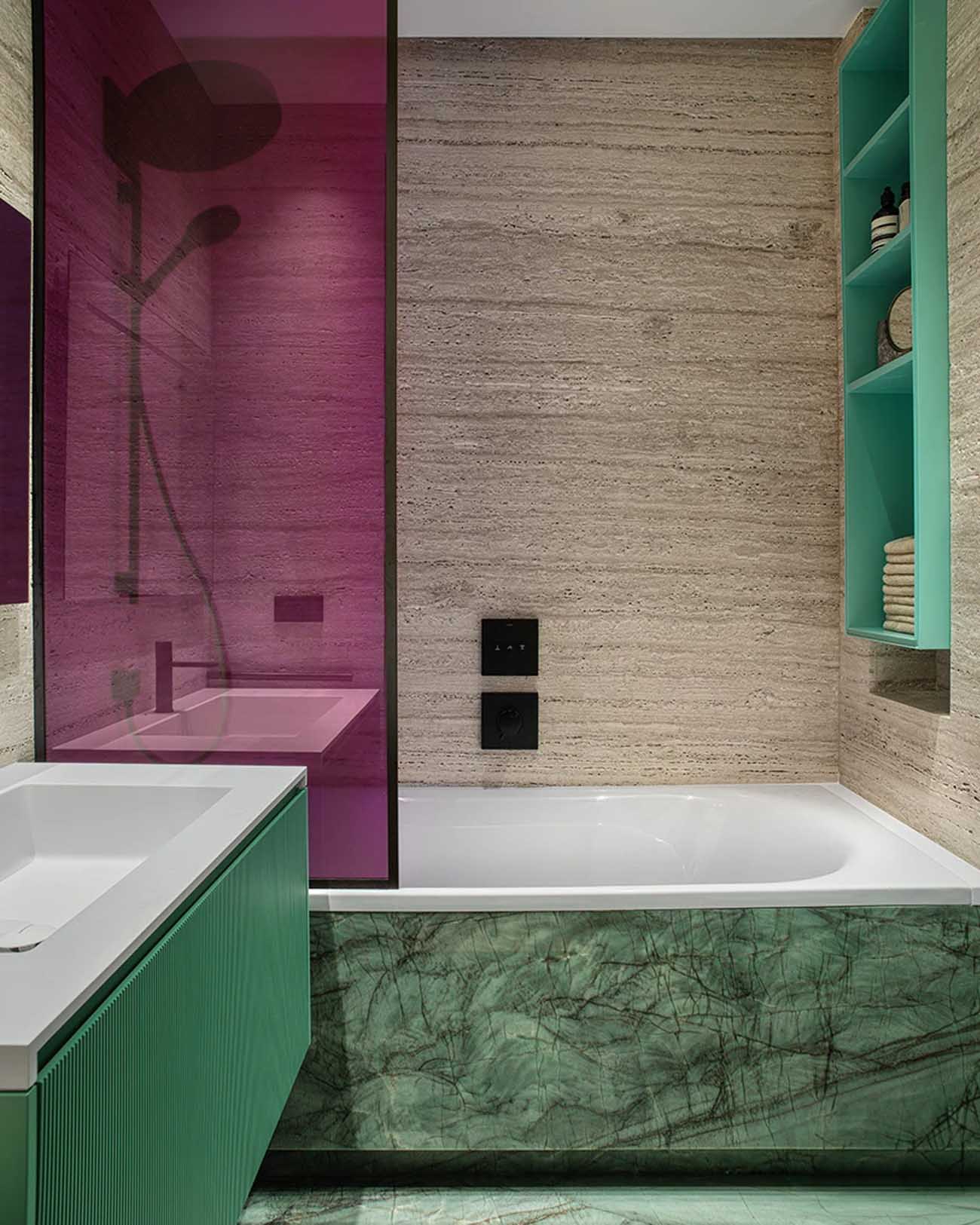 A fürdőszoba a lakás talán legmerészebb pontja, ahol a természetes és az élénk színek látványos kombinációját alkalmazta a tervező. A falakat borító meleg tónusú travertint a padlón és a kád oldalán futó, karakteres zöld márvány ellenpontozza. A vibrálást a magenta színű üveg zuhanypanel és a türkiz, bordázott felületű mosdószekrény fokozza, utóbbi visszaköszön a beépített, hangulatvilágítással ellátott polcokon is. A fekete szaniterek modern keretet adnak a vibráló kompozíciónak.