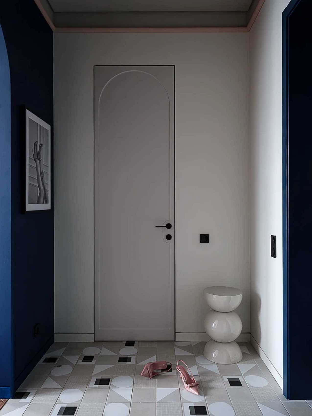 Az előszobában a padlót díszítő geometrikus mintázatú hidegburkolat nemcsak praktikus választás, de vizuálisan is kijelöli a bejárati zónát. A tárolást itt egy rejtett gardrób biztosítja, így a tér rendezett marad. A falakat festhető tapéta borítja, amely a letisztult festett felület látszatát kelti, miközben rugalmasságával kivédi az új építésű házak természetes mozgásából eredő hajszálrepedéseket. A közlekedő egyik falát egy különleges fotó díszíti, amely a tulajdonos kedvenc cipőit ábrázolja – ez a személyes érintés nemcsak üdvözlő gesztus, hanem finom utalás a nagyvárosi eleganciára és az önkifejezés szabadságára. Az esti érkezést a padlószint felett futó, rejtett hangulatvilágítás teszi biztonságossá és barátságossá, amely végigvezeti a lakót egészen a hálóig.