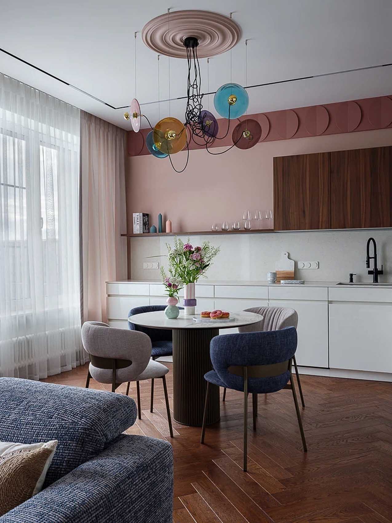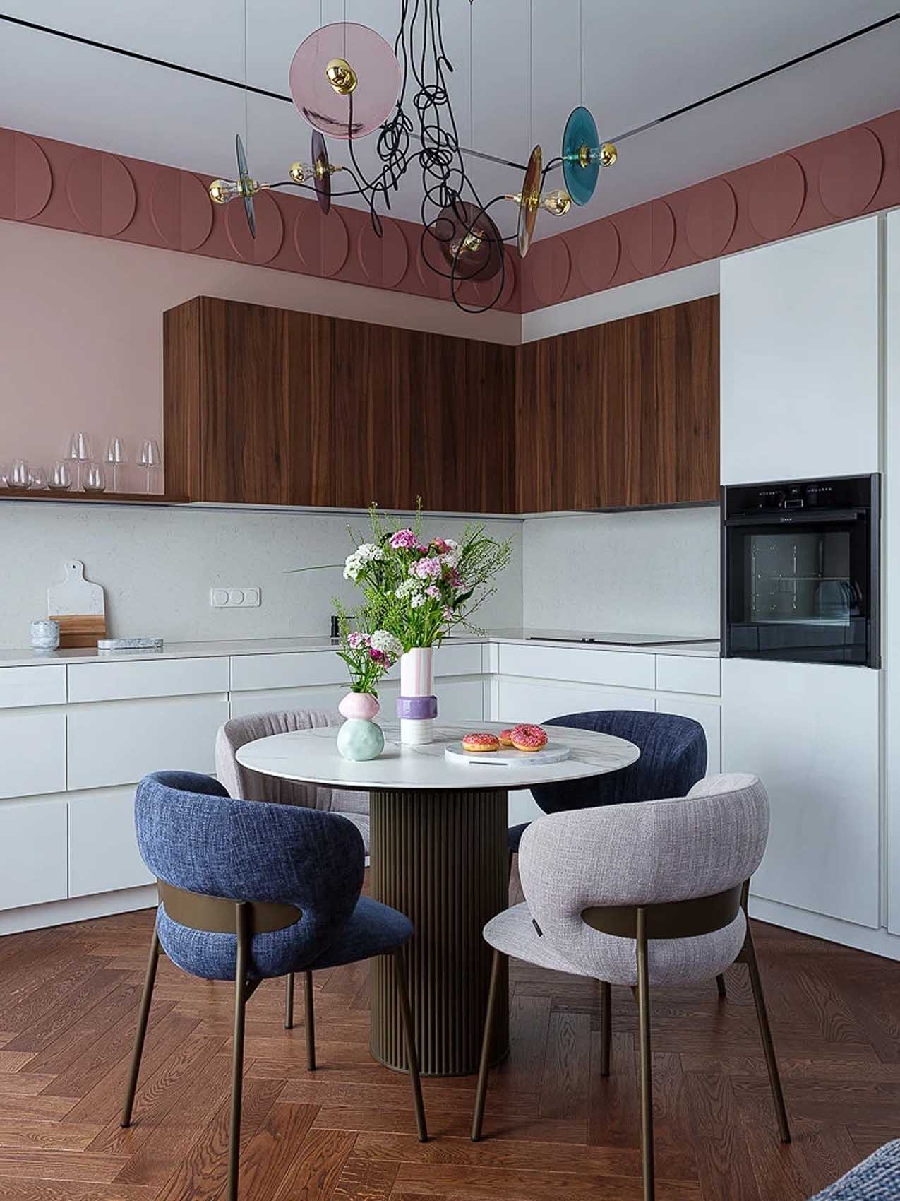 A közösségi tér központja a konyha, amely a hölgy – aki profi cukrász – minden igényét kielégíti. A tervezésnél a funkcionalitás volt az elsődleges: a kevesebb felső szekrényt hatalmas, mennyezetig érő tárolók egészítik ki, amelyekben minden modern konyhatechnológiai eszköz helyet kapott, sőt, még a mosógép is itt rejtőzik el. Az eleganciát a pasztell rózsaszín díszlécek és a fal mentén futó stukkók adják, amelyek lágyítják a technikai felszereltség szigorát.