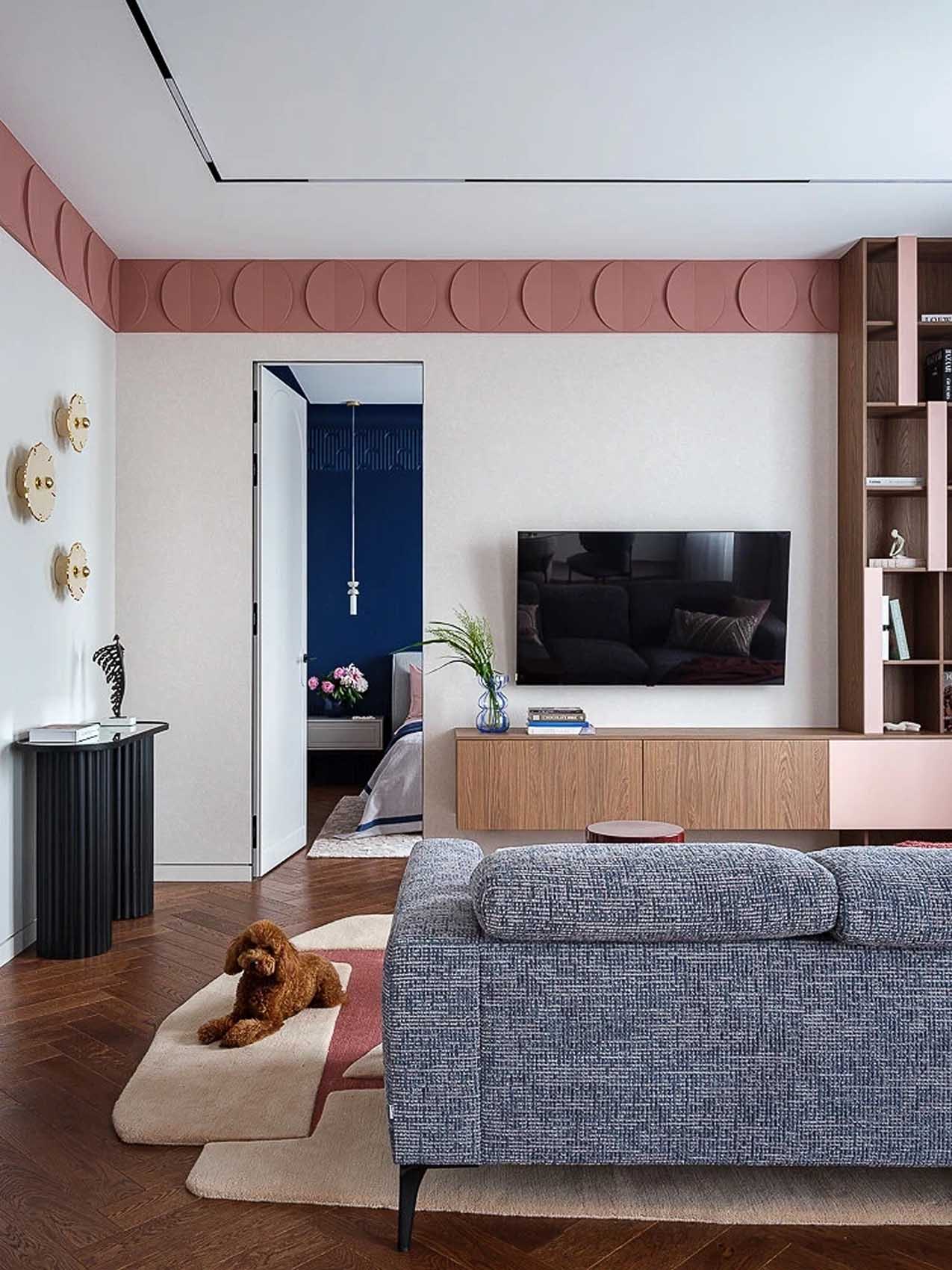 A nappali zónát egy hátával a konyha felé fordított, kényelmes kanapé határolja el, természetes térelválasztóként működve. A padlón végigfutó, meleg tónusú parketta vizuálisan összeköti a helyiségeket, miközben a tévé falon megjelenő textilhatású tapéta intimitást sugall. A tárolásról itt egy lebegő médiabútor és nyitott könyvespolcok gondoskodnak, amelyeken a tulajdonos kedvenc dekorációi kapnak helyet. Az étkezőasztal feletti hangsúlyos csillár és a kiegészítő fali karok különböző világítási forgatókönyveket tesznek lehetővé, a baráti vacsoráktól kezdve a csendes olvasásig.