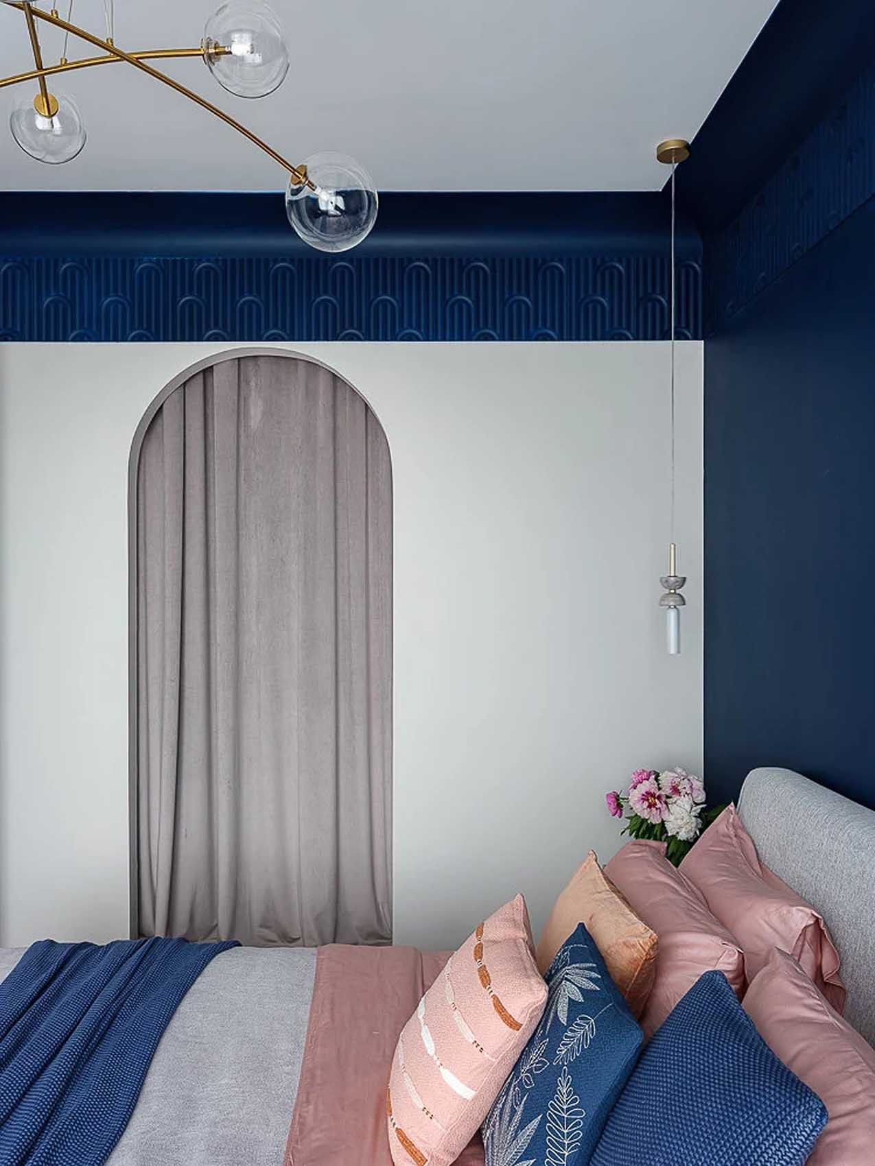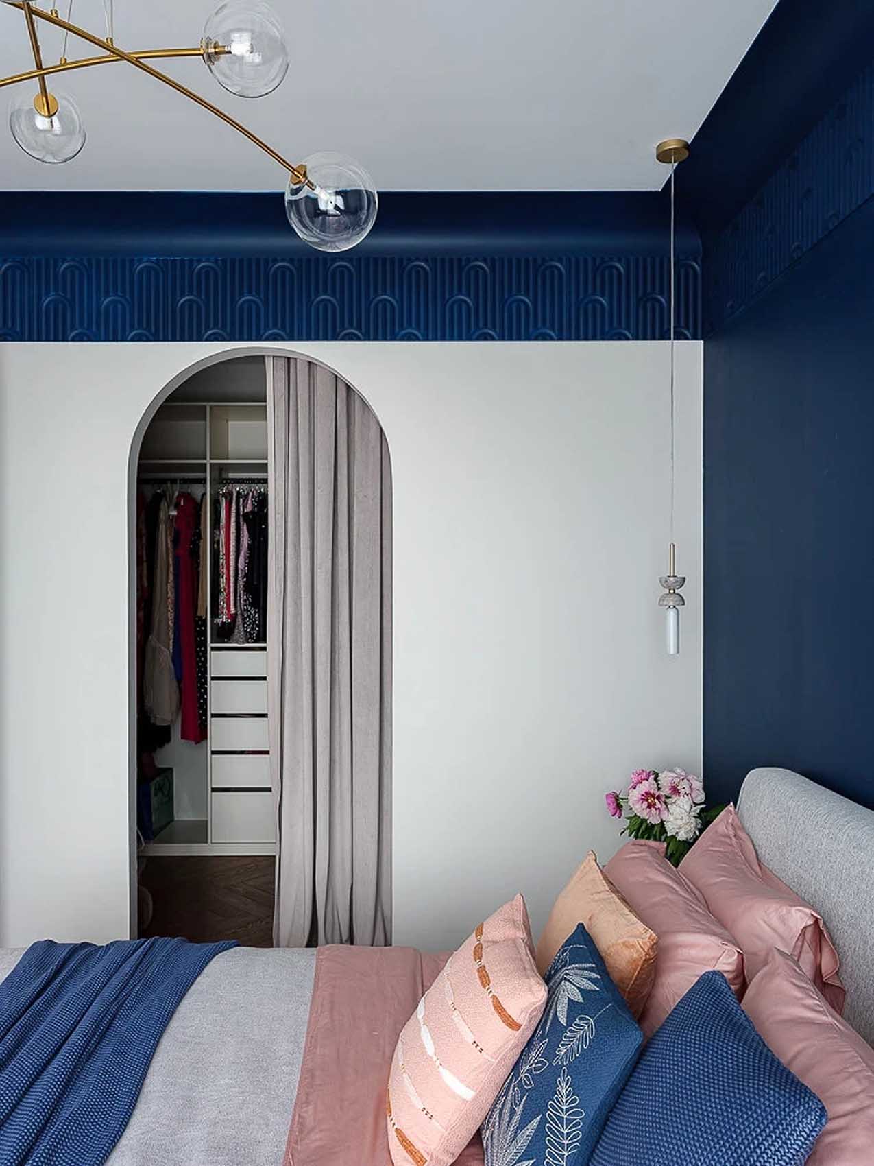 A hálószoba a lakás legkarakteresebb pontja, ahol a tulajdonos régi álma valósult meg: a falak egy része mély királykék színt kapott. Az ágy fejtámlája mögötti falat textil textúrájú tapéta és a fallal azonos színűre festett díszpanelek teszik különlegessé. A berendezés szándékosan puritán: csak a pihenést szolgáló ágy, az éjjeliszekrények és egy kényelmes fotel kapott helyet, minden ruhát és személyes tárgyat a szomszédos gardróbszobába költöztettek. Ebben a különálló gardróbban egy speciális, forgatható cipőtároló rendszer kapott helyet, amely méltó módon rendezi a tulajdonos cipőkollekcióját. A hálószoba puha textíliái és a mennyezetről lógó, kecses függesztékek a kuckós hangulatot erősítik, ahol a sötét tónusok nem összenyomják, hanem körülölelik a teret.