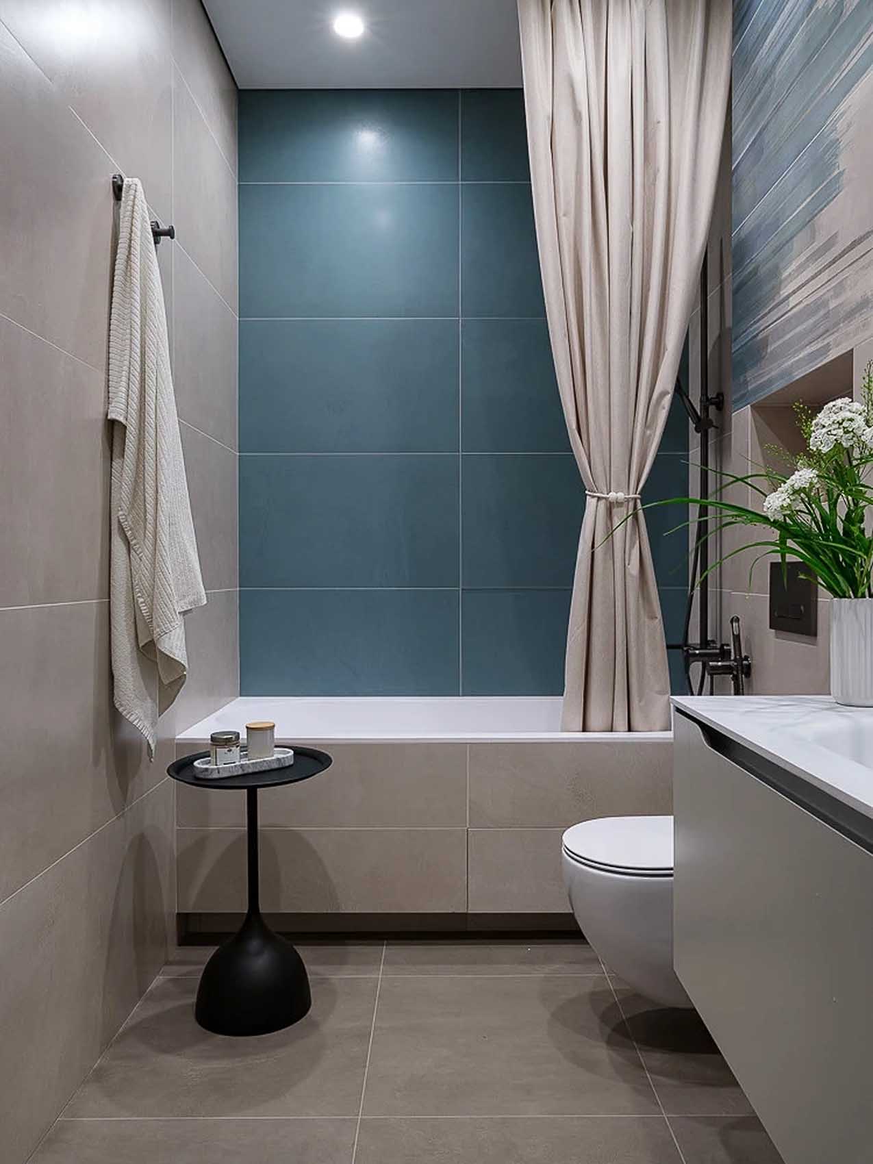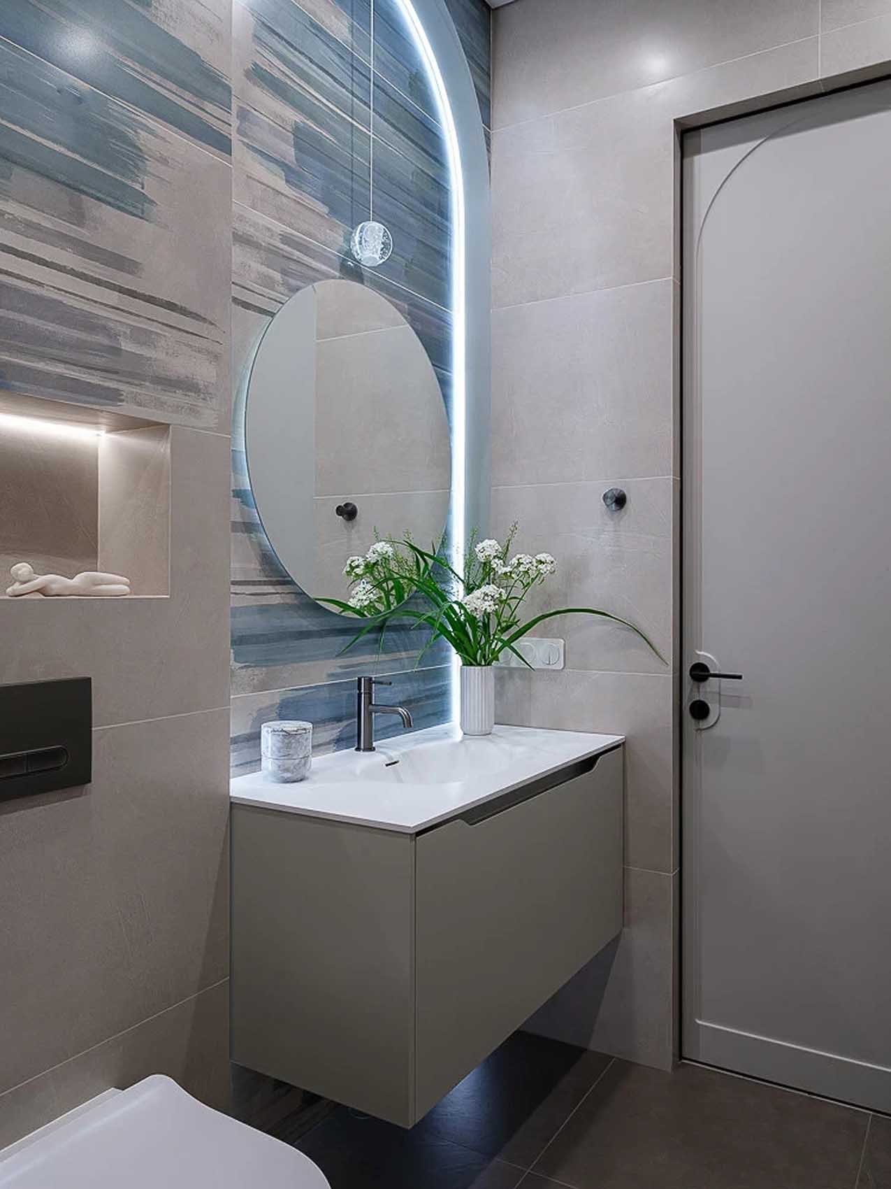 A fürdőszobában a türkiz és a bézs árnyalatok kombinációja teremt időtlen, mégis izgalmas hangulatot. A lakás egészén végigvonuló íves formavilág itt is visszaköszön: a falba süllyesztett, megvilágított dekoratív fülke és a tükör körüli lámpák is ezt a lágy vonalvezetést követik. A mosdó alatti egyedi tervezésű szekrény és a vécé feletti rejtett polcrendszer biztosítja, hogy minden piperetárgynak legyen helye, így a tér megőrzi tiszta, wellness-szerű jellegét.