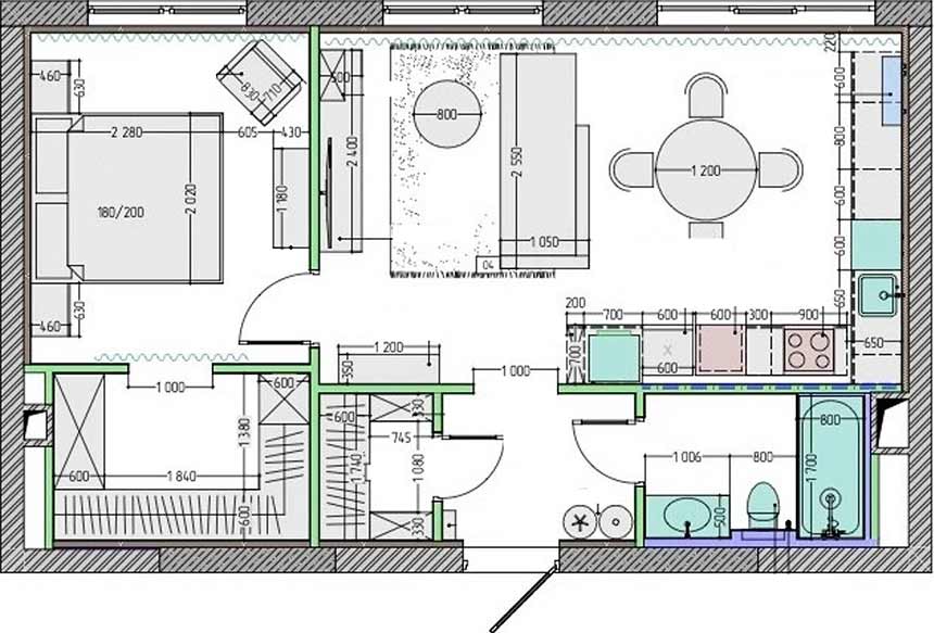 Az átalakítás során a konyha és a nappali egyesült, szellős és világos egységet alkotva. A korábbi két fürdőszoba közül az egyiket beáldozták a tárolás oltárán: ezt a területet a közlekedő folyosóból elvett részekkel növelve egy tágas gardróbszobává alakították, amely közvetlenül a hálószobából nyílik. A másik fürdőt az előszoba rovására bővítették, hogy kényelmesebb és látványosabb legyen. A hálószoba bejárata is új helyre került, így a nappali felől közelíthető meg, ami logikusabbá és kényelmesebbé tette az útvonalakat.