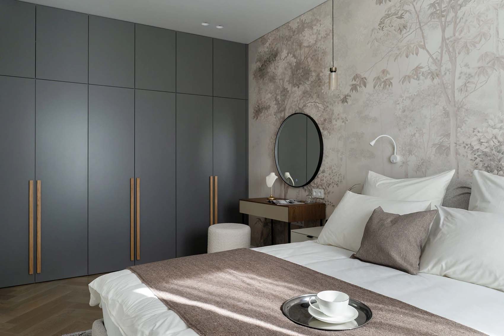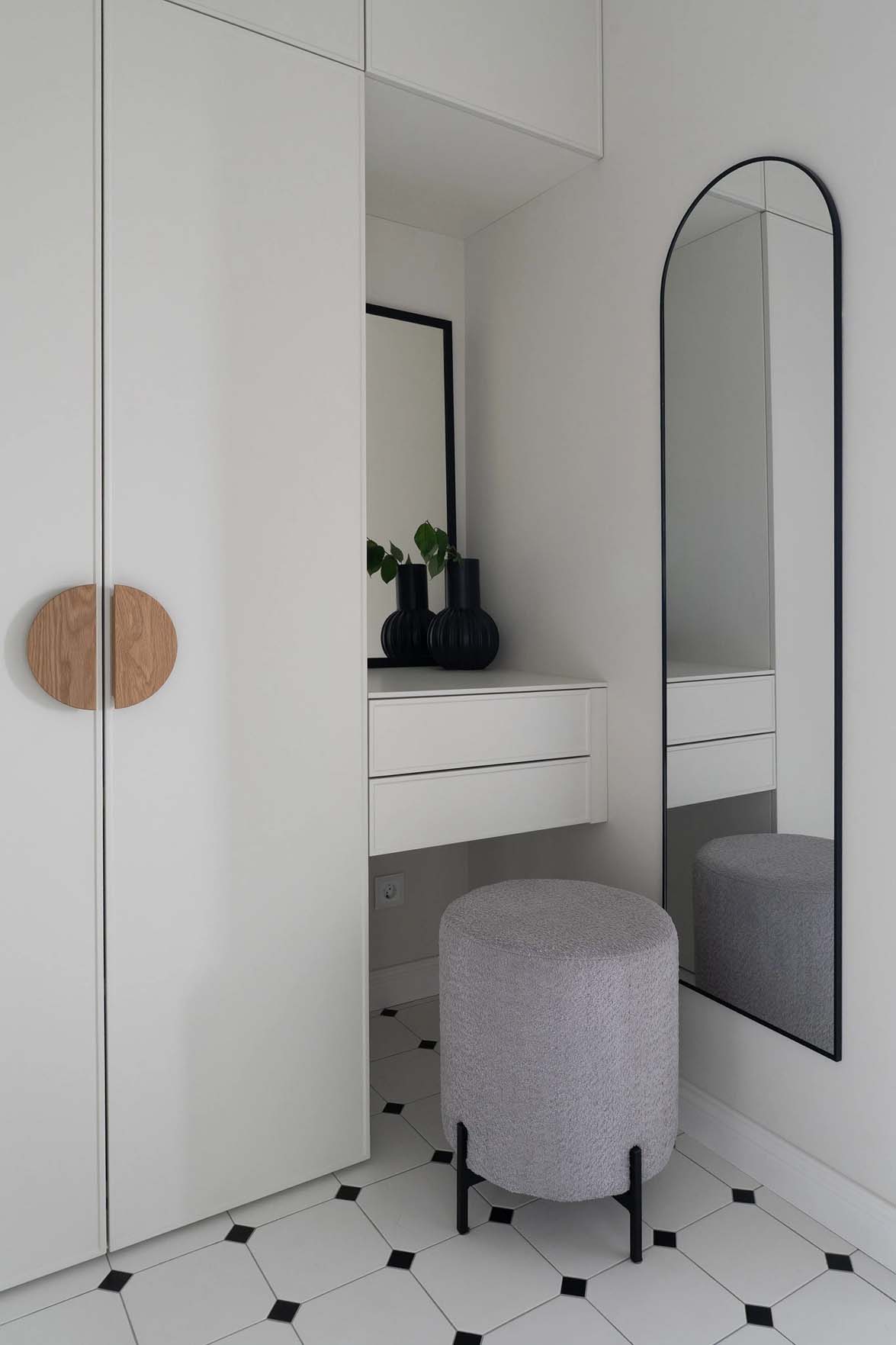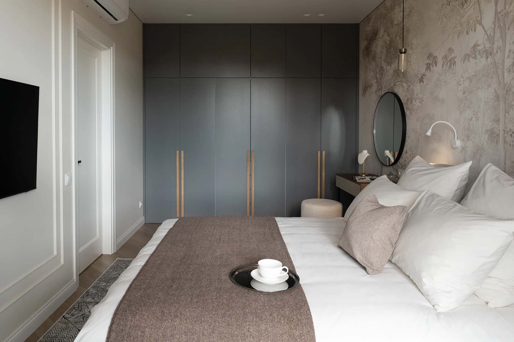 A ruhák tárolása elsősorban a hálószobában történik – itt egy, a fal teljes hosszában végigfutó beépített szekrény kapott helyet. Az ágy és a két éjjeliszekrény mellett egy fésülködőasztal is elfért a szobában.
