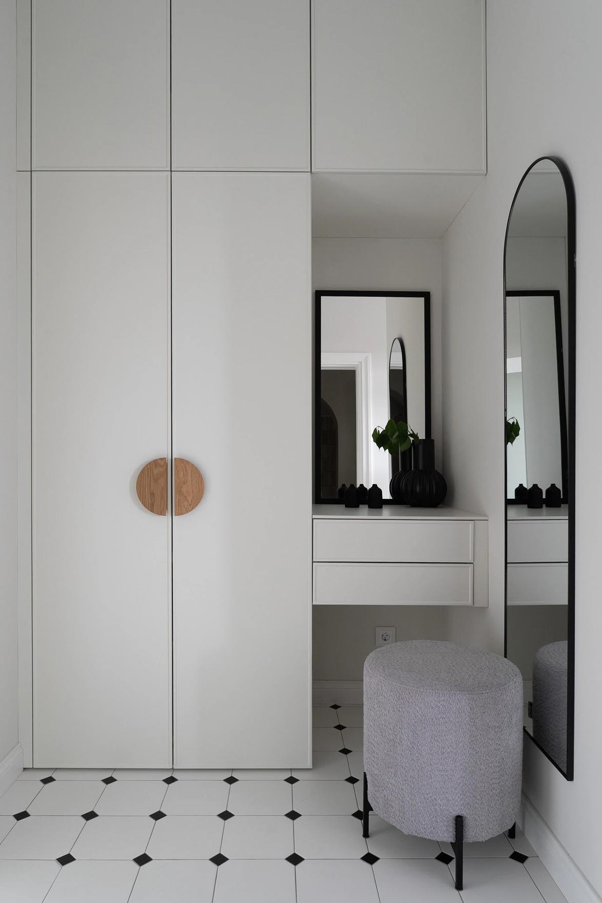 Az előszobában egy meglévő falfülkébe került a ruháknak szánt szekrény egy lebegő konzollal, amely alatt helyet biztosítottak a robotporszívó töltőállomásának is.