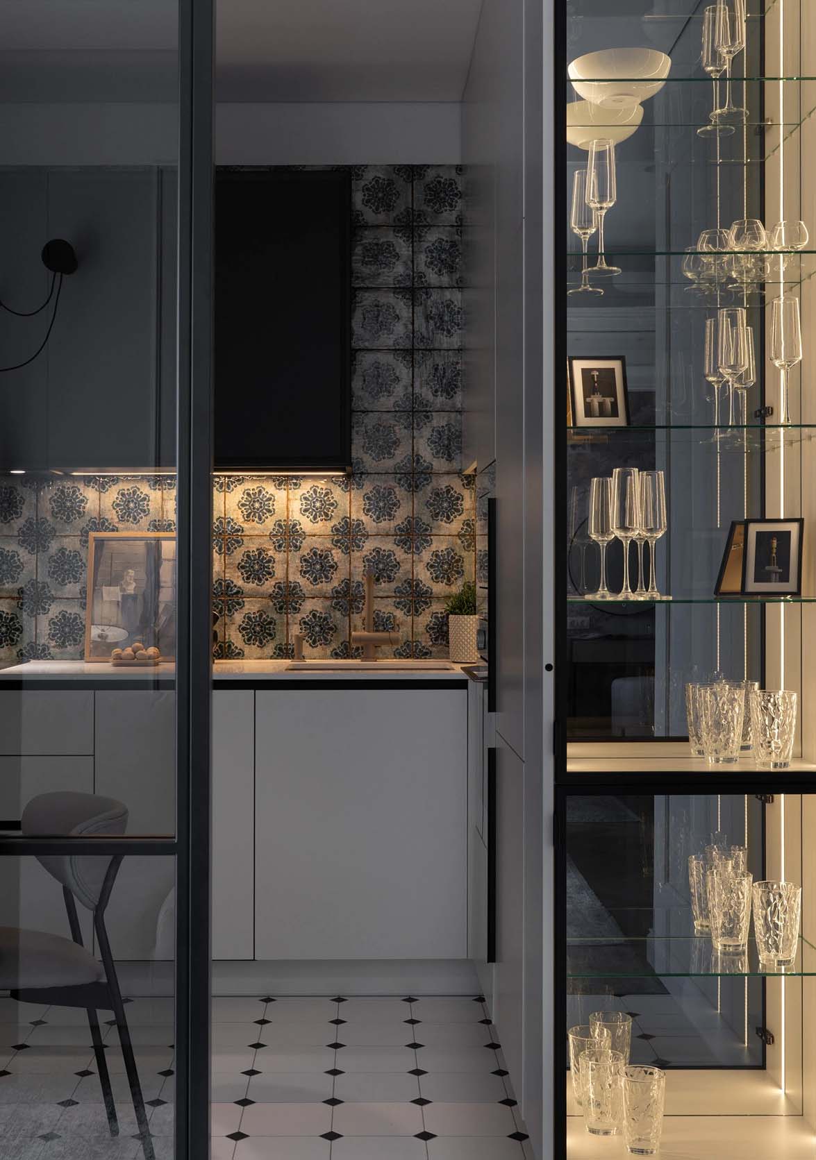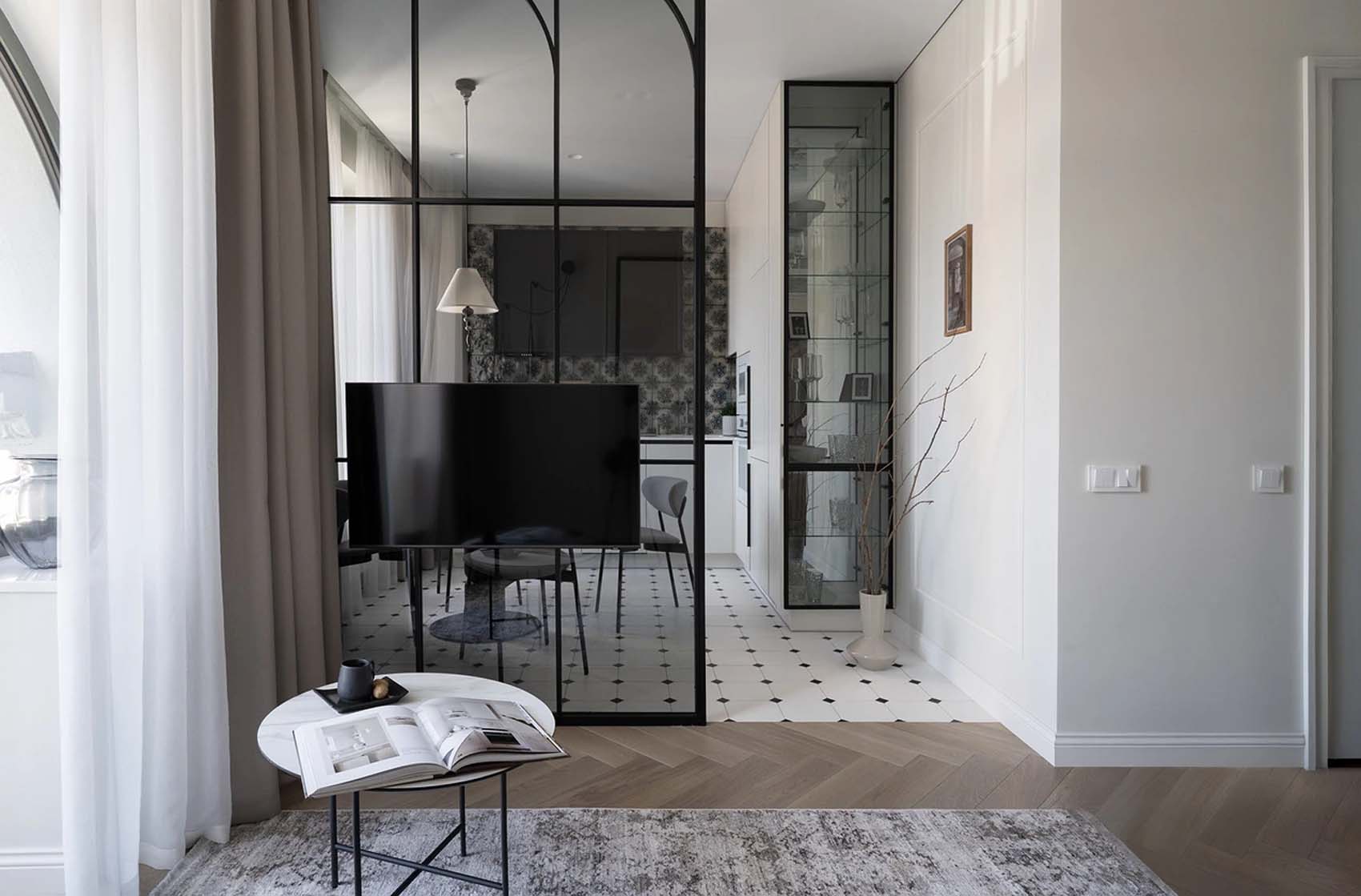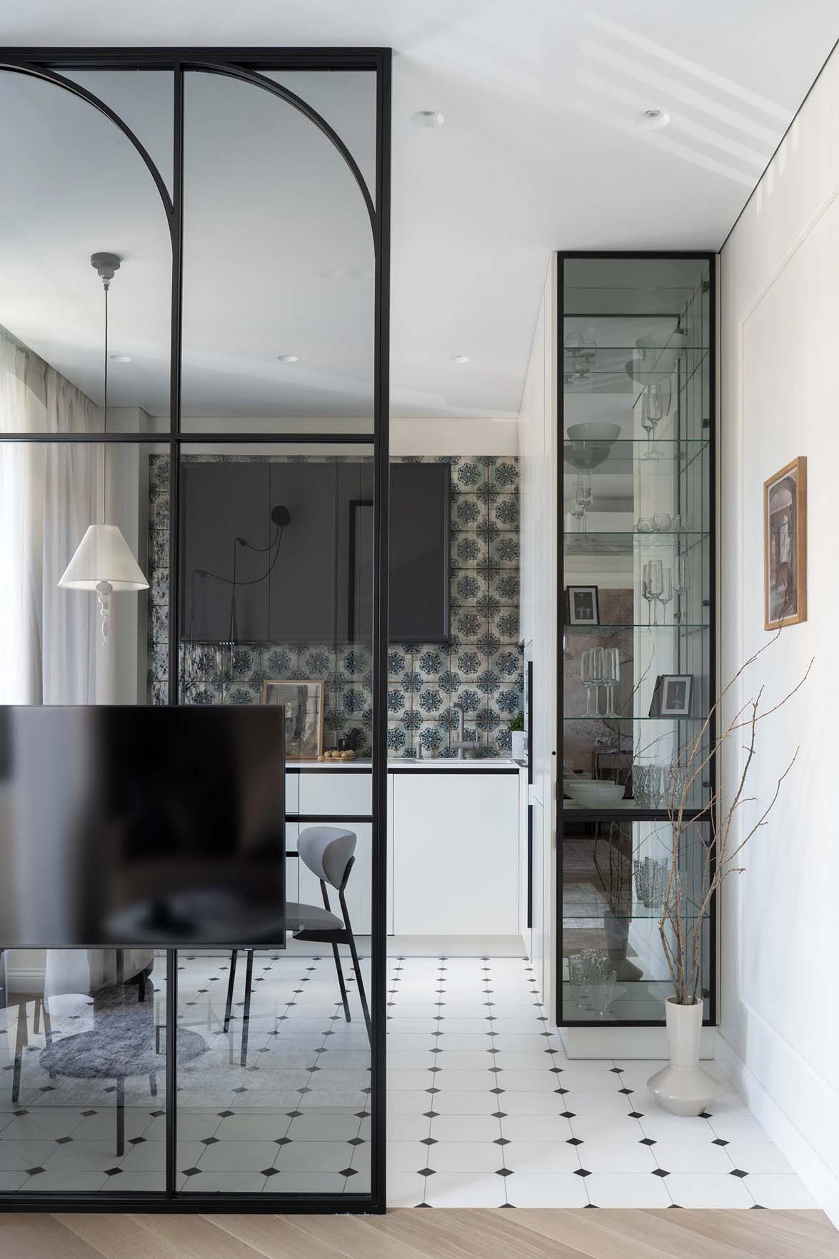 A lakás eredeti elrendezésén nem változtattak, csak az egy helyiségben lévő konyha és nappali zónák közé építettek be egy üveg térelválasztó elemet.