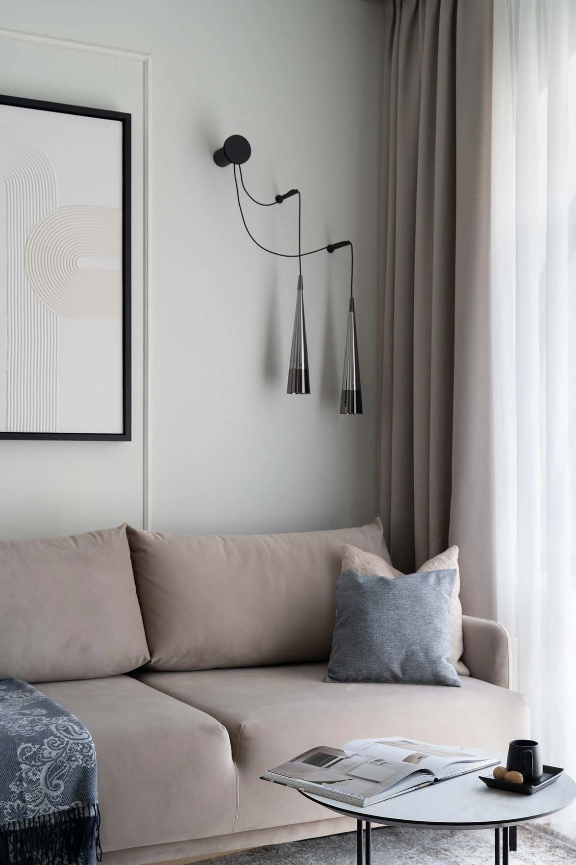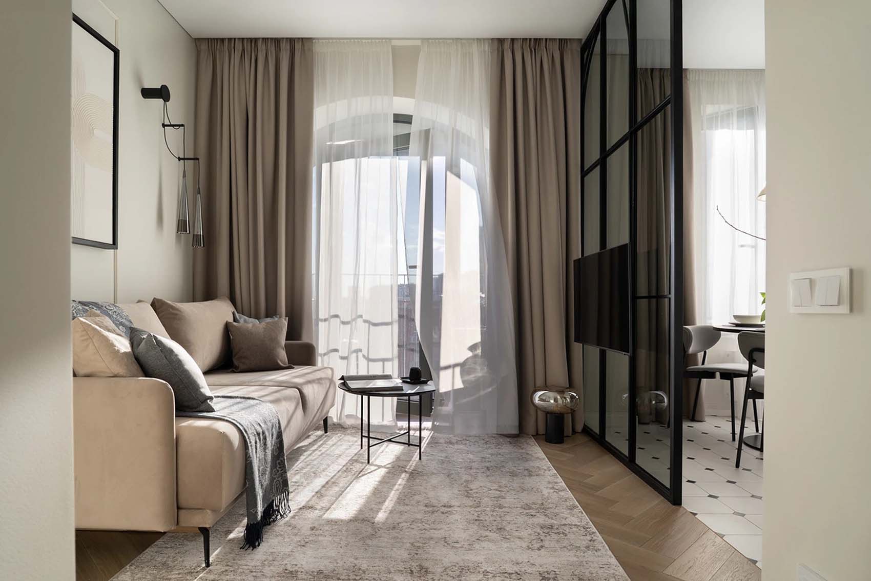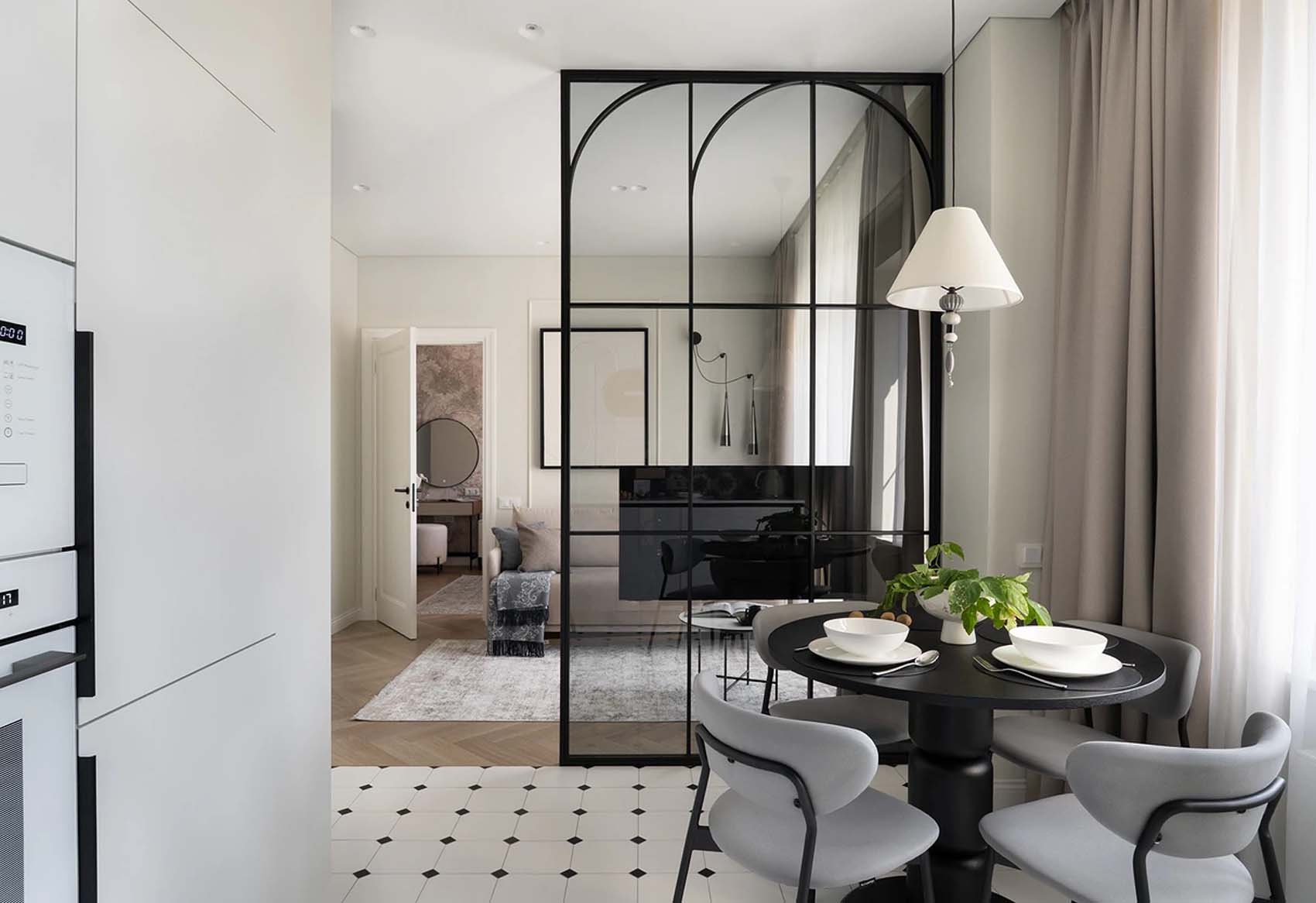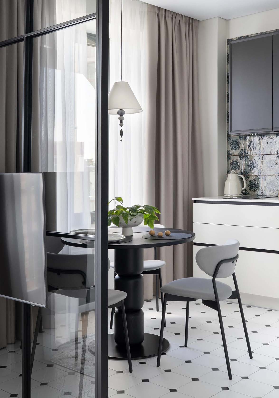A lakás eredeti elrendezésén nem változtattak, csak az egy helyiségben lévő konyha és nappali zónák közé építettek be egy üveg térelválasztó elemet.