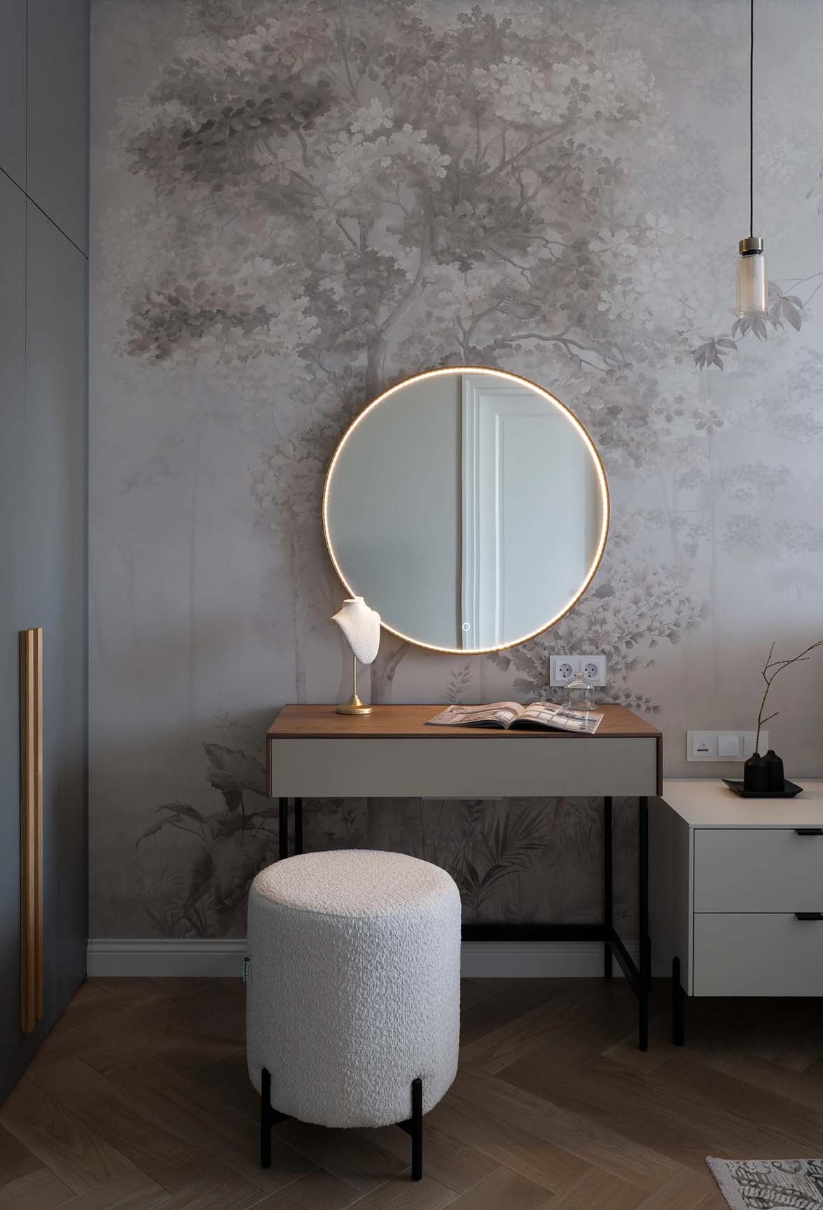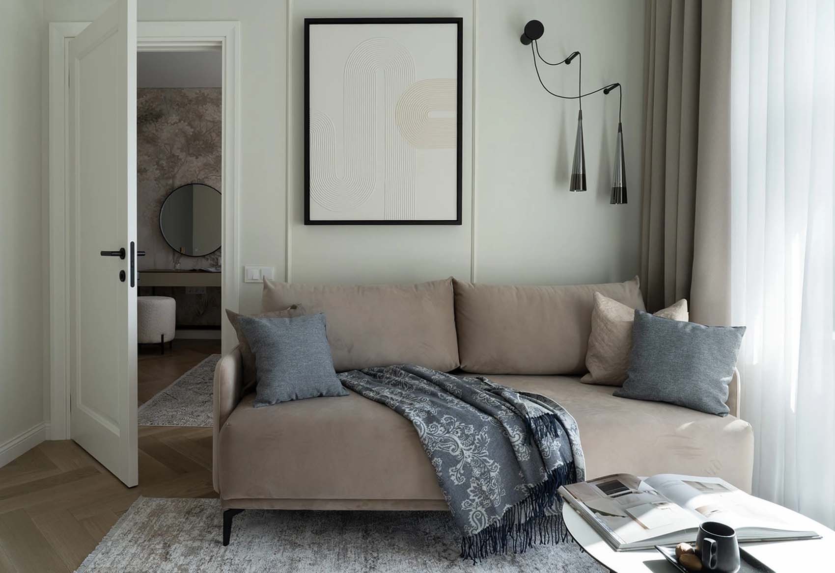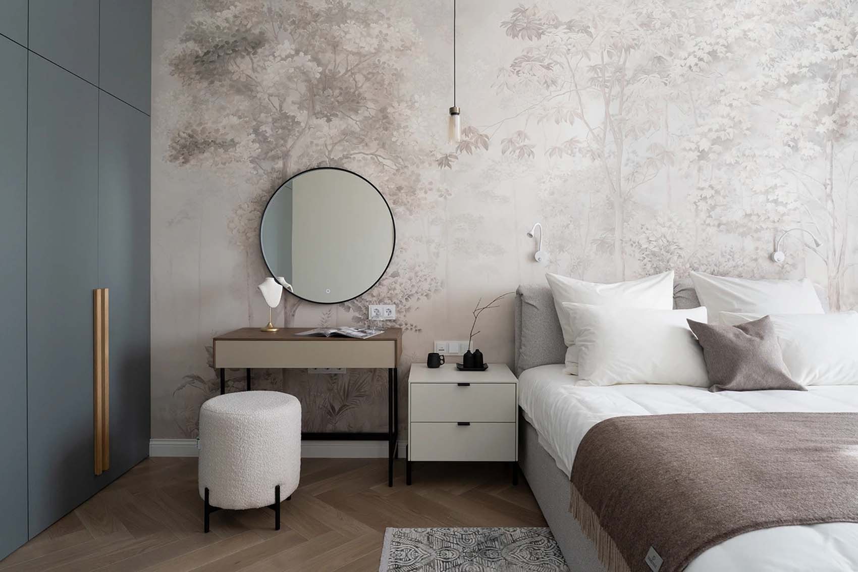 A falak felületképzéséhez alapvetően világos festéket és díszléceket használtak. A hálószobában az ágy fejtámlája mögötti falat egy semleges árnyalatú, fákat ábrázoló, freskó hatású tapétával díszítették. A nappali és a hálószoba padlójára rétegelt parkettát választottak. A konyhában és az előszobában retró stílusú, fekete-fehér burkolólapot fektettek le.