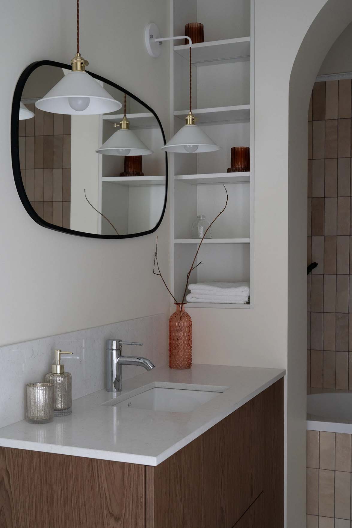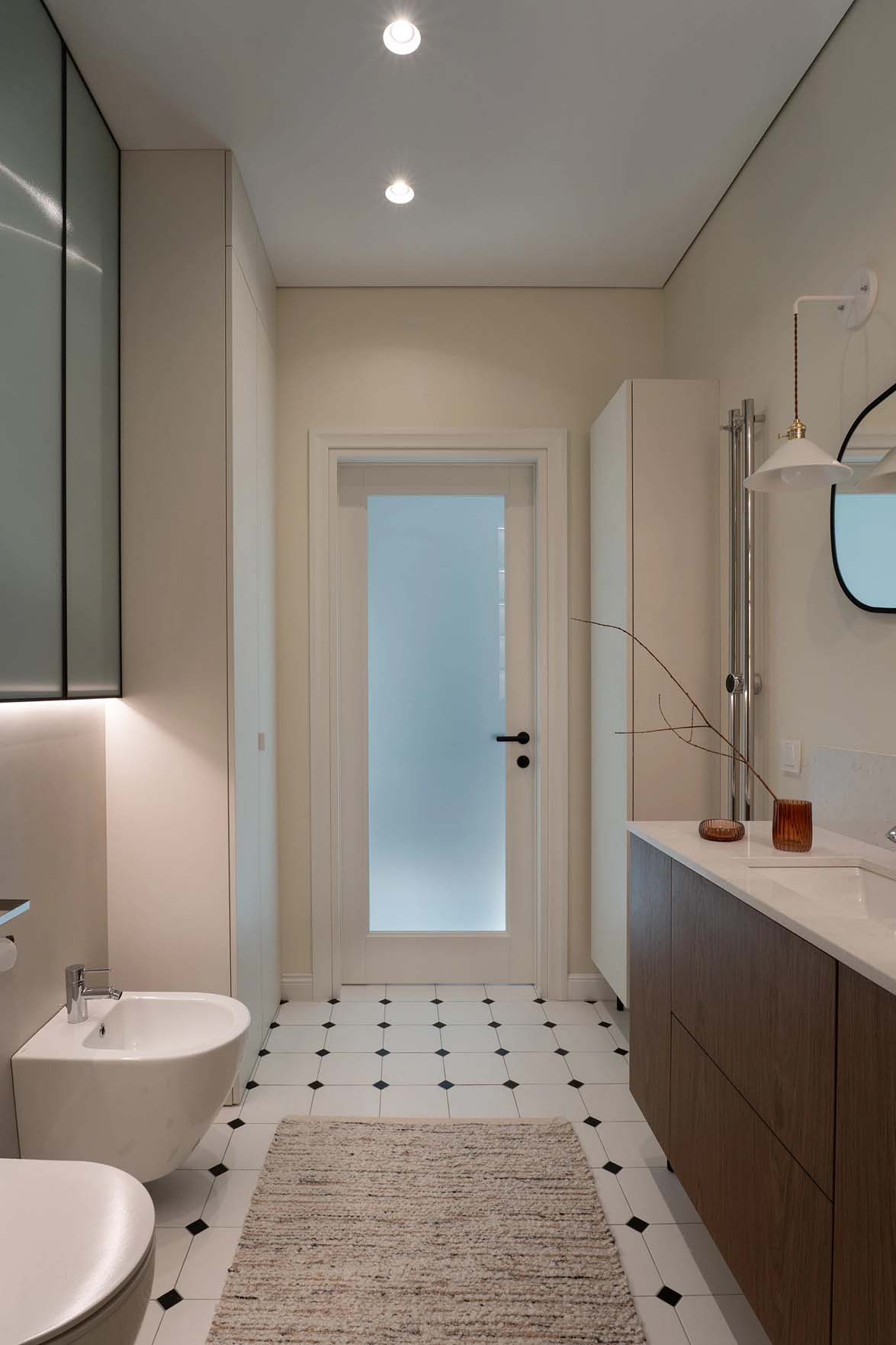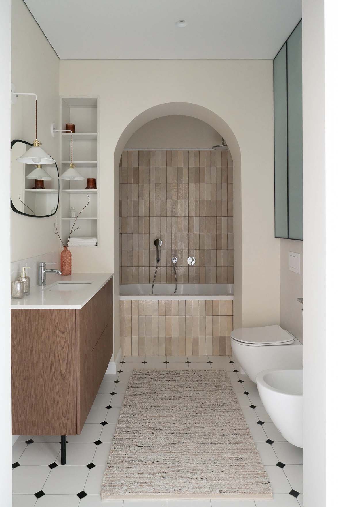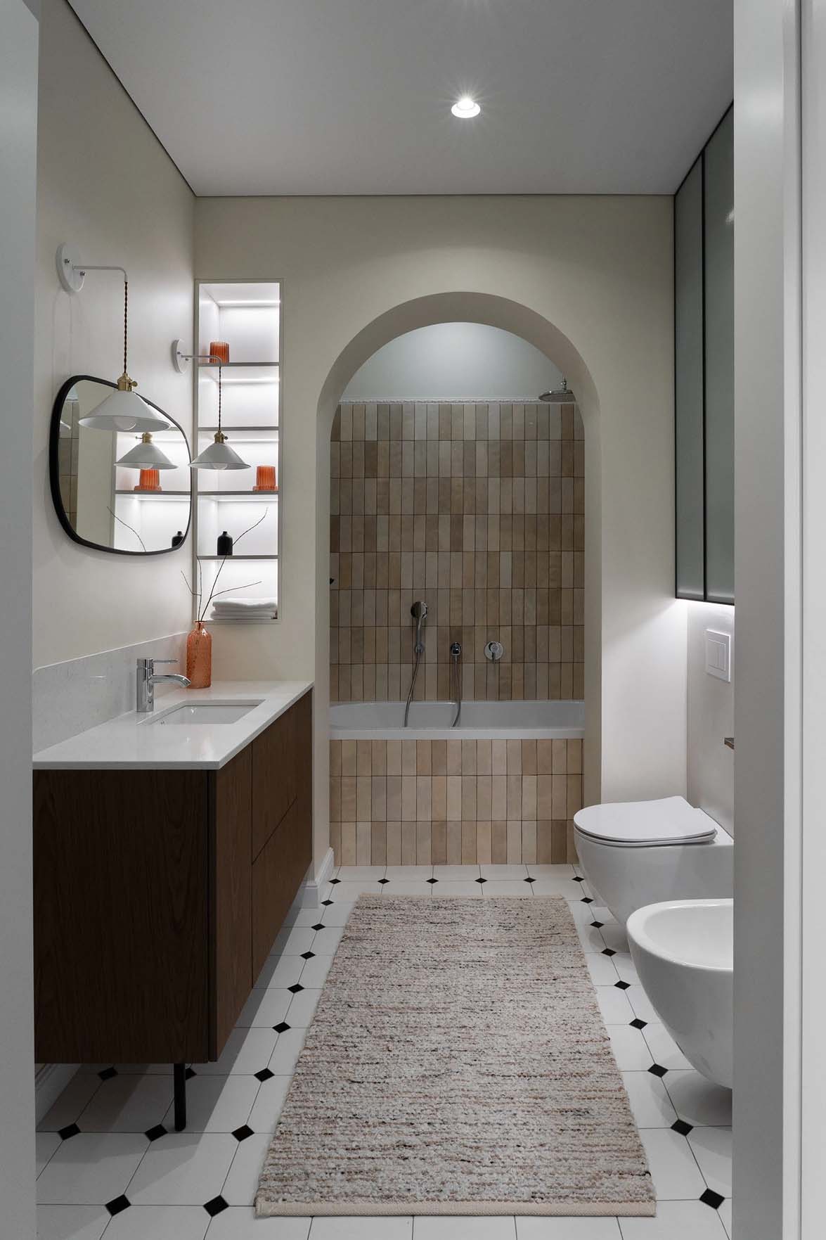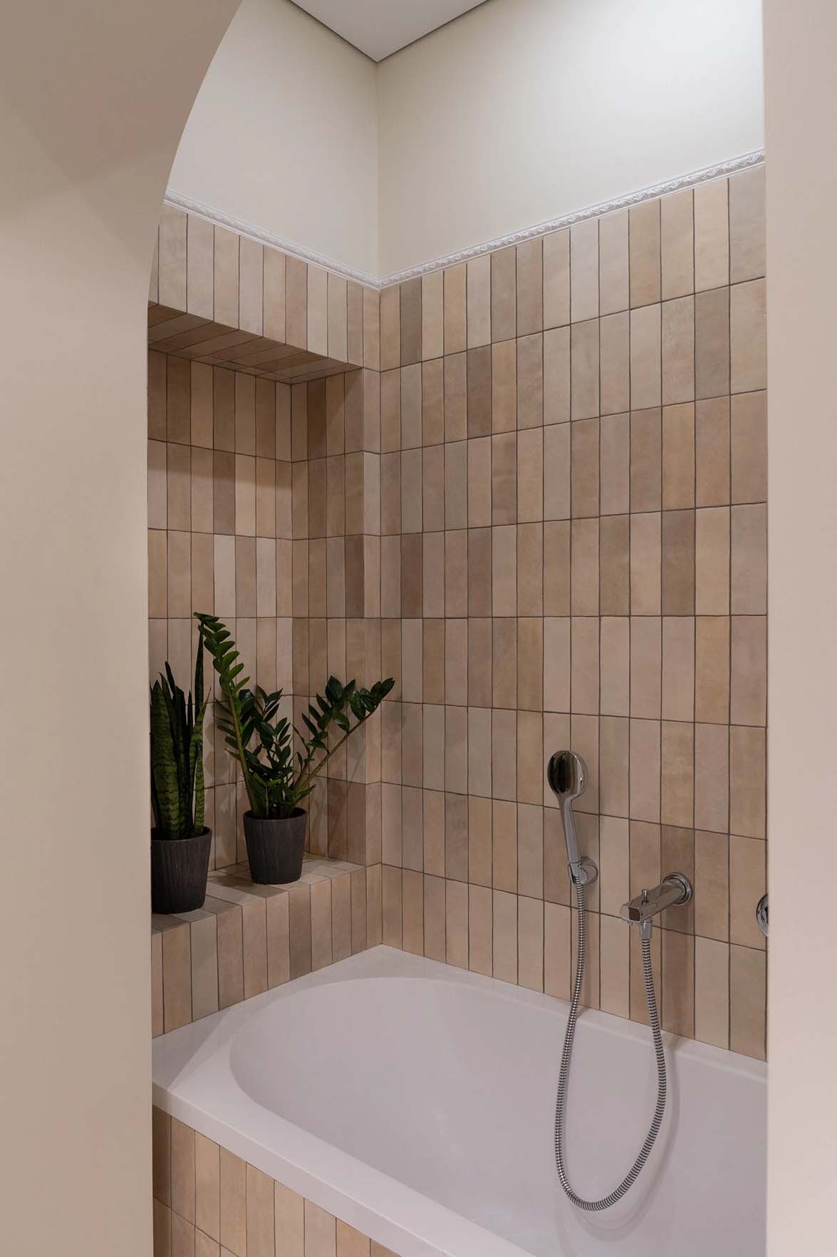 A fürdőszoba kialakításánál egy szokatlan megoldást alkalmaztak. Magát a kádat egy boltíves nyílású alkóvba helyezték – ezt a döntést az indokolta, hogy a gépészetet esztétikusan kellett elrejteni, de a végeredmény igazán pazar lett. A fürdőszoba padlóján ugyanazt a burkolólapot használták, mint a konyhában és az előszobában. A kád körüli falakat és annak előlapját kis méretű, bézs csempével burkolták. A többi falfelület festett.