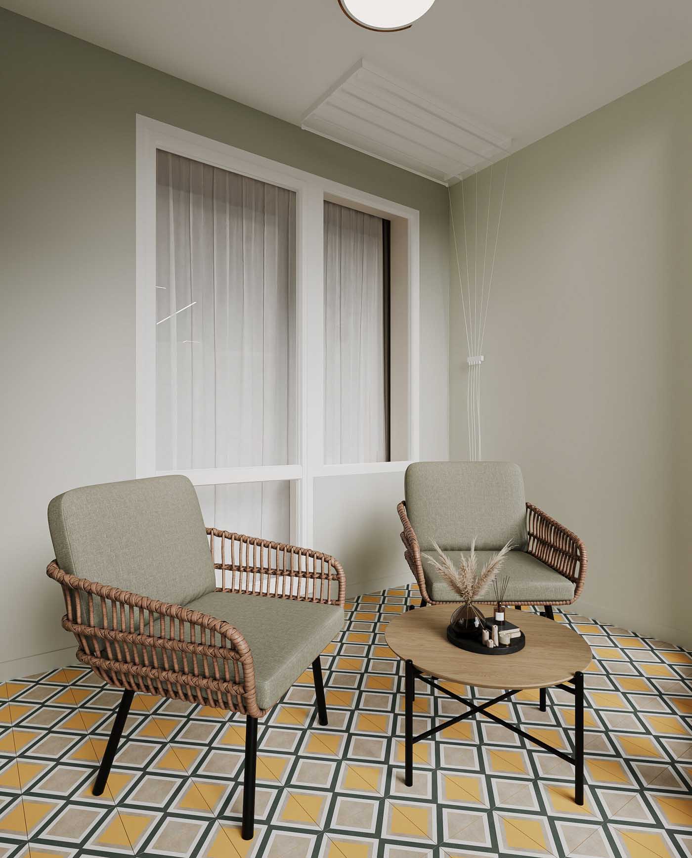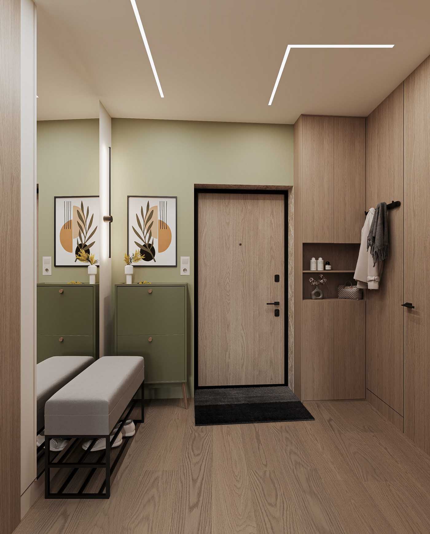 A lakás tulajdonosai – ötvenes éveiben járó házaspár – egy új építésű lakóparkban vásárolták meg a 60 m²-es lakást. A belsőépítészeti koncepció alapját a lakásból nyíló kilátás adta: az ablakokból a közeli folyópartra látni. A tervező célja az volt, hogy a nyugodt környezet a világos enteriőrben is tükröződjön, a természetes színeket, mint az olívazöld vagy a mustársárga a fa meleg textúrái egészítik ki.