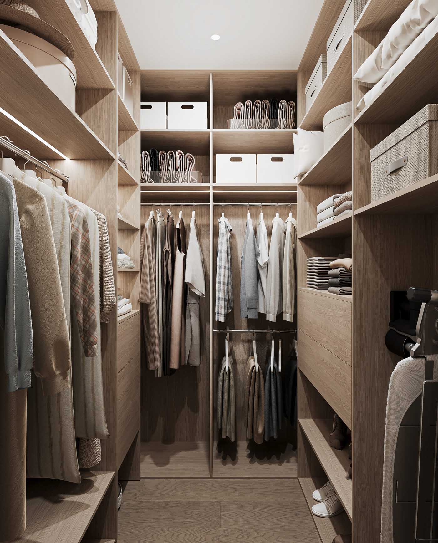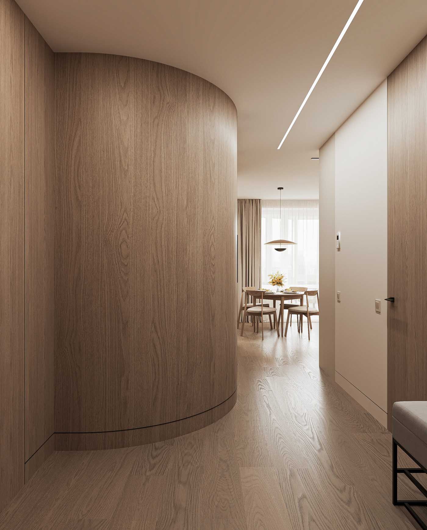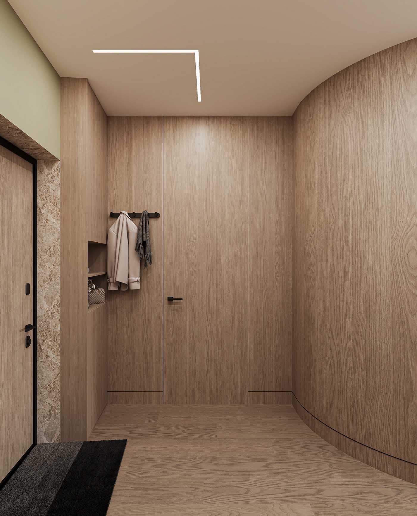 A már említett íves fal mögött egy külön gardróbhelyiséget alakítottak ki, ami praktikus döntés volt, hiszen így a közlekedőben nem kellett hatalmas szekrényeket kerülgetni, mégis minden háztartási eszköznek és kabátnak jutott hely. A falburkolat itt fa hatású fóliával bevont MDF panel, amely harmonizál a rejtett tokos fürdőszobaajtóval.