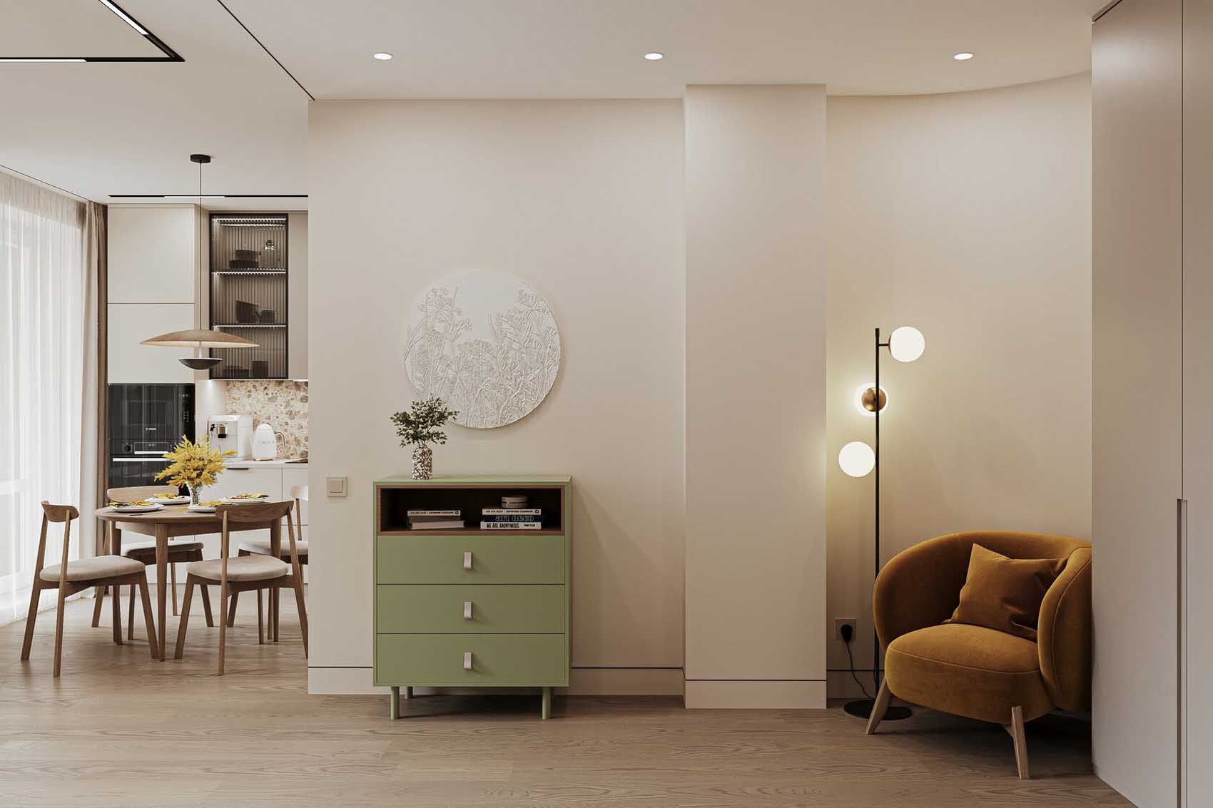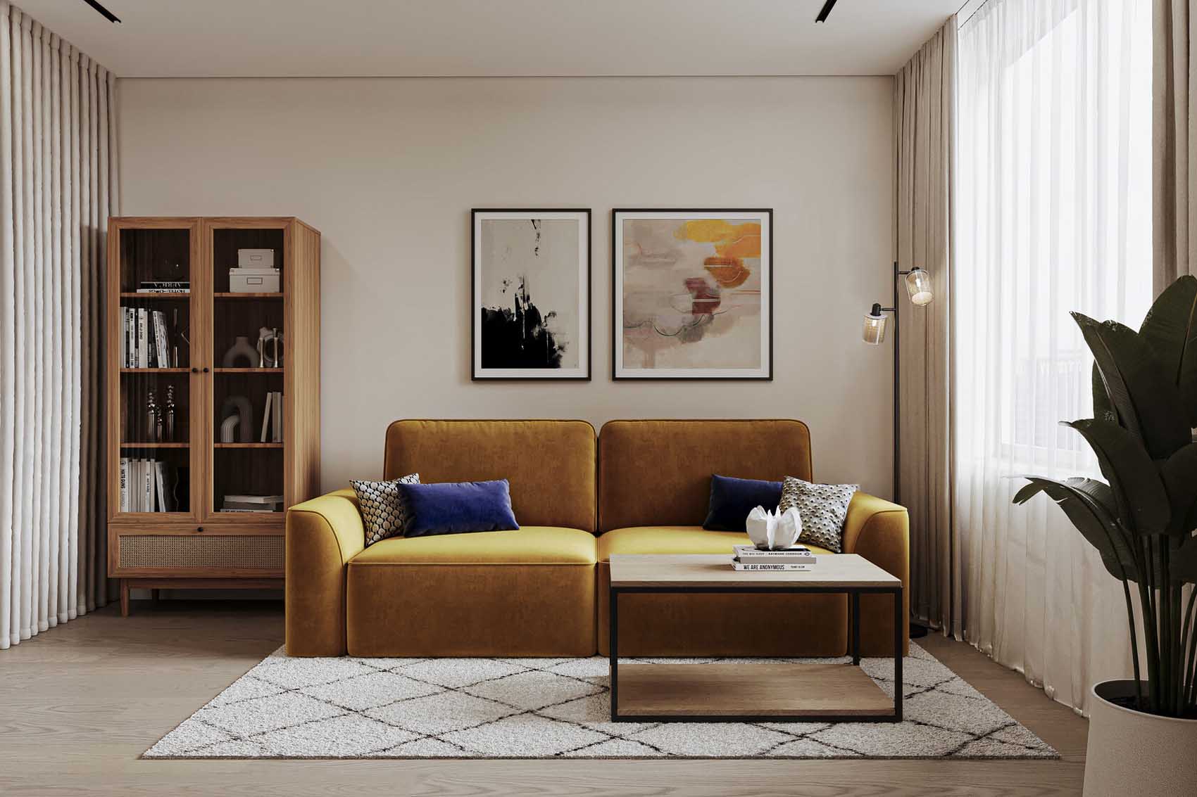 A nappali zónában a meleg bézs falszín és a világos fa árnyalatú SPC laminált padló adja az alapot. A tér fókuszpontja a mustársárga kanapé, amely élénk, mégis otthonos akcentust visz az enteriőrbe. A tárolást itt egy üveges vitrin oldja meg, amely könyveknek, dekortárgyaknak és iratoknak ad helyet, stílusában igazodva a TV-állványhoz. A világítás rétegzett: az általános mennyezeti fények mellett egy állólámpa biztosít hangulatvilágítást a kanapé mellett, tökéletes olvasósarkot teremtve.