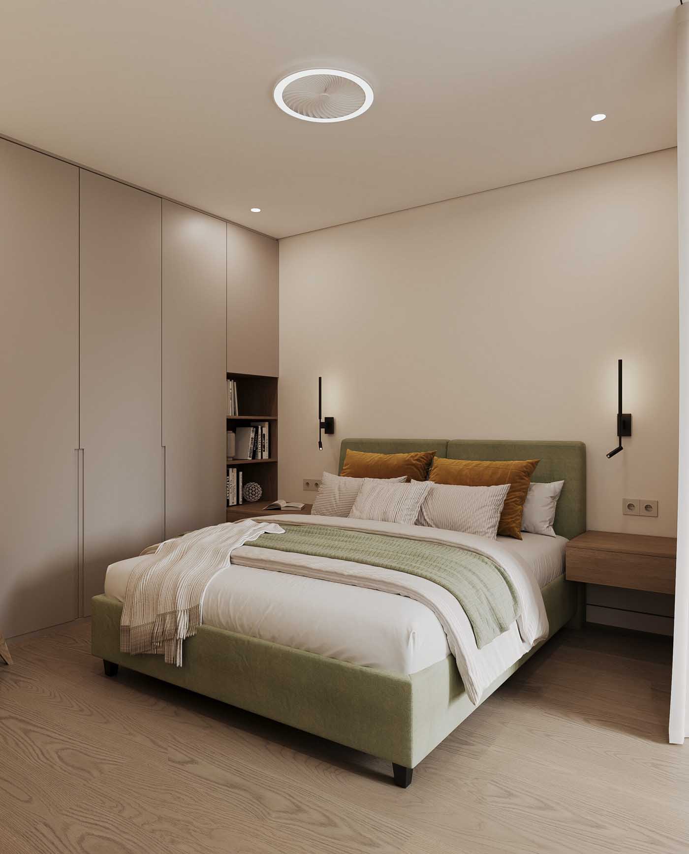 A nappalival egy légtérben, de vizuálisan mégis elkülönülve található a hálószoba. Itt a tárolásé a főszerep: egy mennyezetig érő beépített szekrény nyeli el a ruhákat és az ágyneműt. A szekrény fal felőli oldalát nyitott polcokkal oldották meg, ami ideális könyvek és személyes tárgyak kiállítására, megtörve a nagy bútor tömörségét. Az éjjeliszekrények felett fali karok, a fotel mellett pedig állólámpa gondoskodik a meghitt esti fényekről.