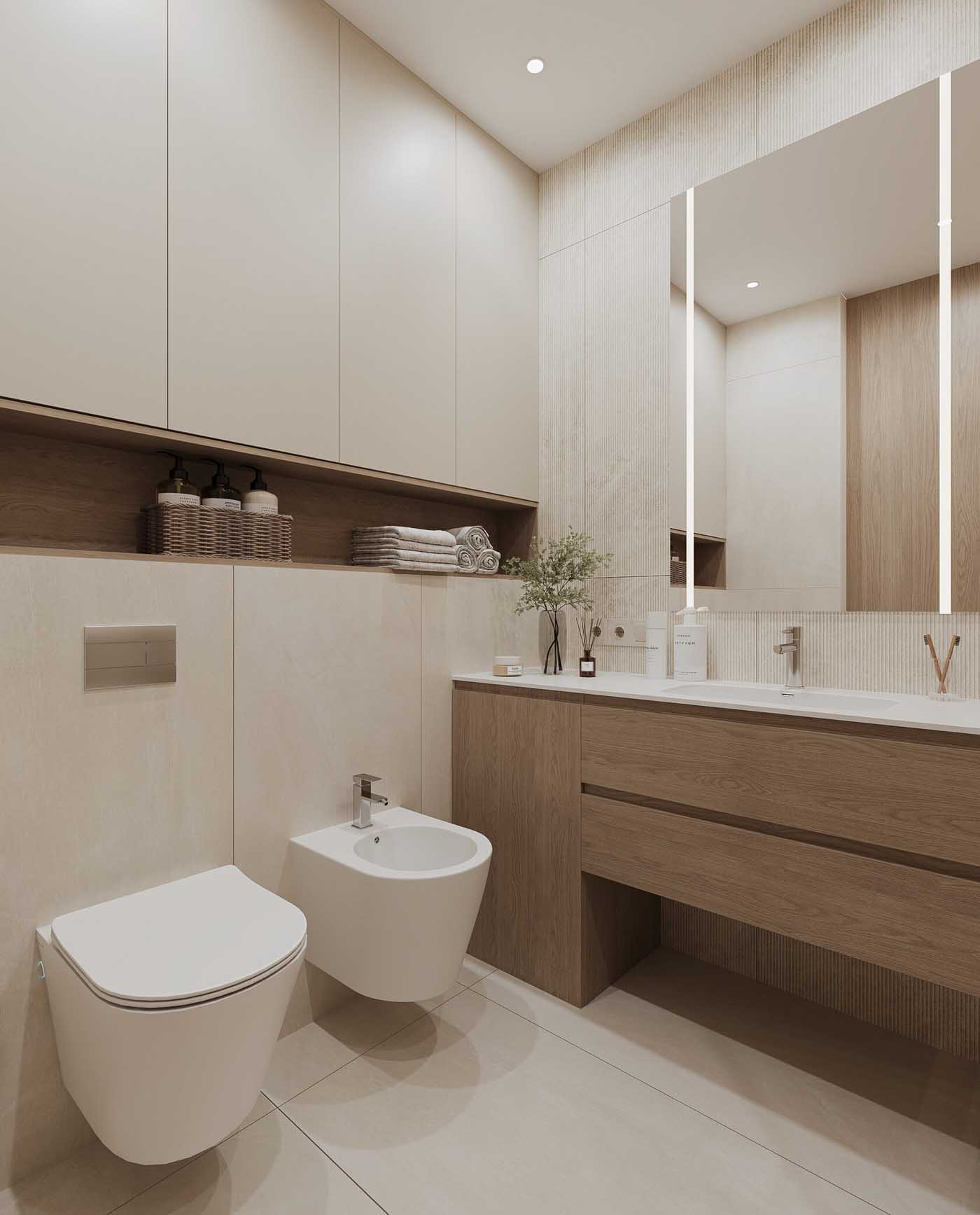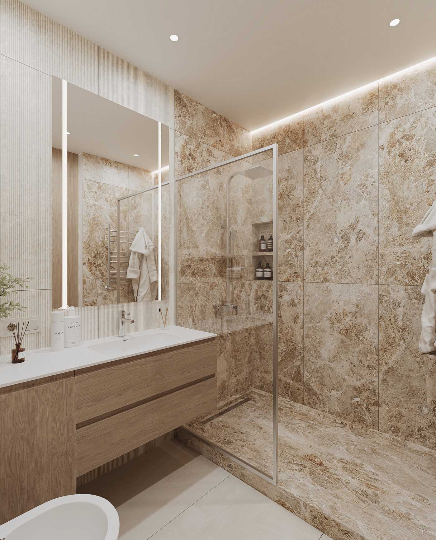 A vizesblokkban háromféle kerámia burkolat találkozik, izgalmas textúrákat létrehozva: a bázist egy semleges bézs lap adja, amelyet a mosdó mögötti falon egy strukturált, dombornyomott felületű burkolat egészít ki – ezt a tükör háttérvilágítása emeli ki igazán drámaian. A zuhanyzóban a padlón és a falon kő textúrás lapok jelennek meg. A zuhanyzóban épített falfülkék nemcsak a tisztálkodószerek tárolását oldják meg elegánsan, hanem segítettek egy eredetileg éles falszög kiegyenesítésében is. A tárolást a mosdó alatti szekrény és a WC-tartály feletti beépített tároló egészíti ki.