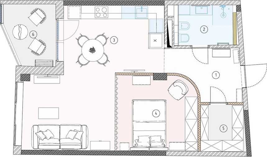 A kivitelező “szerkezetkész” állapotban adta át a lakást: a 60 négyzetméteres térben csak a fürdőszoba falai, a lodzsa és a lakás közepén álló tartóoszlop voltak adottak. A tervező tiszteletben tartotta a vizesblokk határait, a konyhát is az eredetileg kijelölt helyre tervezte, azonban a tér többi részét a lehető legszellősebbre hagyta.