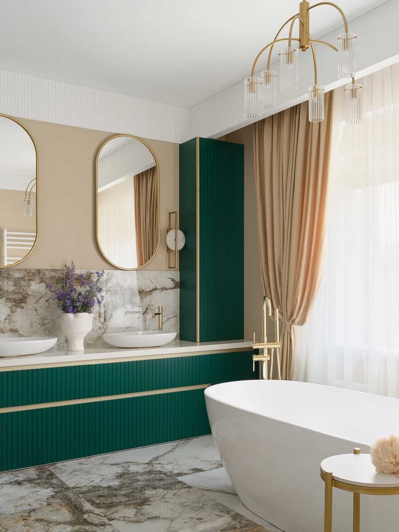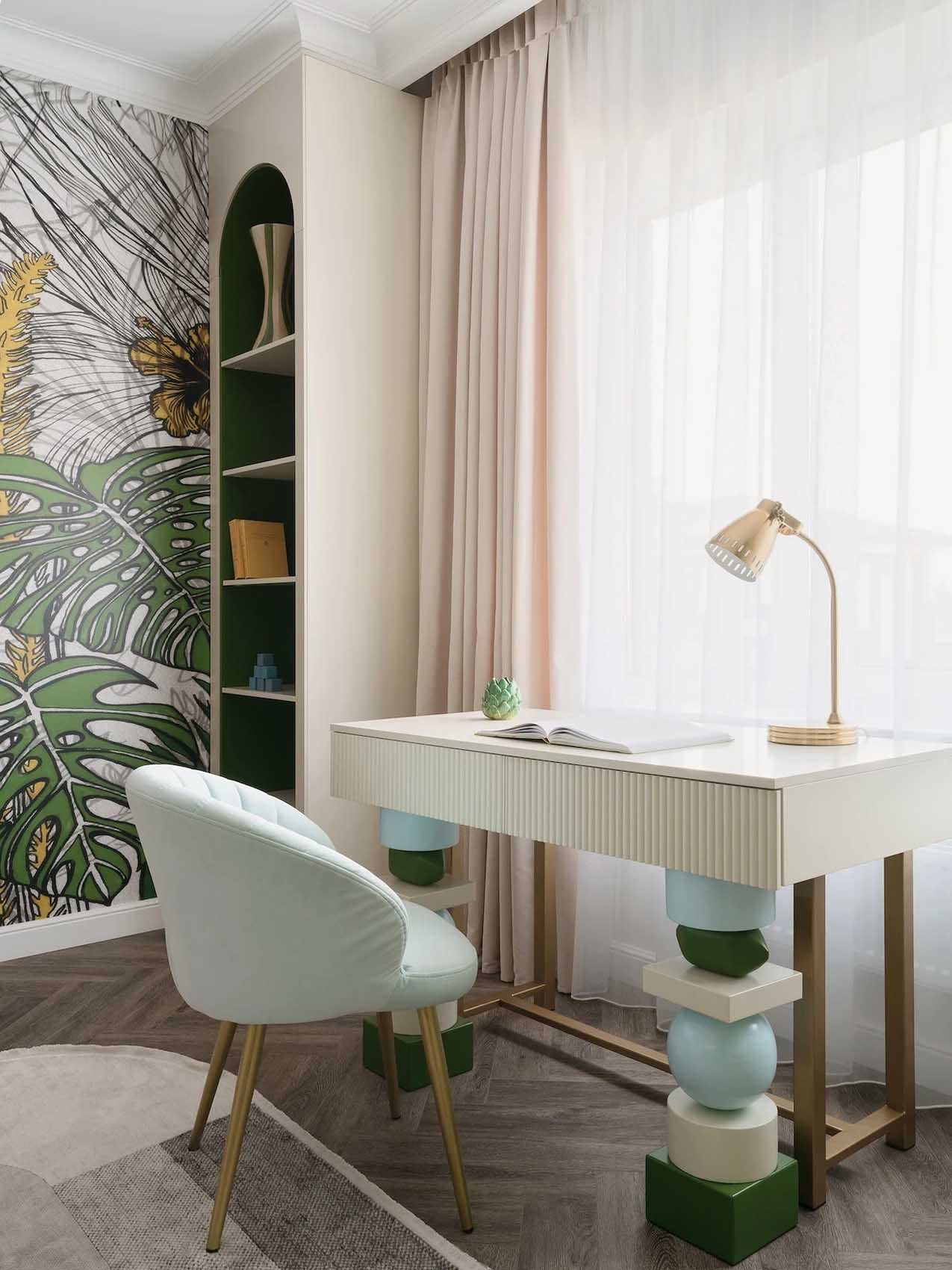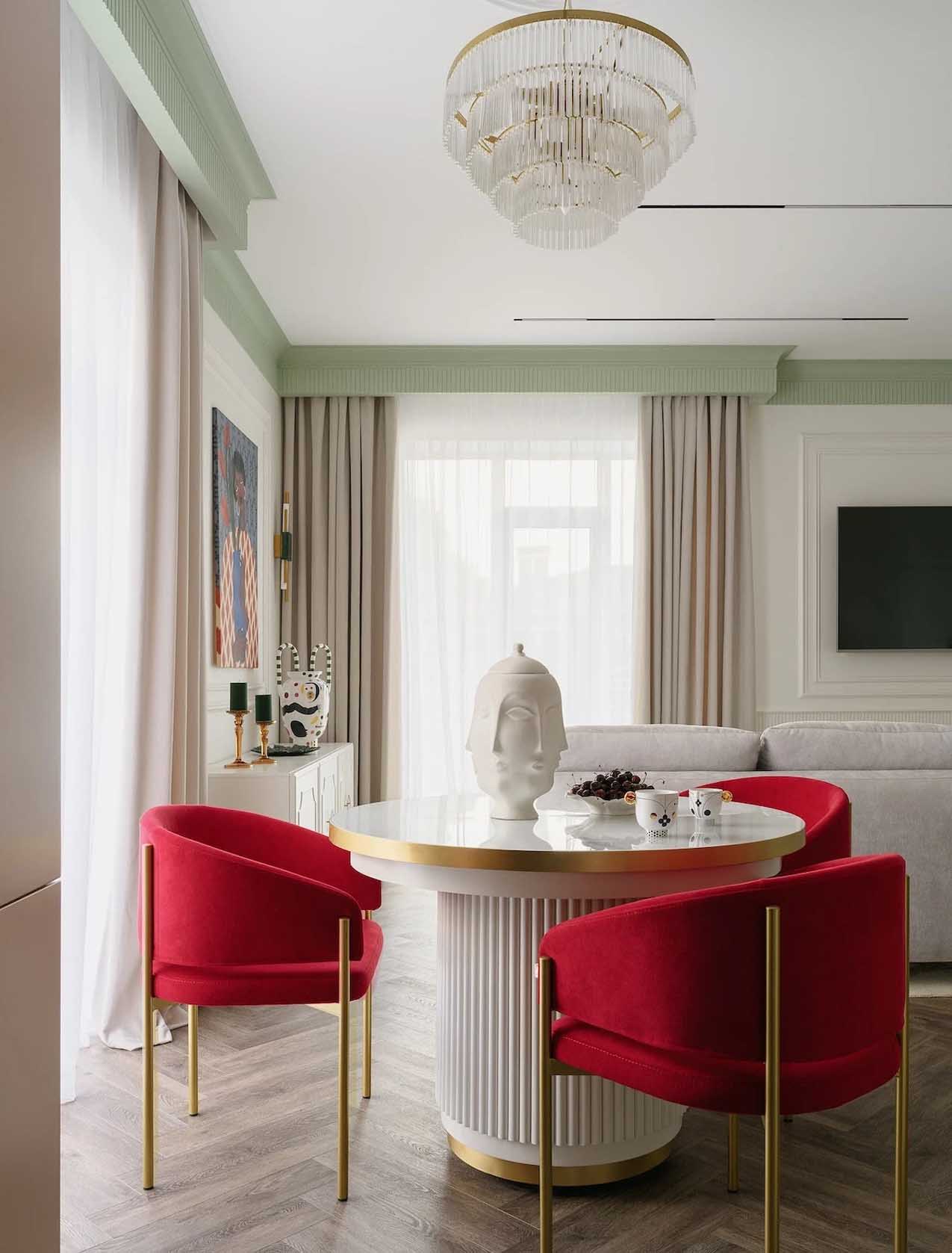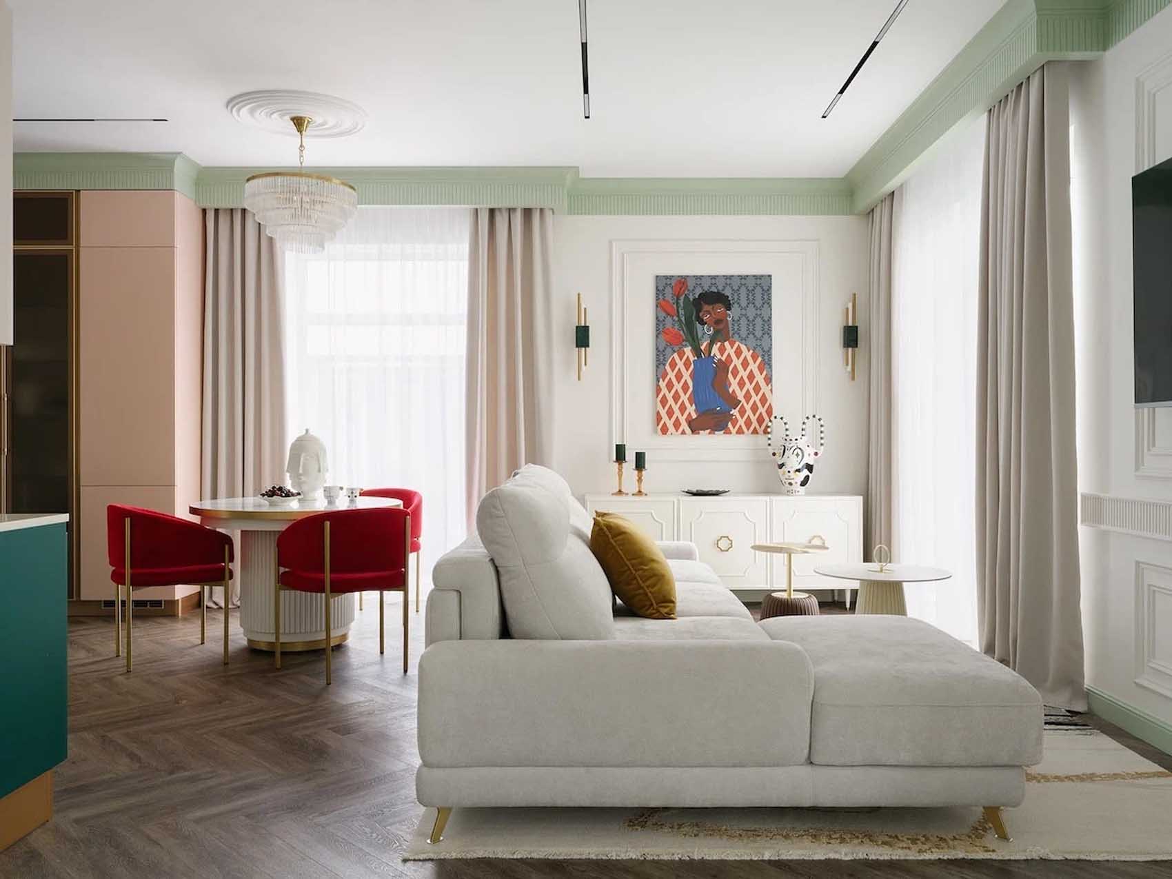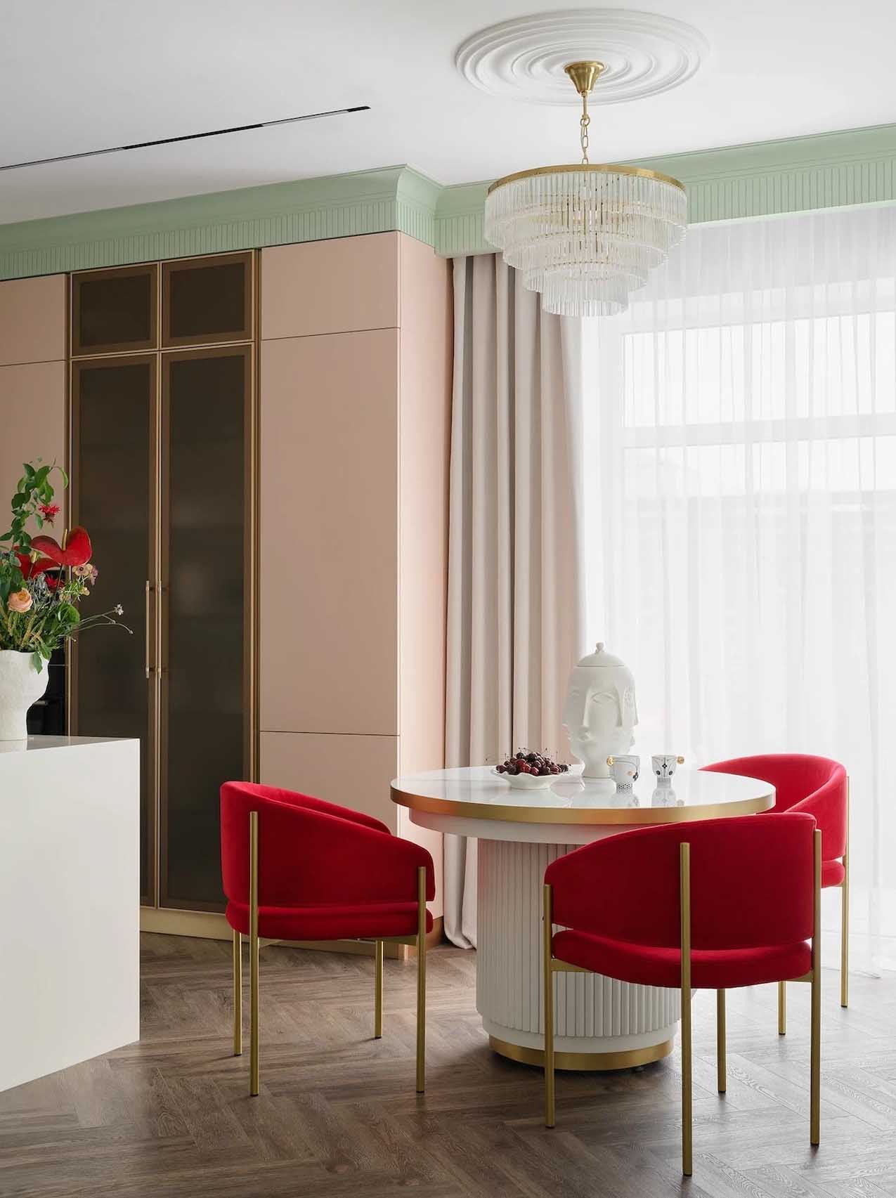 A berendezésben a törtfehér alapszínt pasztell zöld, rózsaszín, menta és smaragdzöld árnyalatok, sőt, egy merészebb, bogyós gyümölcs szín is kiegészíti. A világítási koncepció rétegzett: a mennyezeti sínes és spotlámpák mellett az étkezőasztal fölött egy elegáns, üveg függesztékekkel díszített csillár adja meg a tér karakterét.
