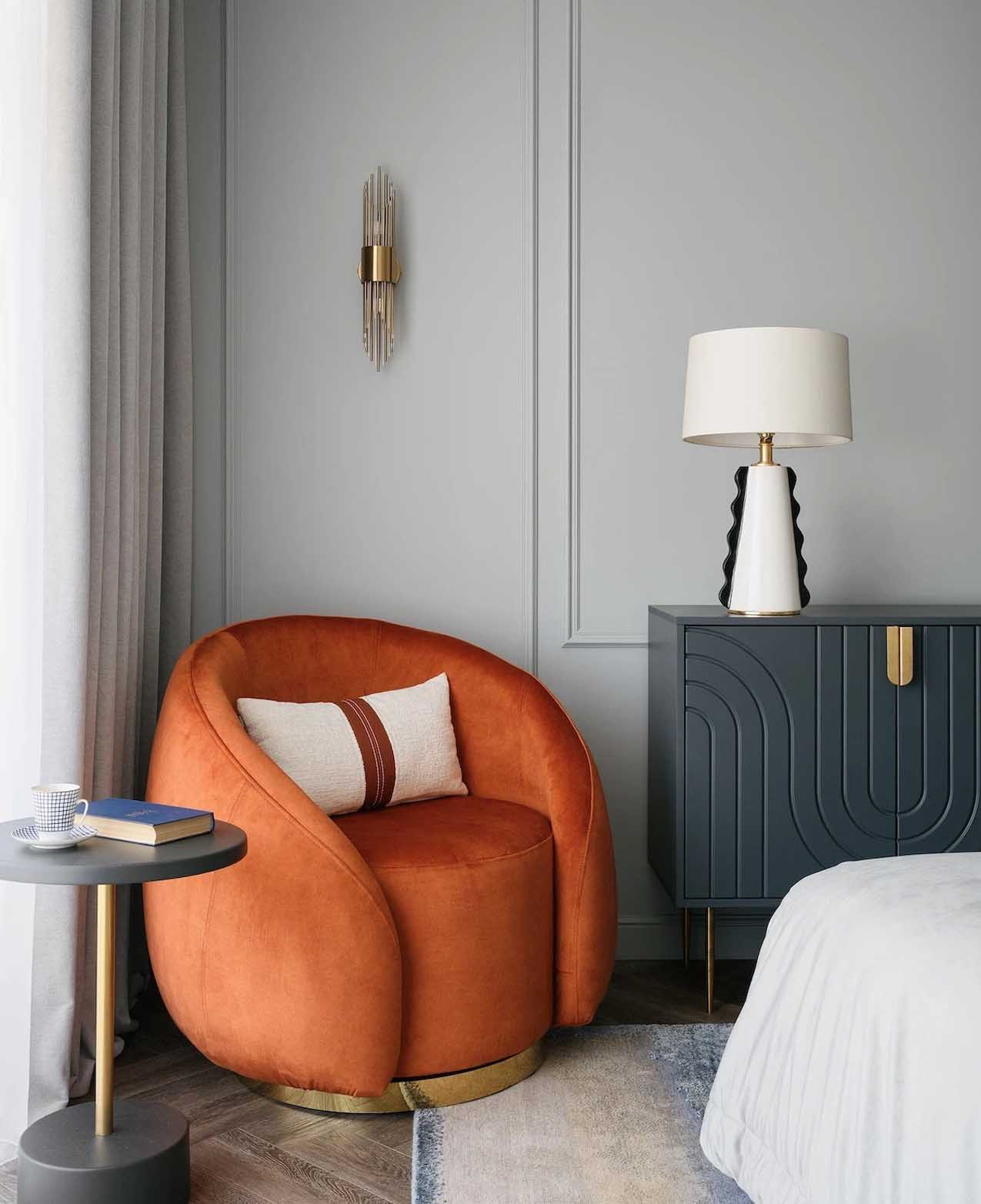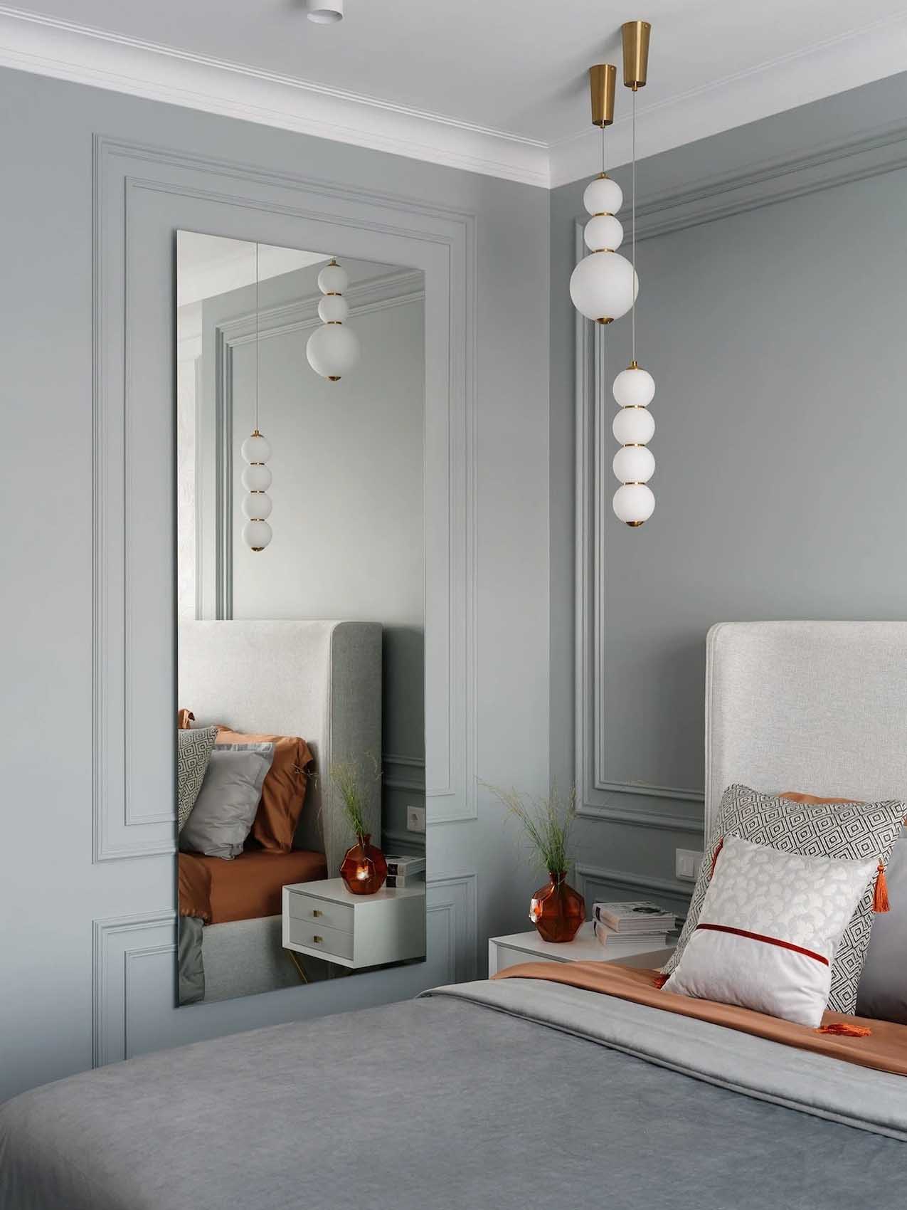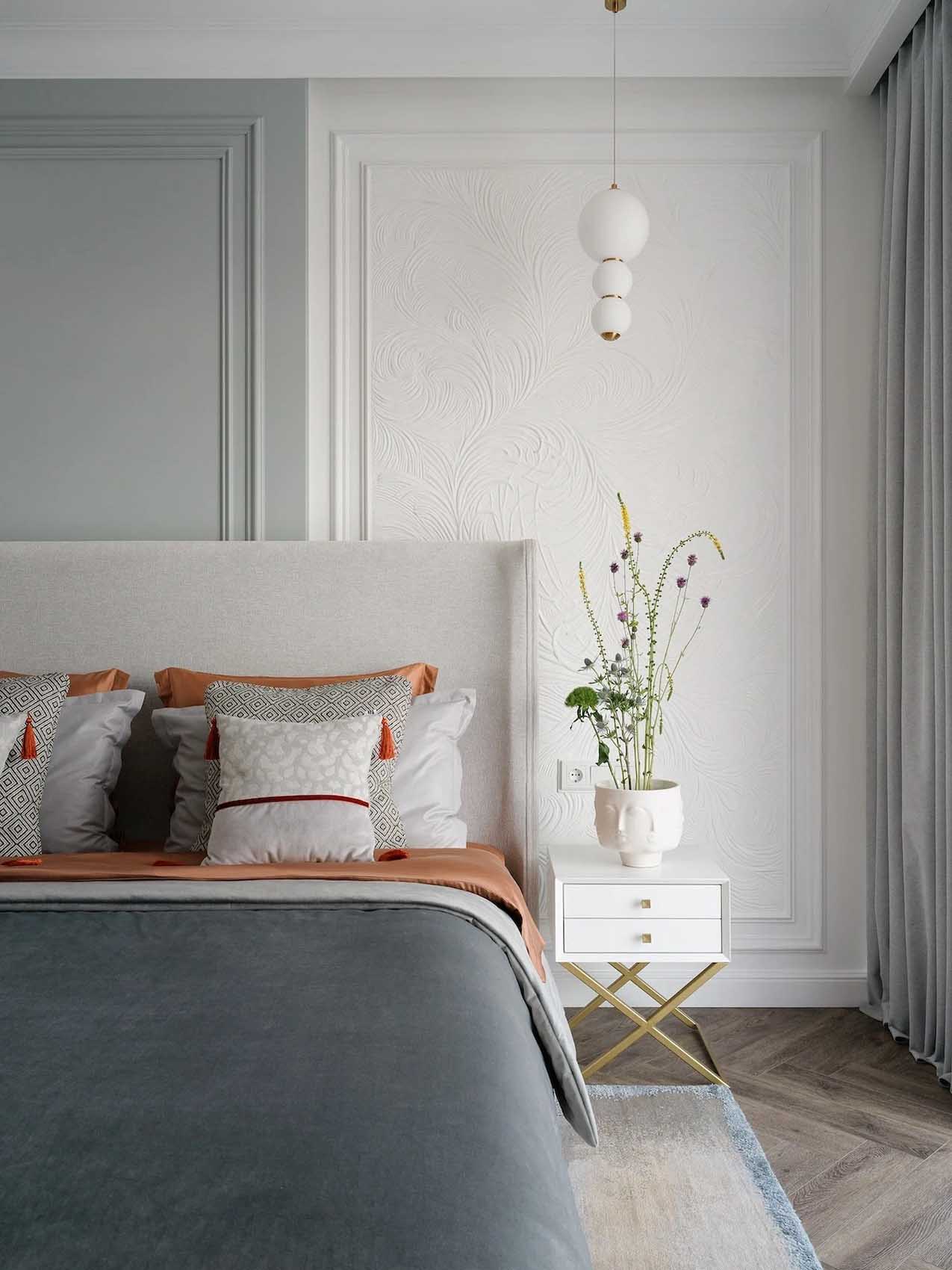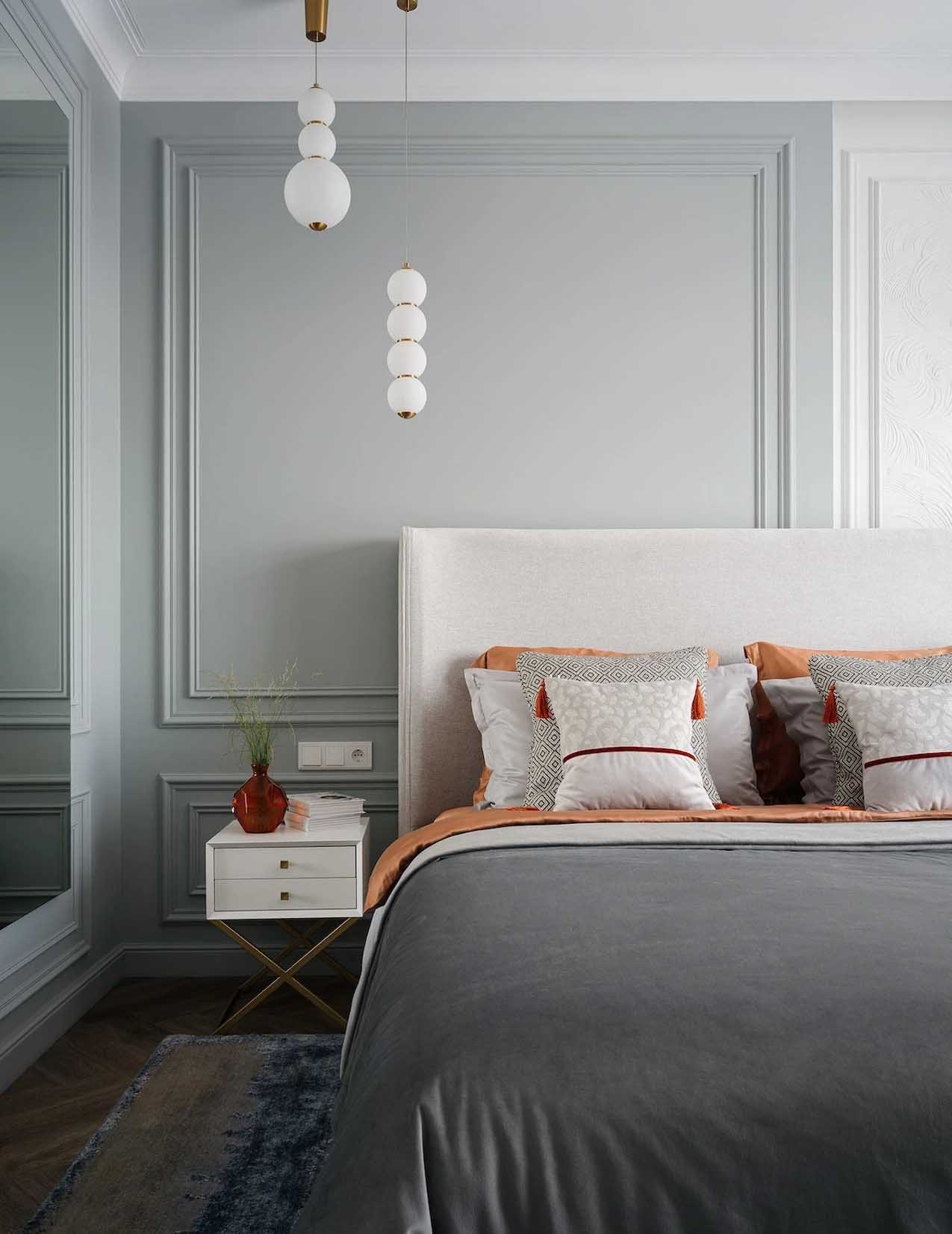 A szülői hálószoba esetében a cél egy “hűvös, ködös reggel” hangulatának megteremtése volt. Ez az egyetlen helyiség, ahol a szürke dominál – a falak tiszta szürke árnyalata frissességgel tölti meg a teret.