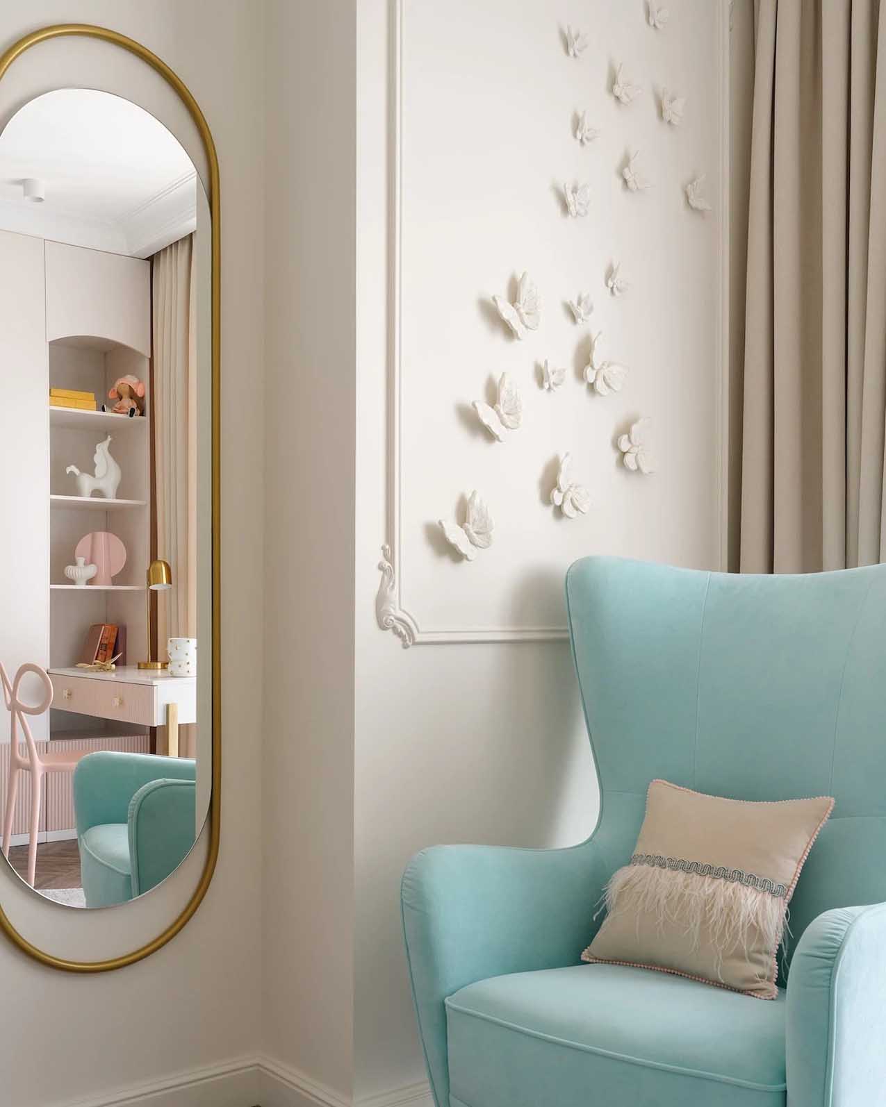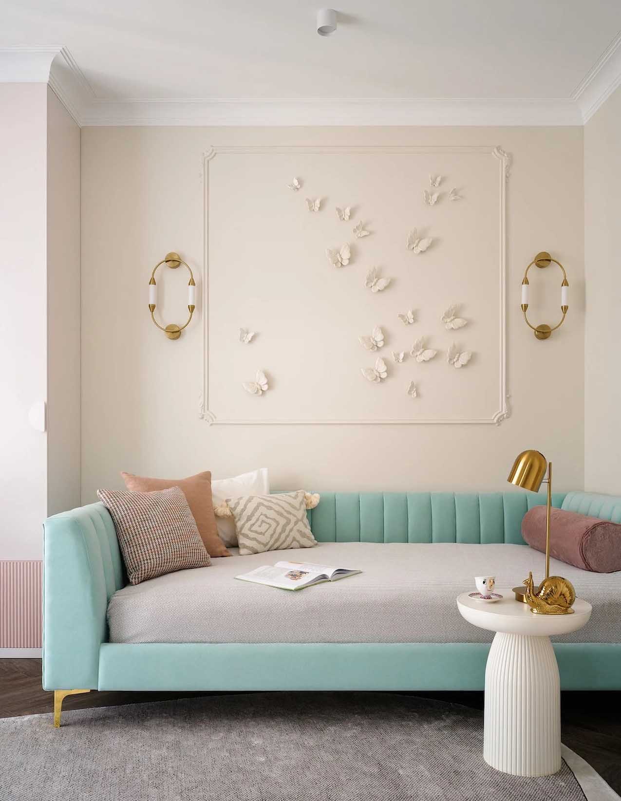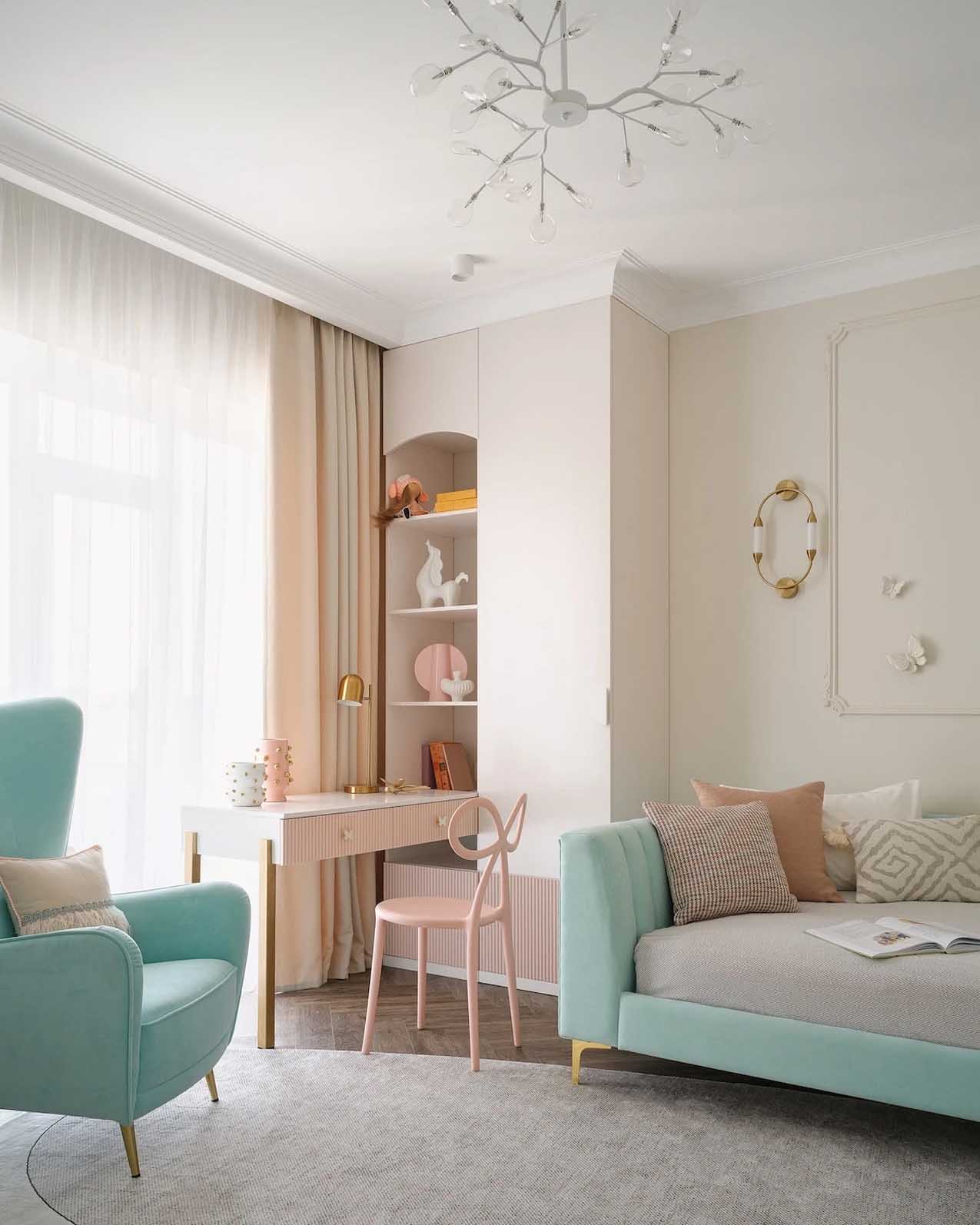 A zöld, a rózsaszín, a menta és a szürke különböző árnyalataival teremtett tökéletes összhangot a lakberendező ebben az enteriőrben. A kétszintes családi házban a tervezőnek sikerült a modern klasszikus stílust alapként használva egy visszafogottan élénk, rendkívül komfortos életteret létrehoznia egy négyfős család számára.
