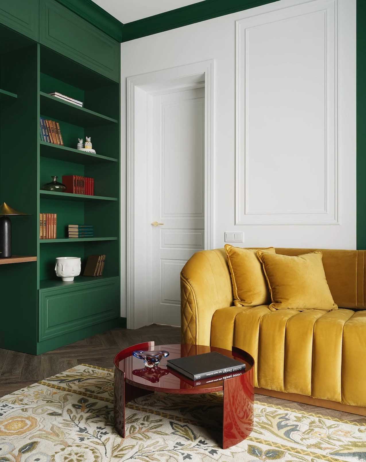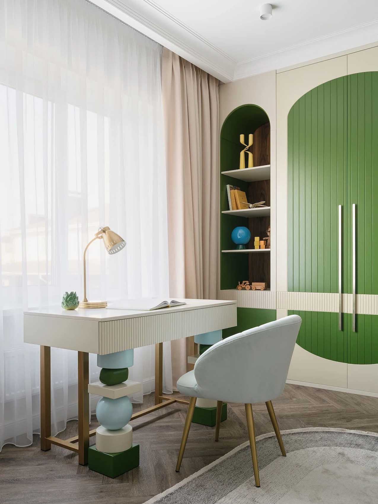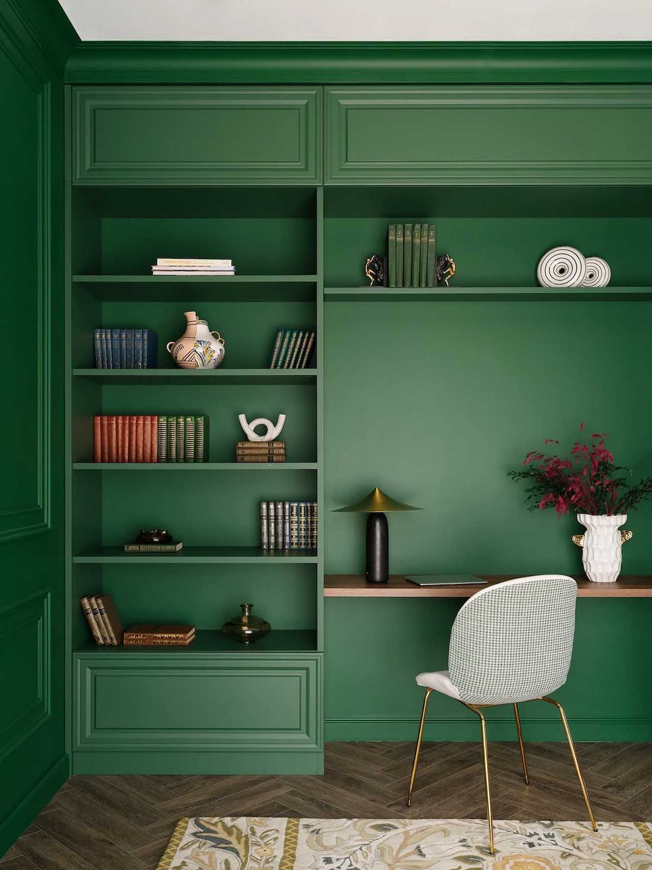 A dolgozószoba az egyetlen helyiség az egész házban, ahol többségében telített, mély árnyalatokat használtak. A tervező itt egy karakteres, mélyzöld színt választott, amely olyannyira meghatározó eleme lett a térnek, hogy még a mennyezet egy részére is felfut. A színválasztás tudatos döntés volt: a zöld árnyalat köztudottan oldja a feszültséget és nyugtat, de anélkül, hogy túlzottan ellazítana. Elősegíti a logikus gondolkodást, a koncentrációt és a tervezést – mindazokat a képességeket, amelyek elengedhetetlenek egy otthoni irodában.