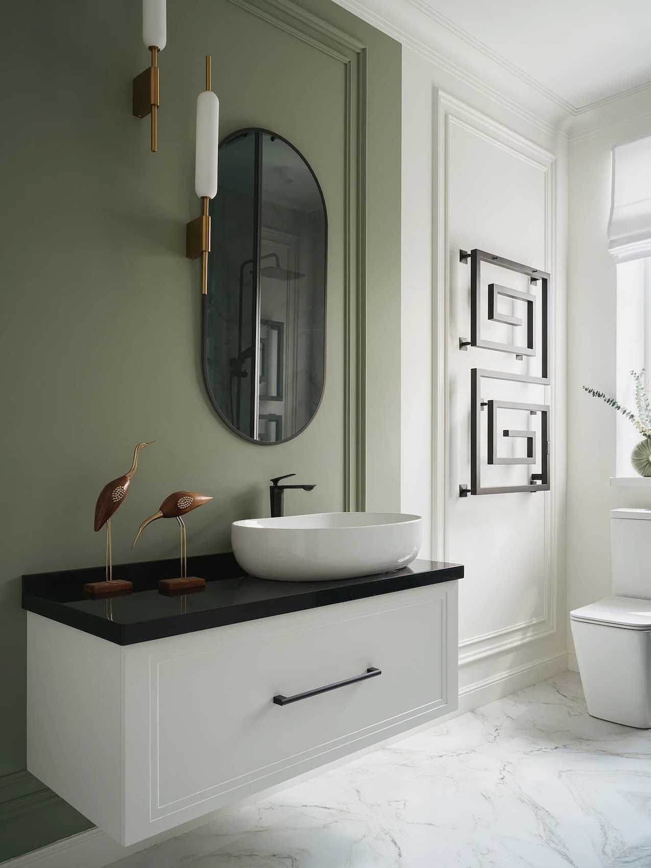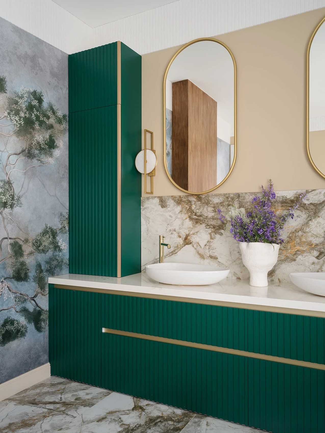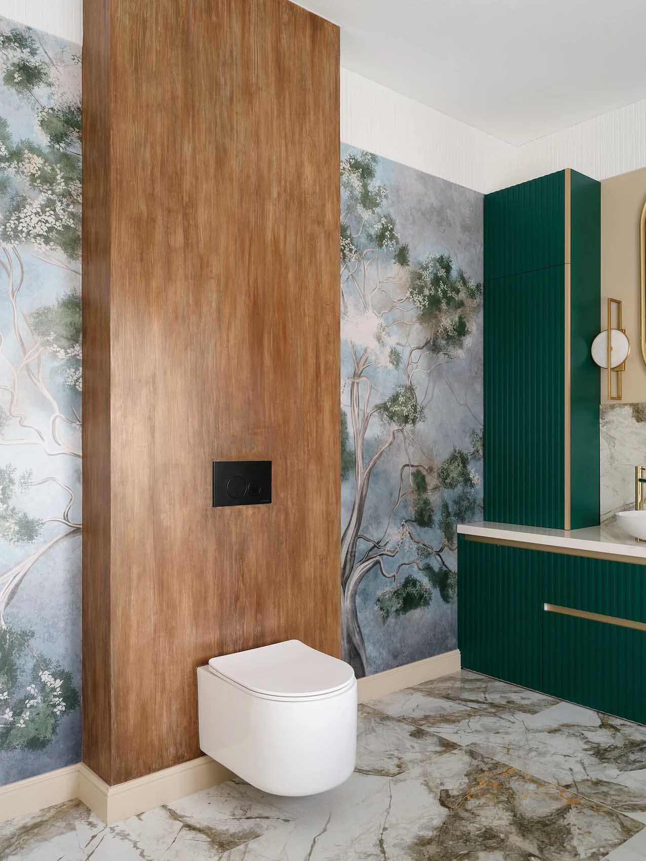 Minden más falfelület pára- és vízálló festést kapott. Az emeleti fürdőszoba különlegessége egy látványos, fákat ábrázoló fotótapéta-pannó, amely otthonos és egyedi hangulatot ad a helyiségnek. A tárolást a földszinten egy mosdó alatti szekrény, míg az emeleten egy egyedi, két mosdókagylót tartó hosszú pult, valamint a mellette elhelyezett keskeny, falba süllyesztett szekrények oldják meg.
