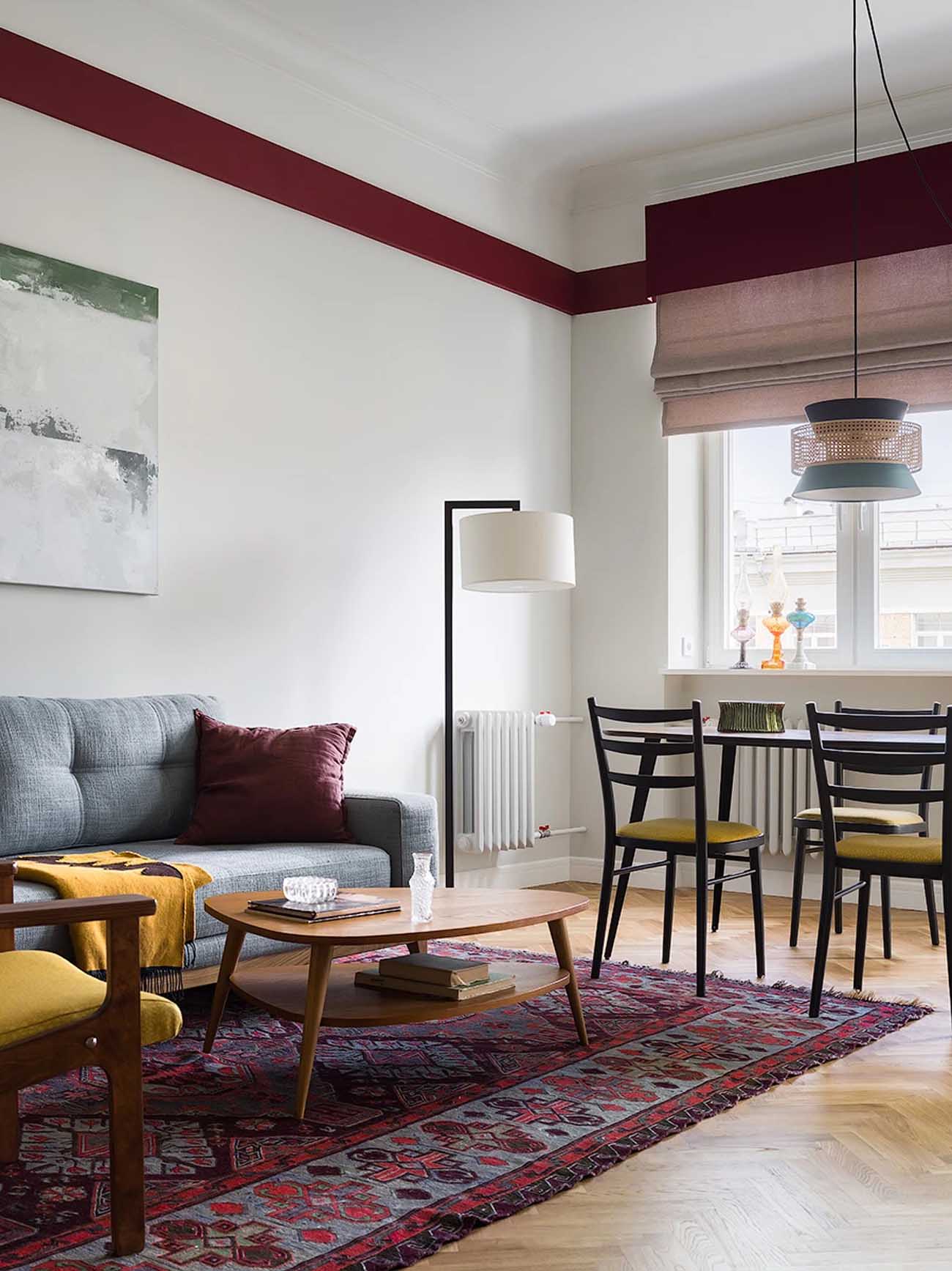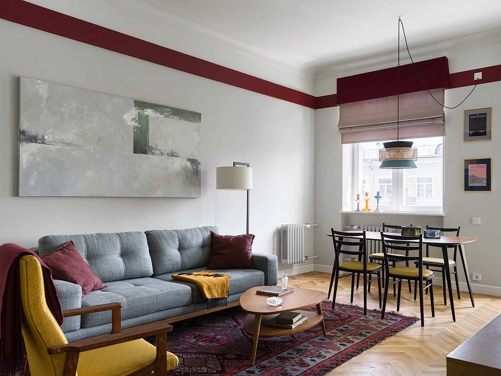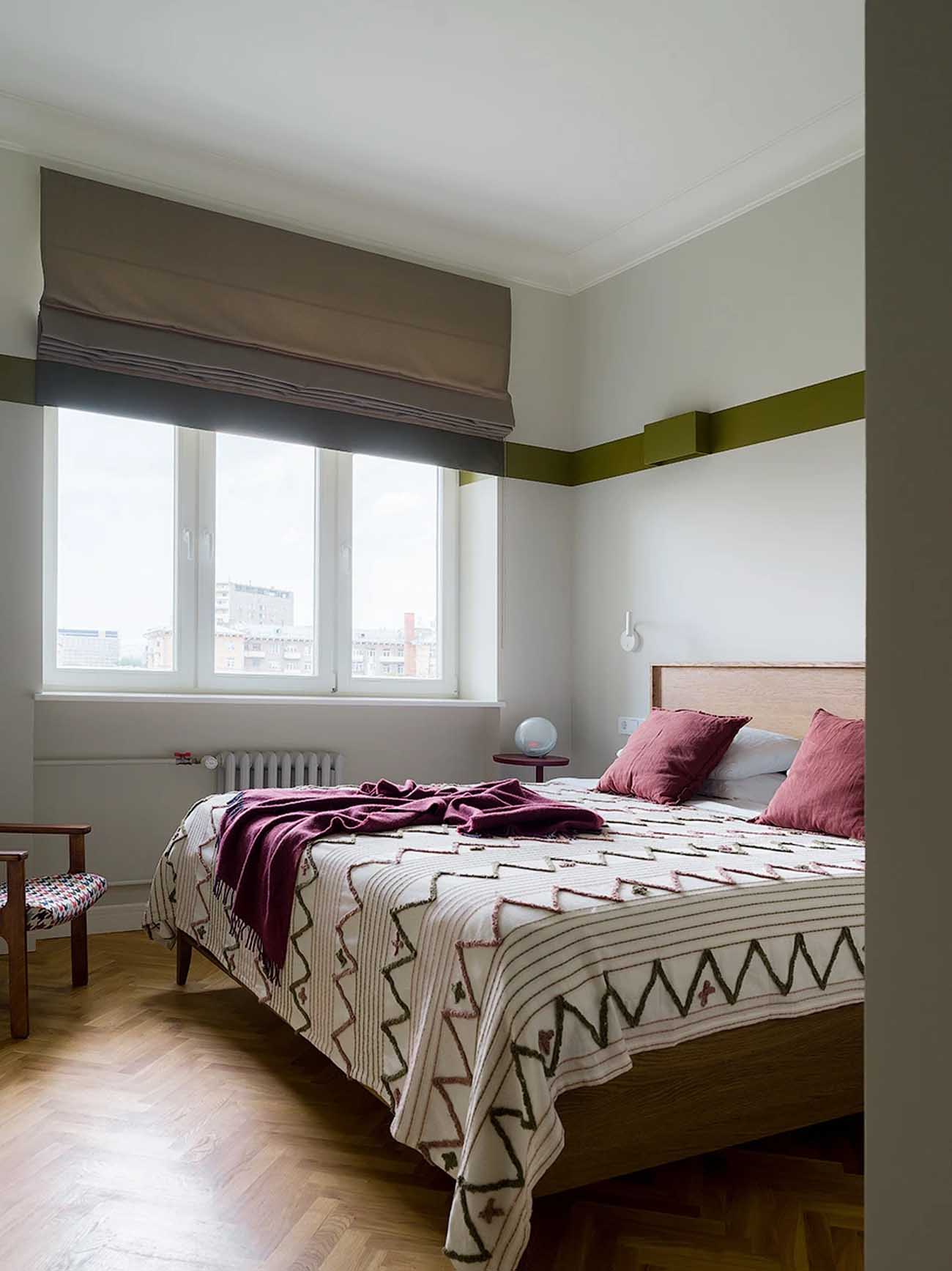 A lakás tájolása ideális: a déli oldalra, ahol három ablak is biztosítja a természetes fényt, a konyha, a dolgozó és a nappali került, míg a hálószoba az északi oldalra néz. Az ablakok vonalában egy klasszikus enfiládot (egymásba nyíló térsort) hoztak létre üvegezett, kétszárnyú ajtókkal, ami tovább fokozza a tágasság és a légiesség érzetét. A maximális világosság érdekében a falak egységesen világosszürke, már-már fehér árnyalatot kaptak. Minden helyiség rendelkezik azonban egyedi karakterrel: a nappaliban és a hálóban bordó és olívazöld sávok futnak végig, amelyek a falakról a textíliákra is átkúsznak. A fürdőszobát egy karakteres kék árnyalat uralja, míg a konyha és az előszoba padlóját kontrasztos mintázatú járólap díszíti.