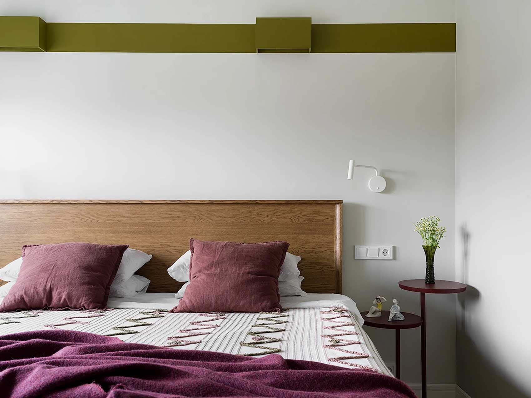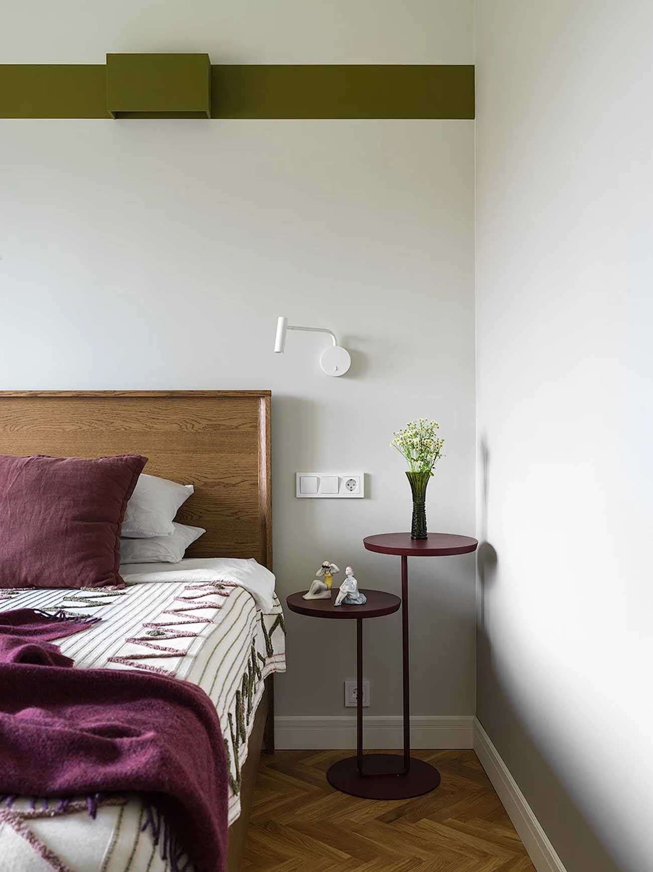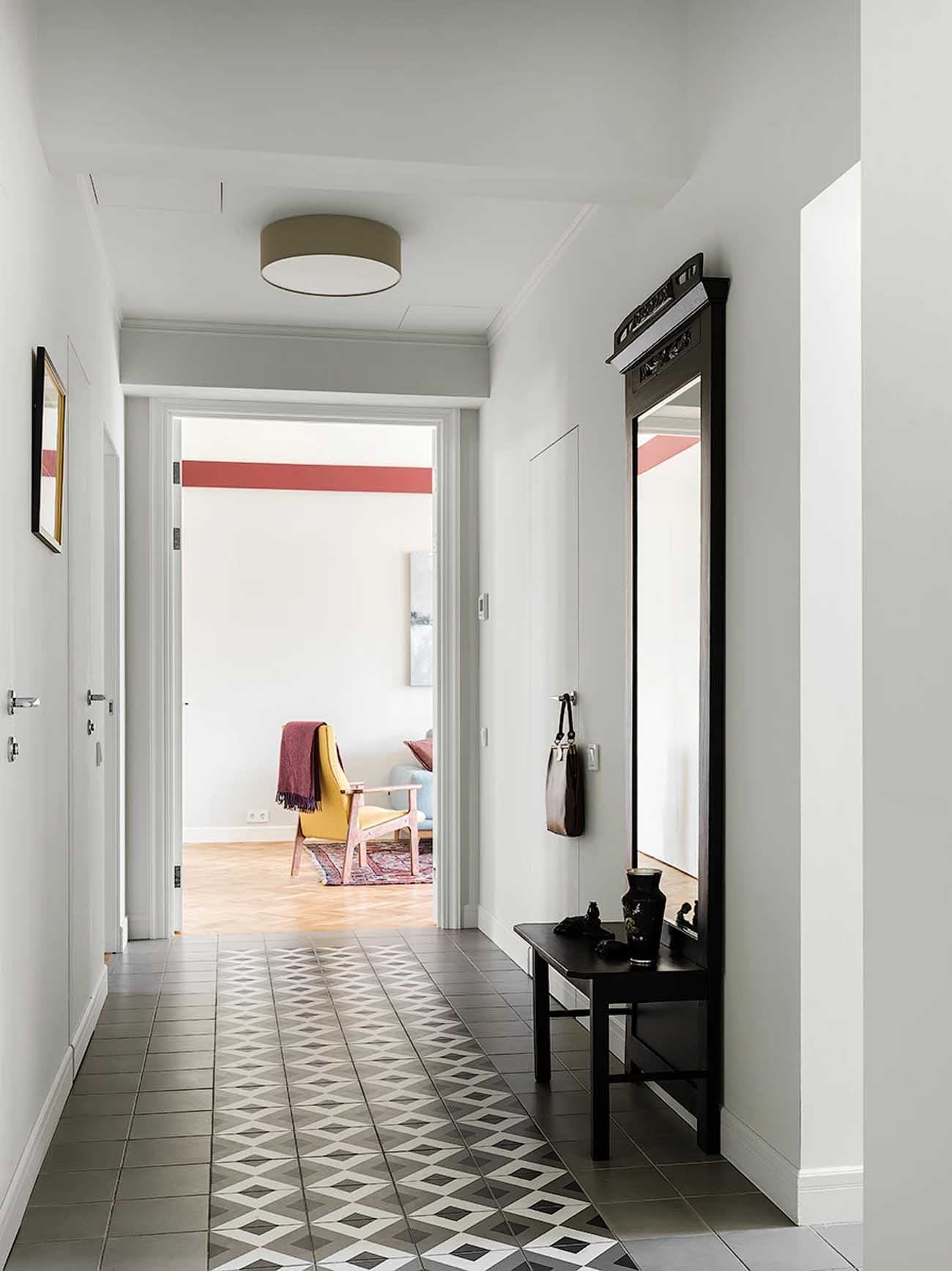 A lakás tájolása ideális: a déli oldalra, ahol három ablak is biztosítja a természetes fényt, a konyha, a dolgozó és a nappali került, míg a hálószoba az északi oldalra néz. Az ablakok vonalában egy klasszikus enfiládot (egymásba nyíló térsort) hoztak létre üvegezett, kétszárnyú ajtókkal, ami tovább fokozza a tágasság és a légiesség érzetét. A maximális világosság érdekében a falak egységesen világosszürke, már-már fehér árnyalatot kaptak. Minden helyiség rendelkezik azonban egyedi karakterrel: a nappaliban és a hálóban bordó és olívazöld sávok futnak végig, amelyek a falakról a textíliákra is átkúsznak. A fürdőszobát egy karakteres kék árnyalat uralja, míg a konyha és az előszoba padlóját kontrasztos mintázatú járólap díszíti.