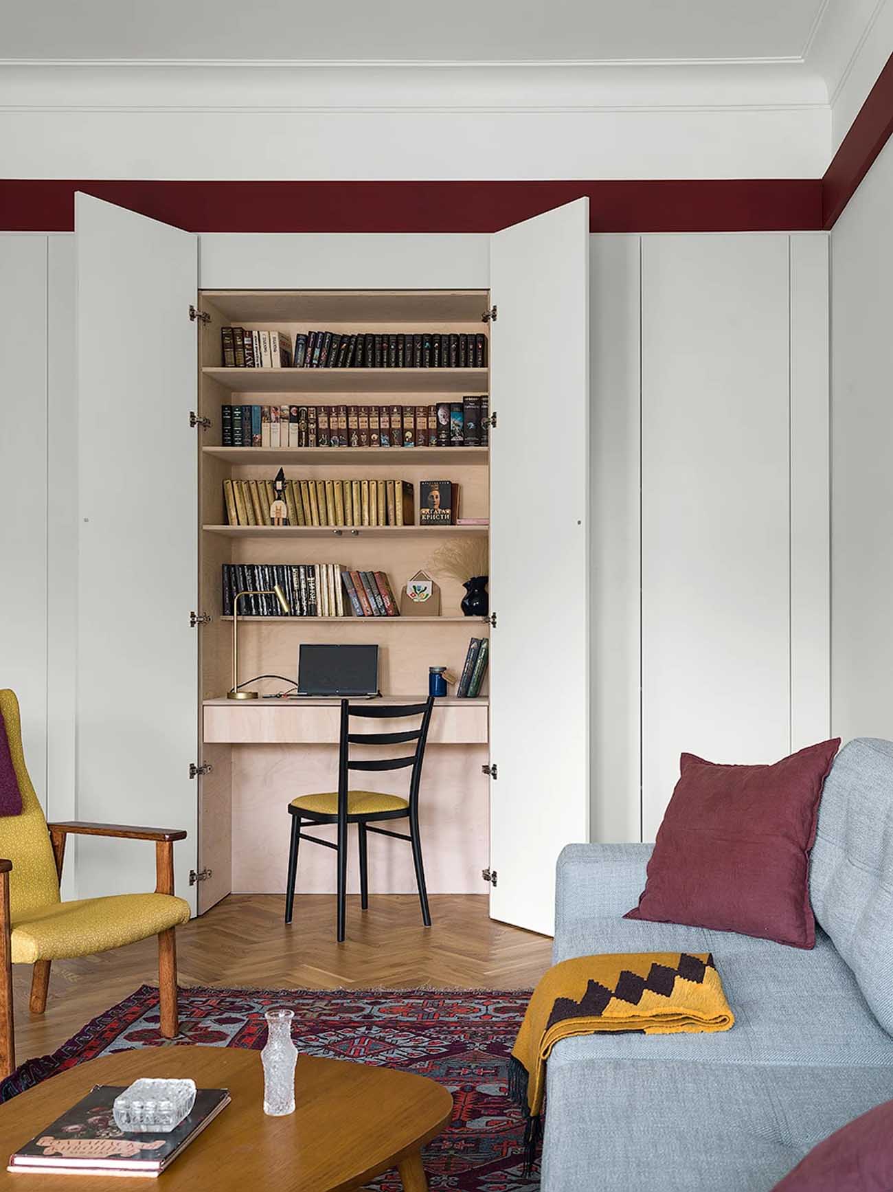 A mennyezeti stukkók megőrzése prioritást élvezett, a térszervezést alapvetően a meglévő falakban nyitott átjárókkal és néhány új válaszfallal oldották meg. A dolgozószobában emelt falrendszer kettős funkciót lát el: az előszoba felől gardróbként, a dolgozó felől pedig egy létrával megközelíthető galériaként hasznosul.