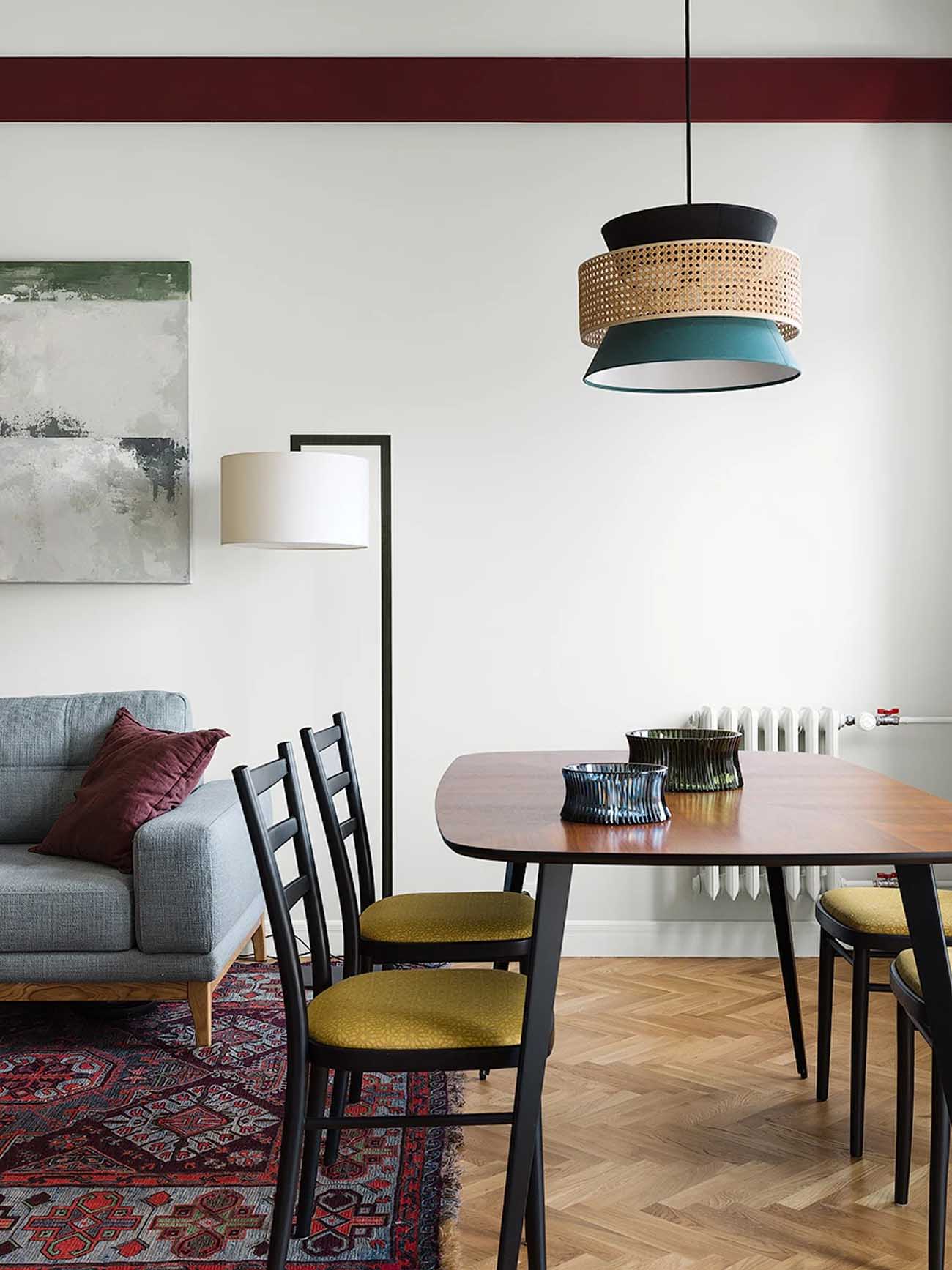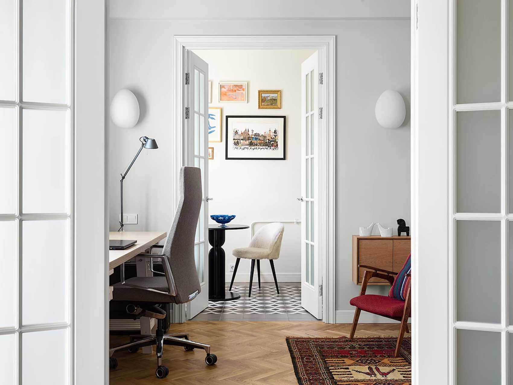 Patinás régi bérházban talált rá a 80 m²-es lakásra a fiatal pár, az elképzelésük egy tágasra hangolt, a nagy belmagasságnak és a sok ablaknak köszönhetően fénnyel teli tér volt. A stílus hangulatos retro, a színvilághoz az inspirációt a 30-as, 40-es évekből merítették. Az igényeik között szerepelt egy szeparált dolgozószoba, egy további dolgozósarok, valamint a tárolókapacitás maximalizálása.