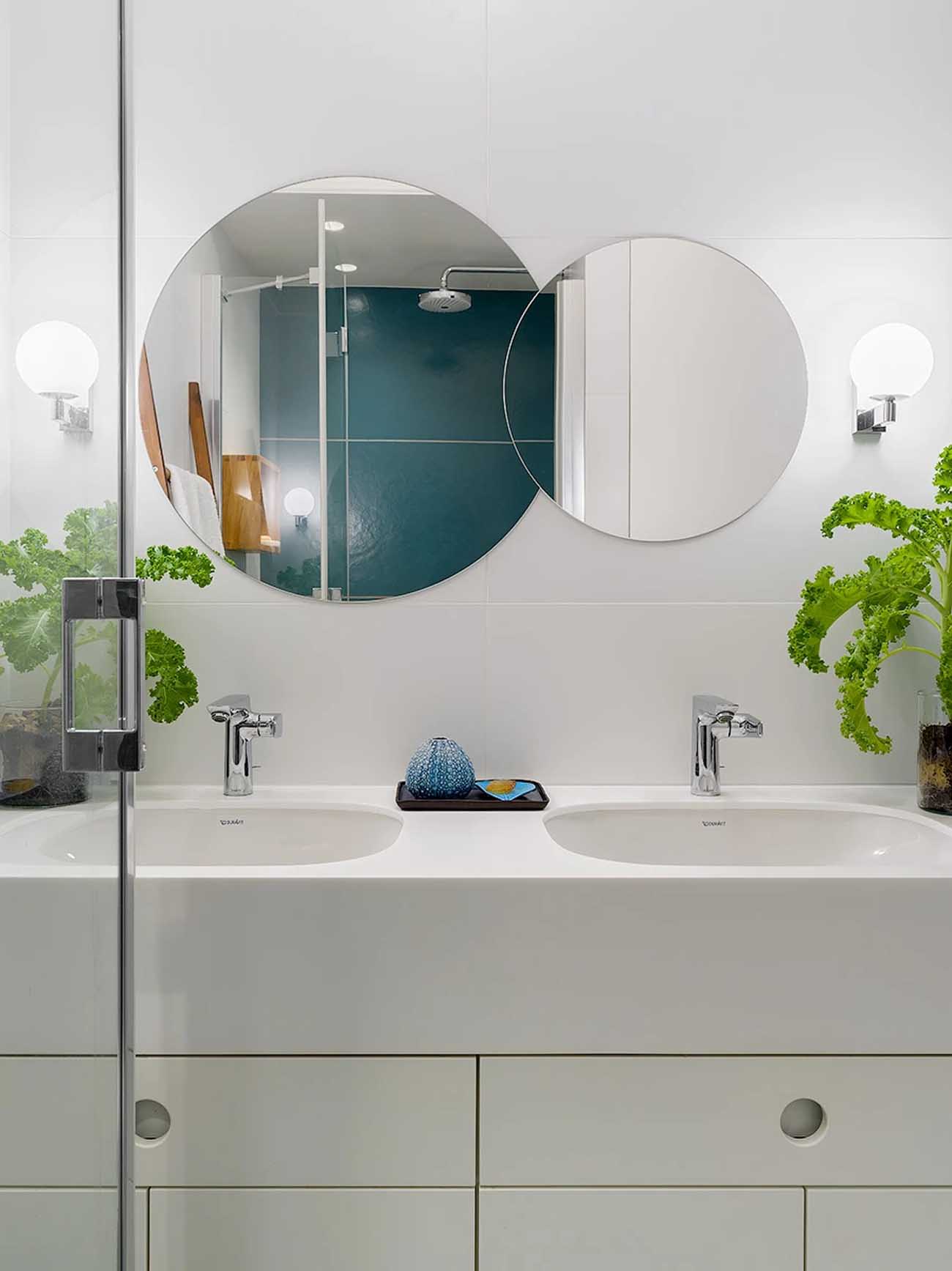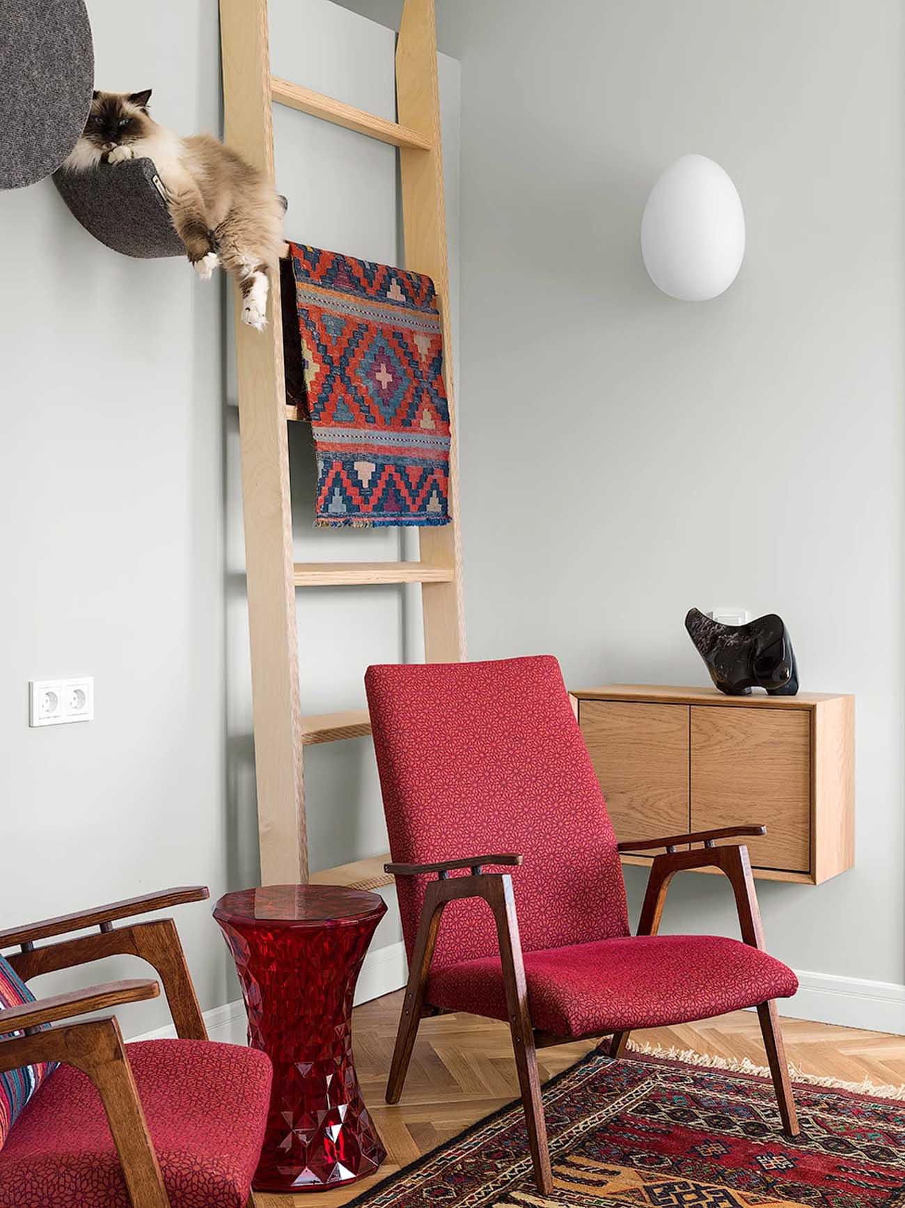 A lakásban két macska is él, akik számára speciális, integrált megoldások születtek. A dolgozószobában saját pihenőzónát kaptak, a fürdőszobában pedig – ahová az ajtón vágott diszkrét nyíláson keresztül juthatnak be – a mosdópult alatti szekrény rejti az almokat.