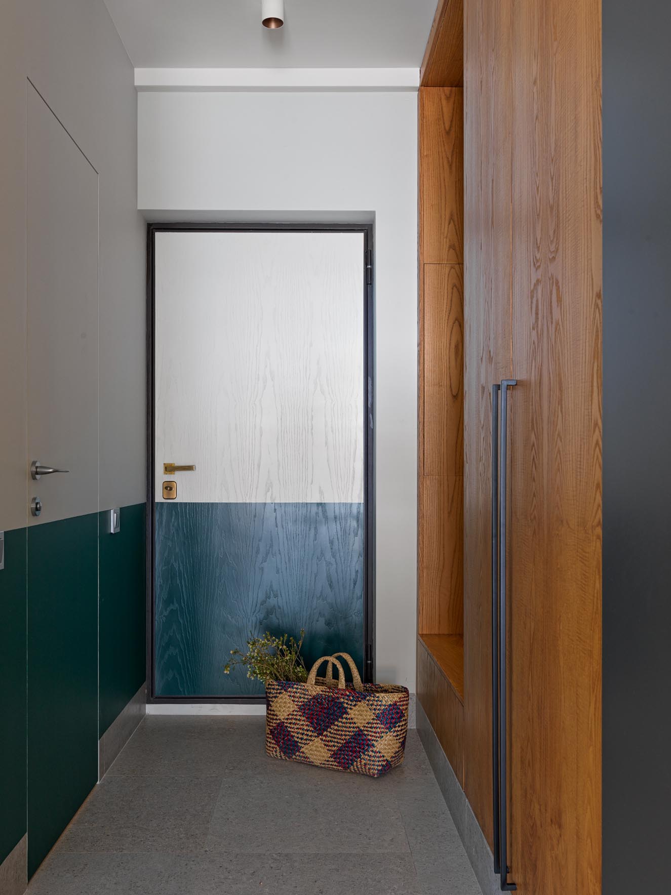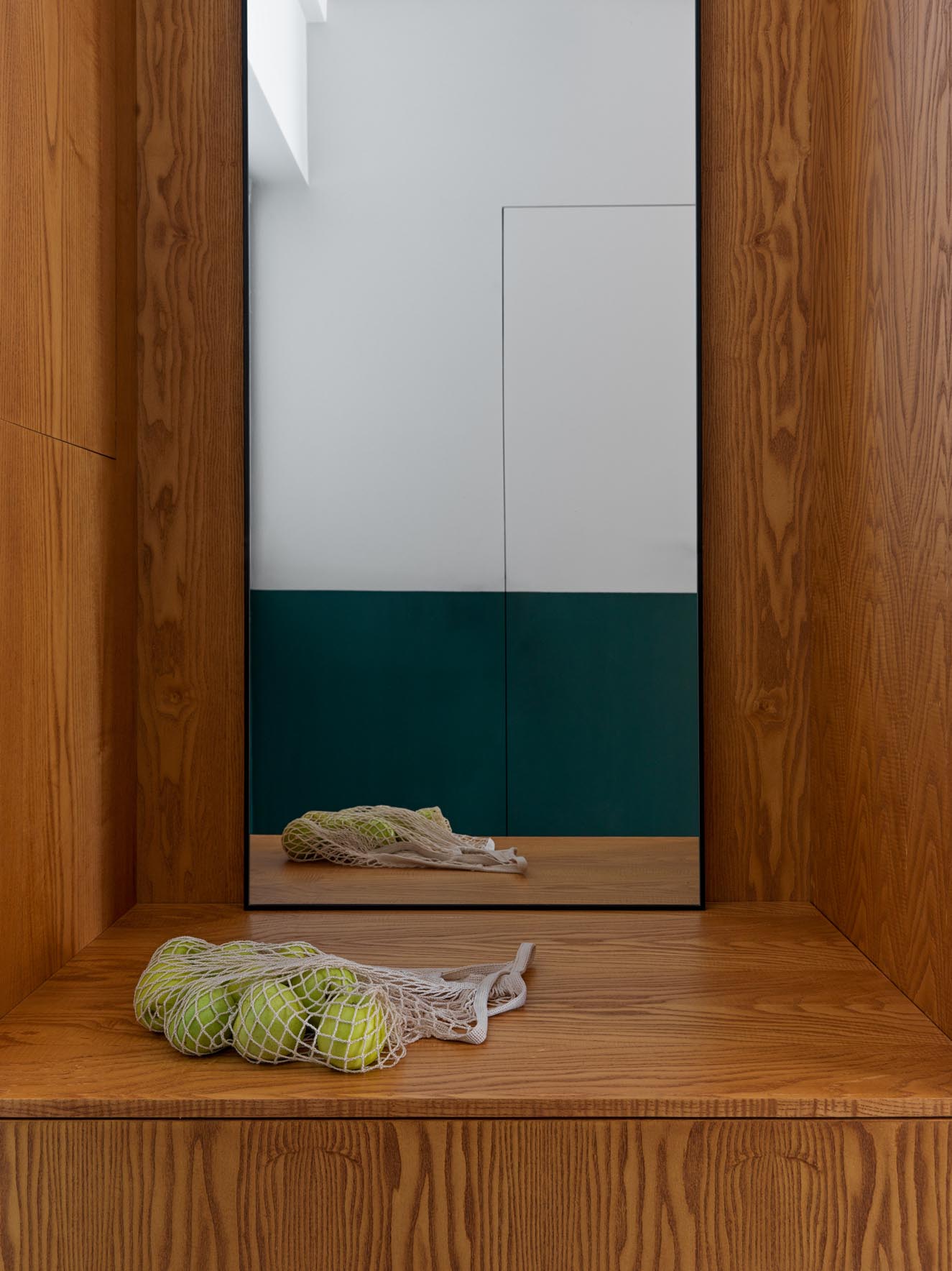 Az előszobába méretes beépített szekrényt terveztek. „A szekrényben egy széles, tükrös fülkét alakítottunk ki ülőpadkával, így nem volt szükség további bútordarabokra a szűkös előtérben. A konyha és a gardrób egyetlen, a fal síkjába simuló tömböt alkotnak. Tudatosan törekedtem rá, hogy ez a blokk vizuálisan ne törjön meg, így is őrizve az enteriőr egységét.” Az étkező zónában a robusztus asztalt könnyed vonalvezetésű fa székekkel egészítették ki.