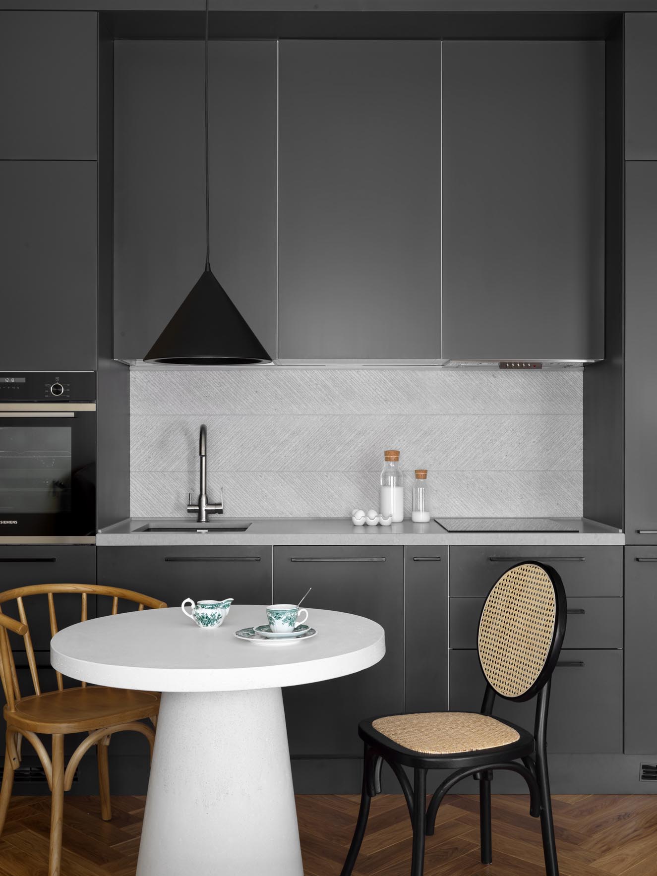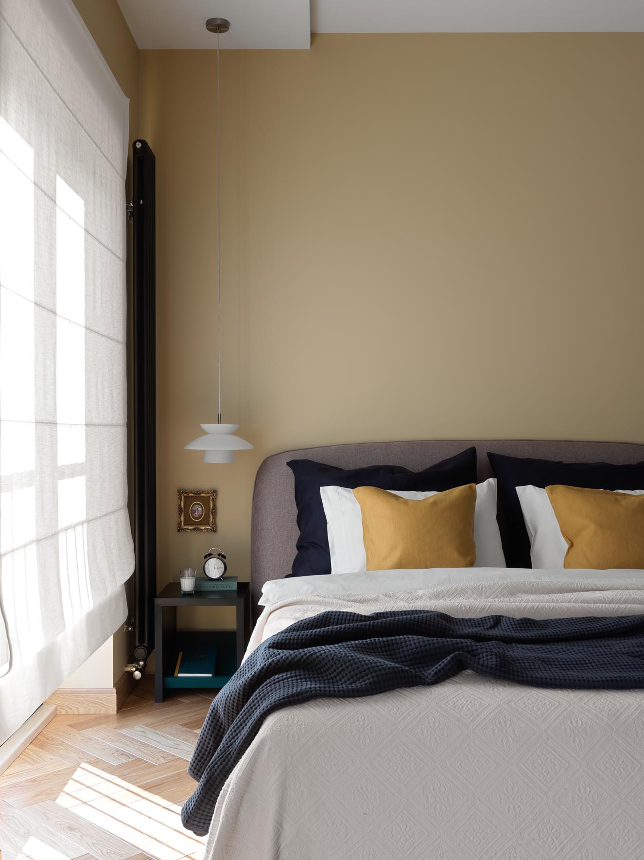 Meleg okker árnyalatok, antracit és fa bútorfrontok, természetes textúrák és vintage tárgyak segítségével alkotta meg a tervező egy kis lakás otthonosan elegáns enteriőrjét. A koncepció modern, a kinfolk stílusra utalásokkal.