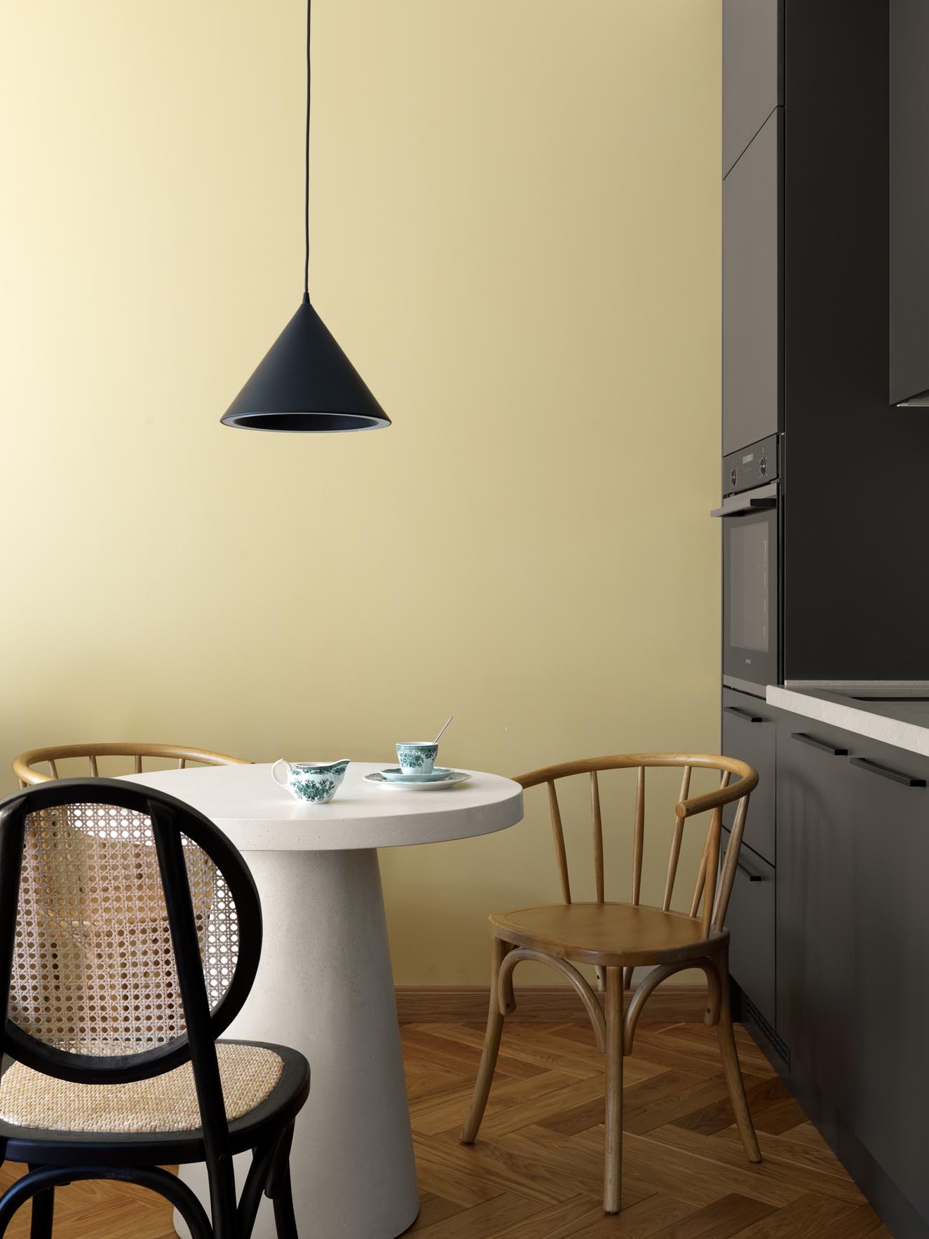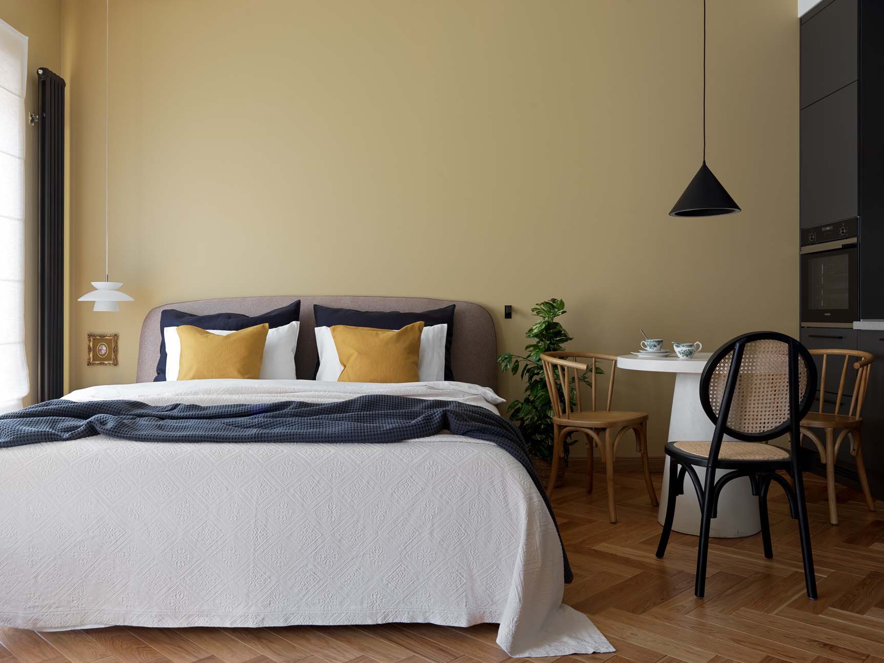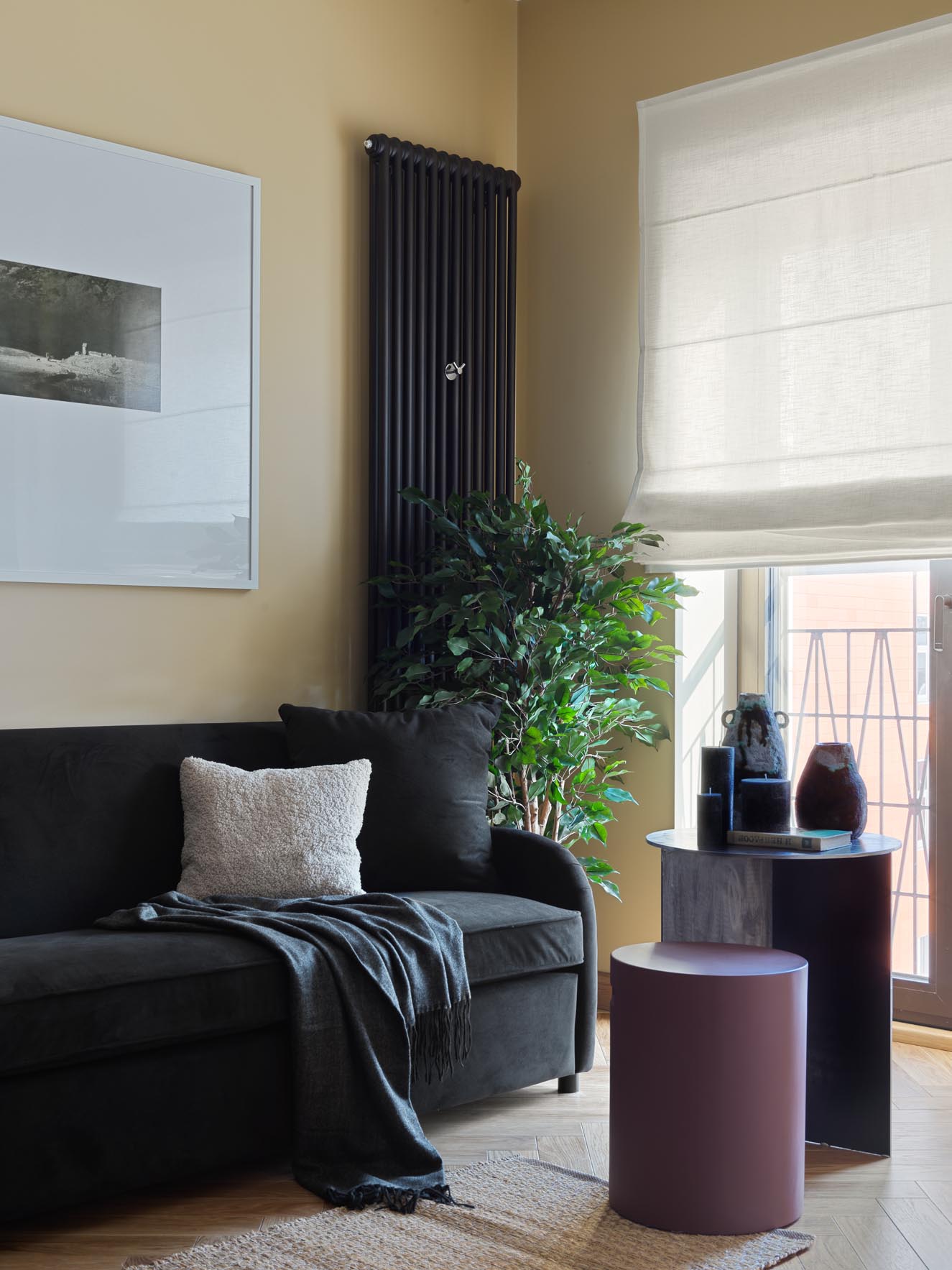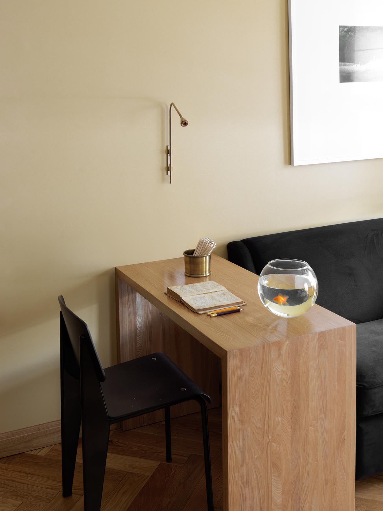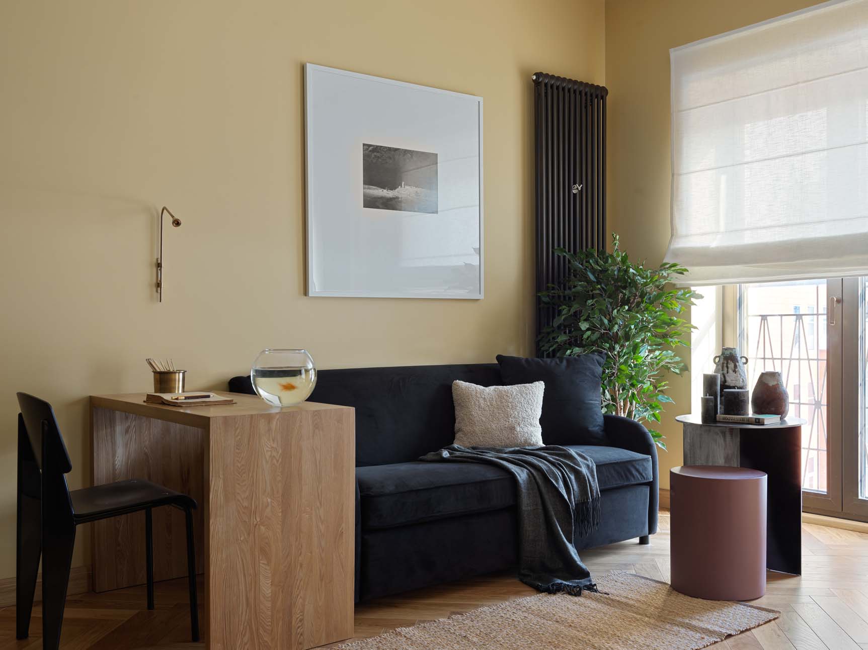 A lakás ablakai egy 19. századi épületre néznek. A szemközti ház letisztult formavilága és semleges homlokzati színei inspirálták az enteriőr palettájának kialakítását. „Szerettük volna elkerülni a személytelenséget, ezért a megszokott világos falak helyett egy meleg okkeres tónus mellett döntöttünk. Célunk az volt, hogy a lakás egész évben otthonosságot sugározzon. Ez egyfajta közös kísérletezés volt a megrendelőkkel, de az eredményével mindannyian elégedettek lettünk” – meséli a tervező. „A másik meghatározó szín az antracit lett, amely a konyhabútor frontjain köszön vissza, majd a textíliákban, a kanapén és a székek kárpitján feketébe mélyül. Ezzel egy karakteres, grafikus hatású teret hoztunk létre.”