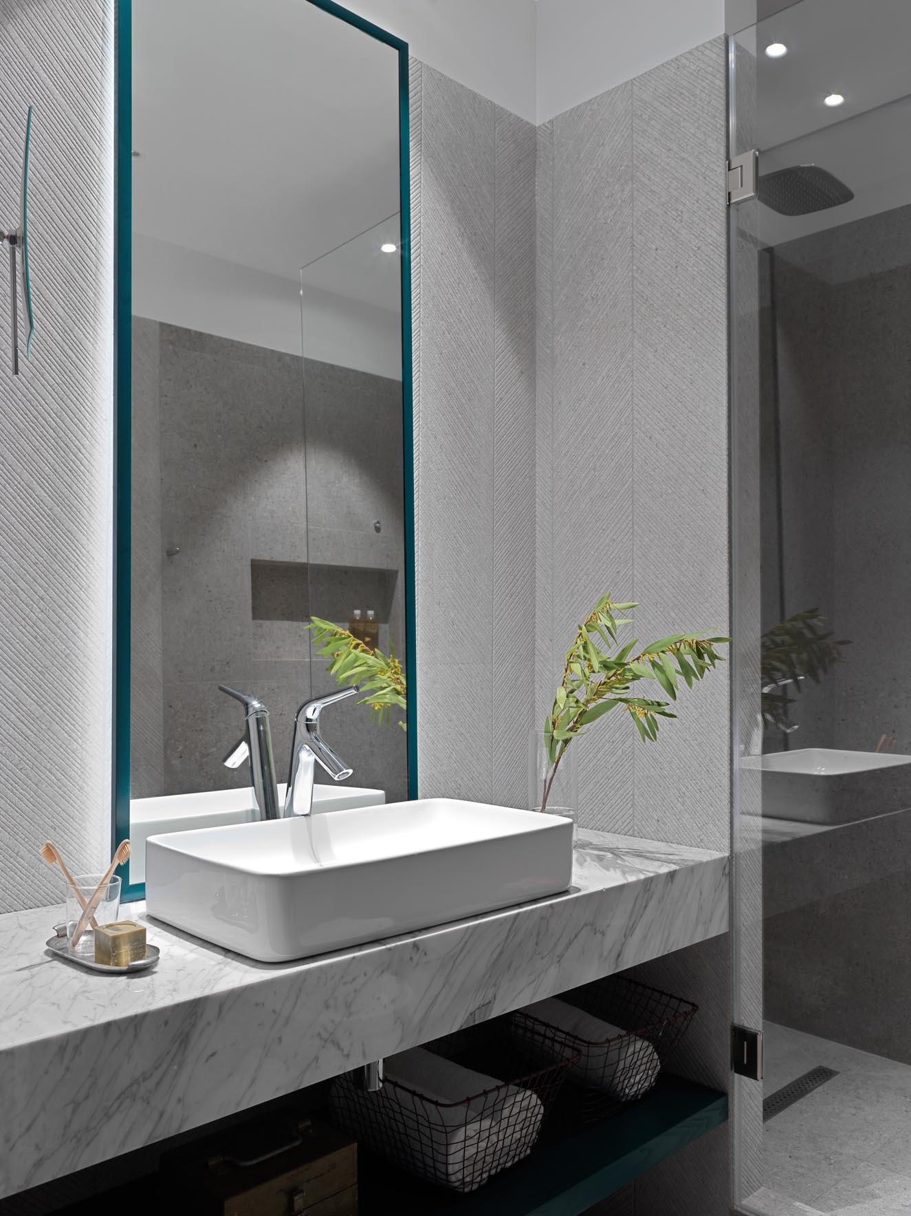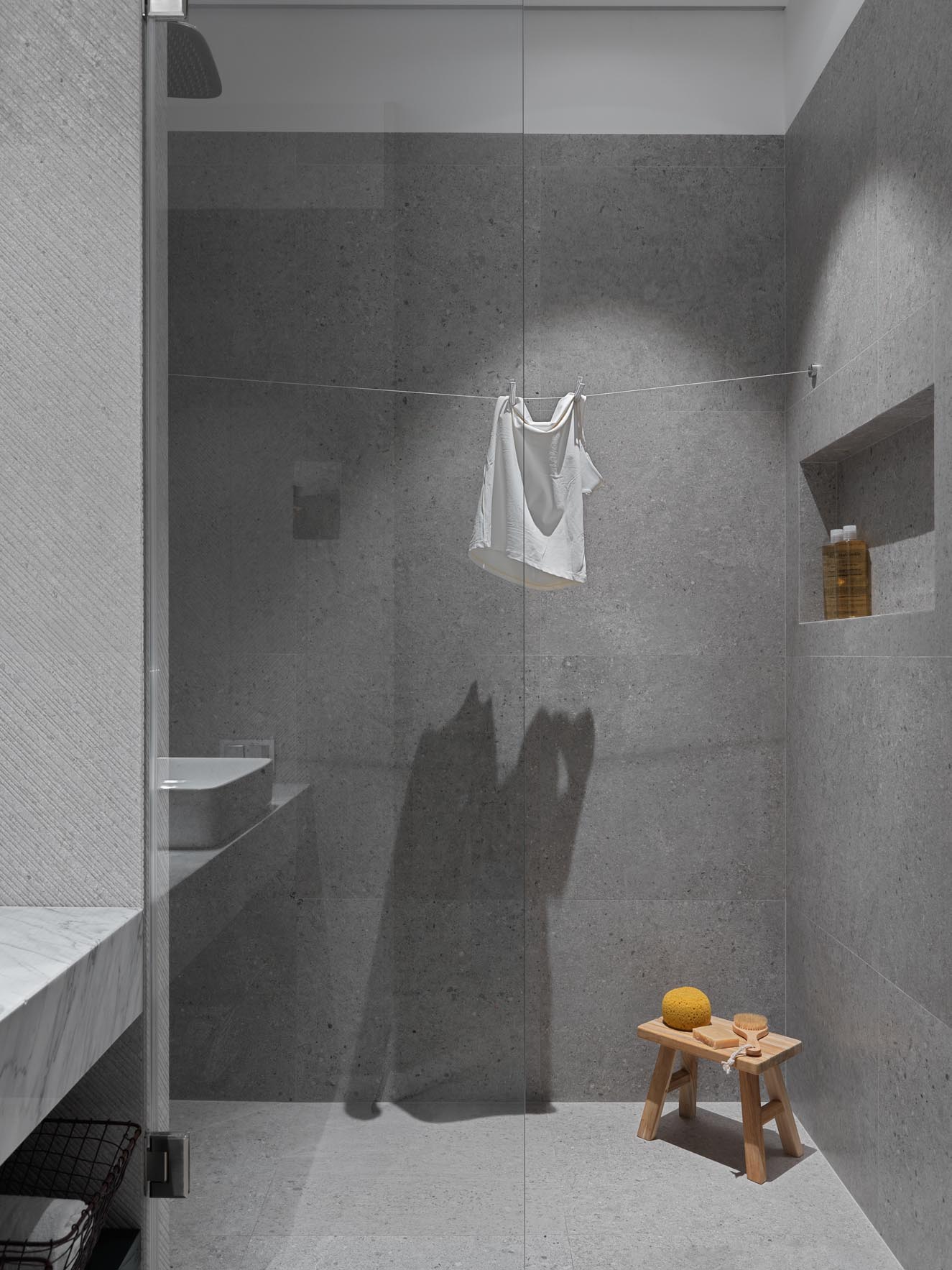 A kompakt alapterület ellenére sikerült egy tágas és funkcionális fürdőszobát is kialakítani. A helyiség központi eleme a lebegő, Carrara márványból készült mosdópult, amely alatt nyitott polc ad helyet a törölközőknek. A polc smaragdzöld árnyalata a tükörkereten is visszaköszön, finom kontrasztot alkotva a márvány rajzolatával. A tervező a tárolásról is gondoskodott: a beépített szekrények frontjai diszkréten rejtik a mosógépet és a háztartási eszközöket.