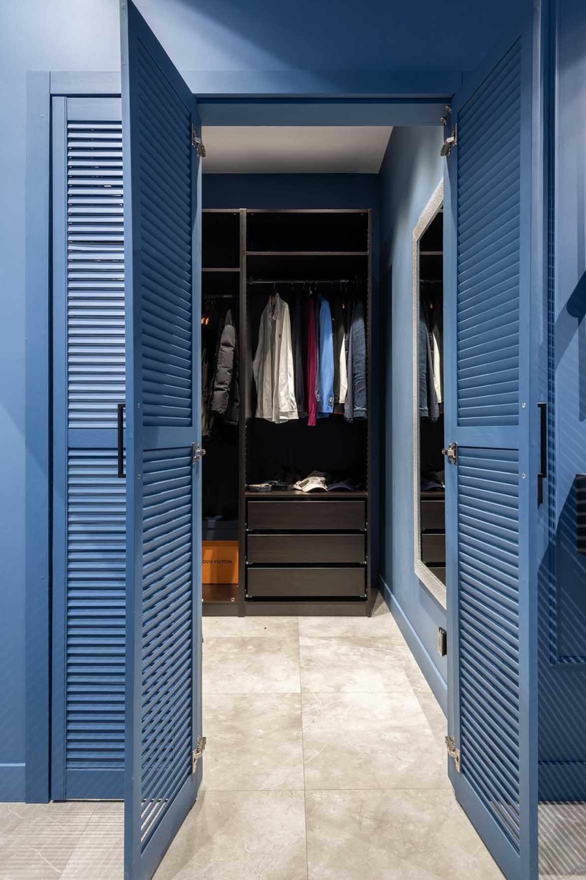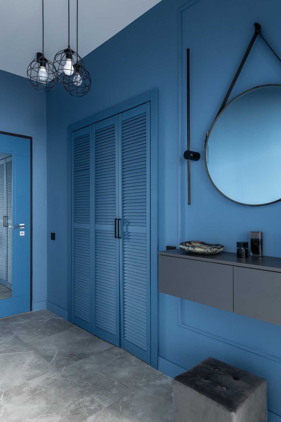 Az előszobát teljes egészében kék színnel díszítette a tervező – a falak egy sötétebb, a mennyezet világosabb kék festést kapott. A gardróbhelyiséget lamellás ajtókkal választották le, melyeket a kerettel együtt a fal színére festettek. A gardróbban a szekrény elemek feketék, ami modern, karakteres hatást kelt.