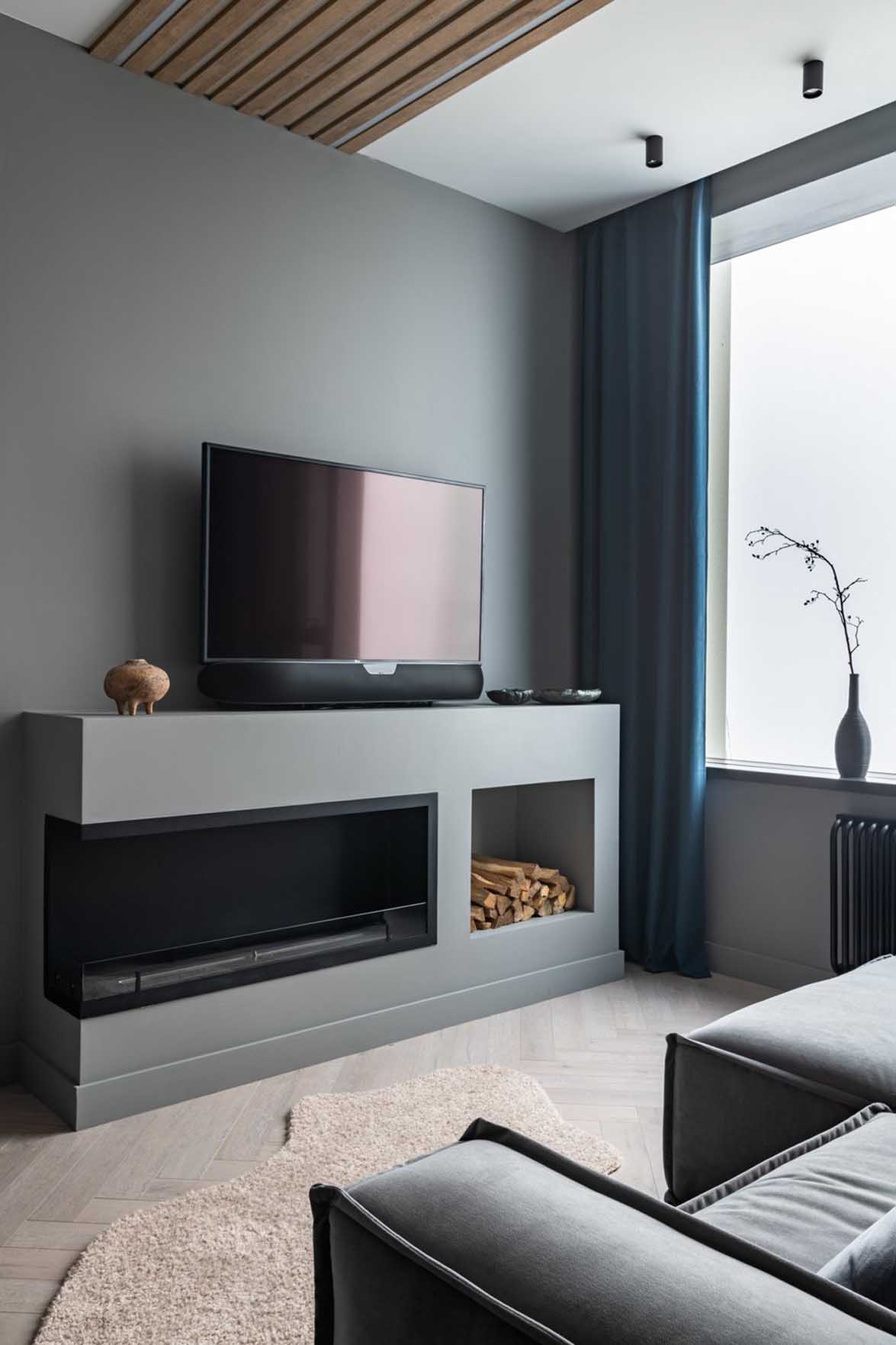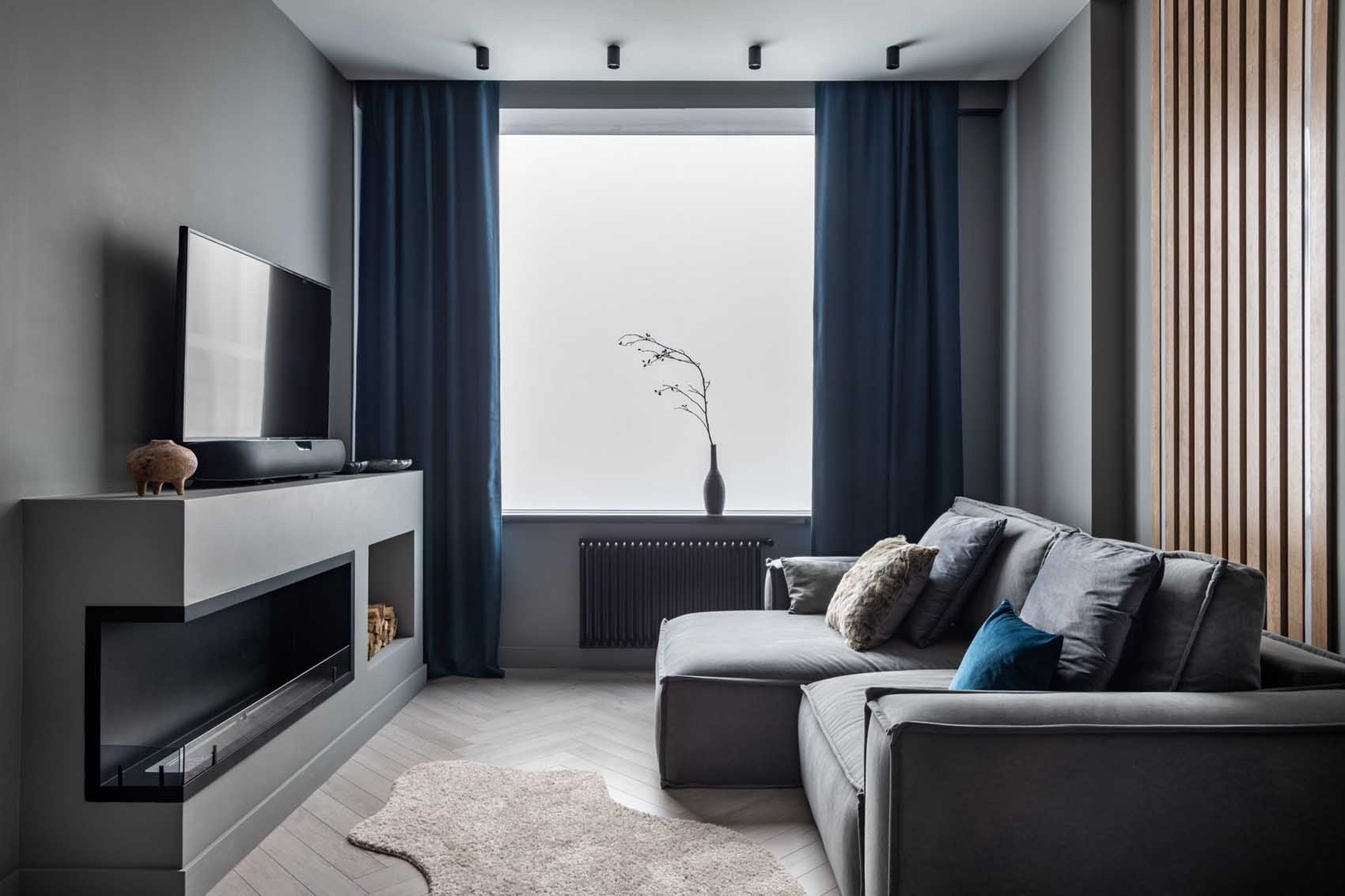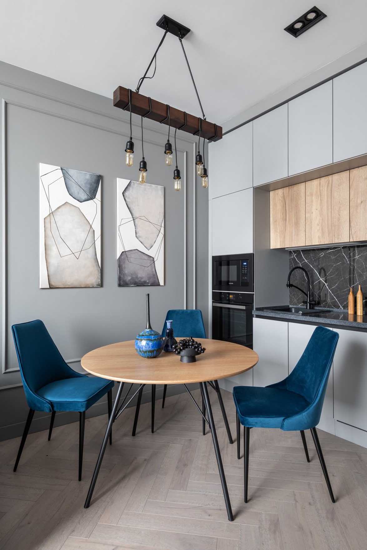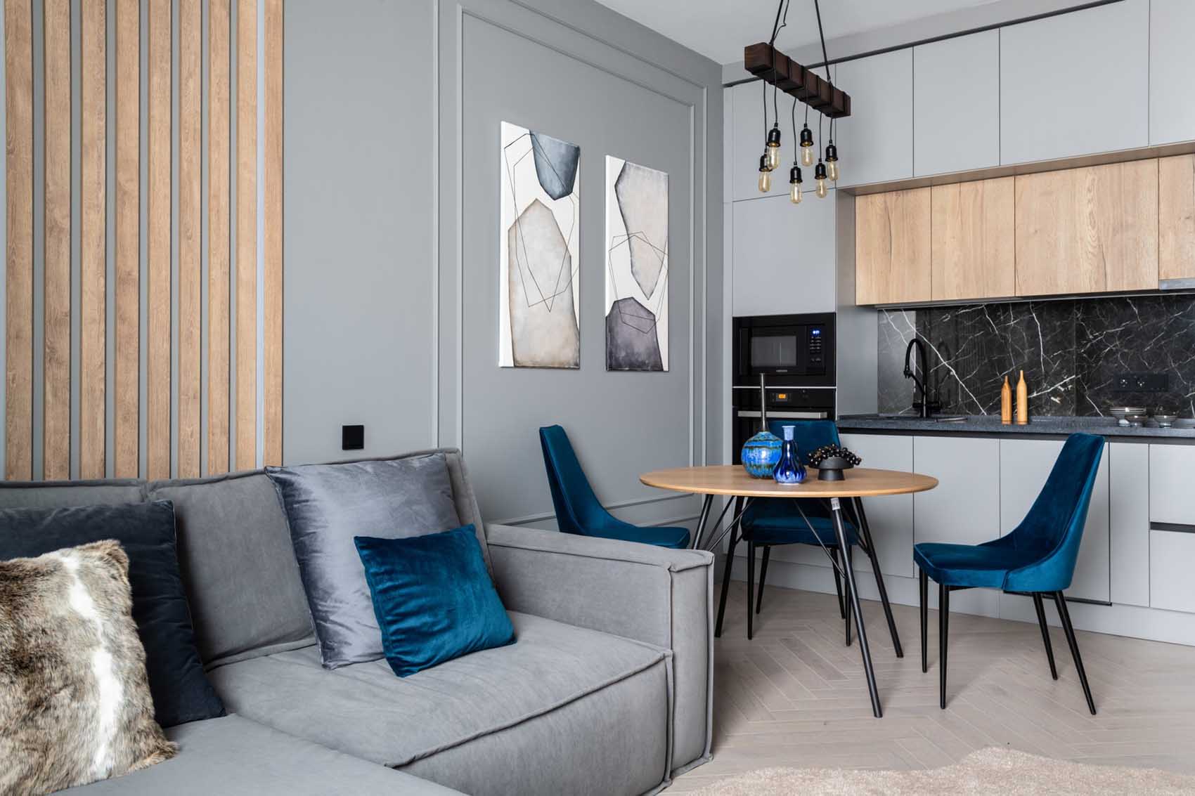 Ebben az 52 m²-es lakásban a modern stílus nem csupán a formavilágban, hanem az anyagok és színek tudatos, finom egyensúlyában nyilvánul meg. A tervező egy olyan enteriőrt alkotott, amely egyszerre sugároz professzionális megjelenést és otthonos meleget. A szürke és a mélykék árnyalatai, valamint a fa és a kő felületeinek találkozása egy olyan kifinomult életteret eredményezett, ahol a funkcionalitás és az esztétika is fontos szerepet kapott.