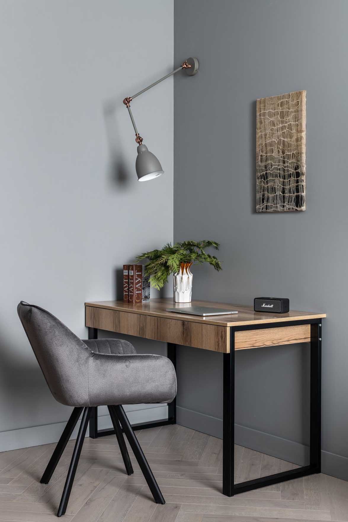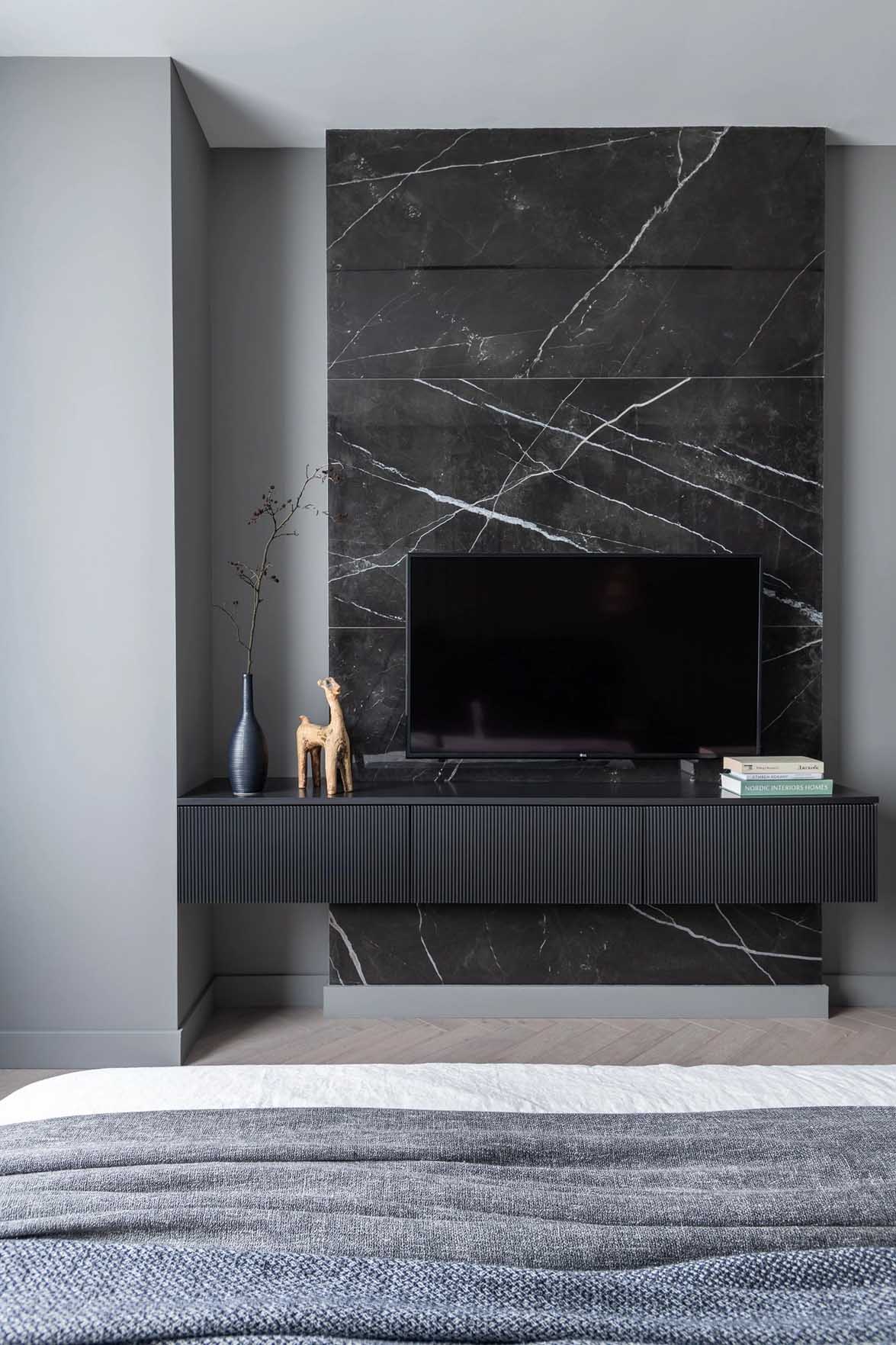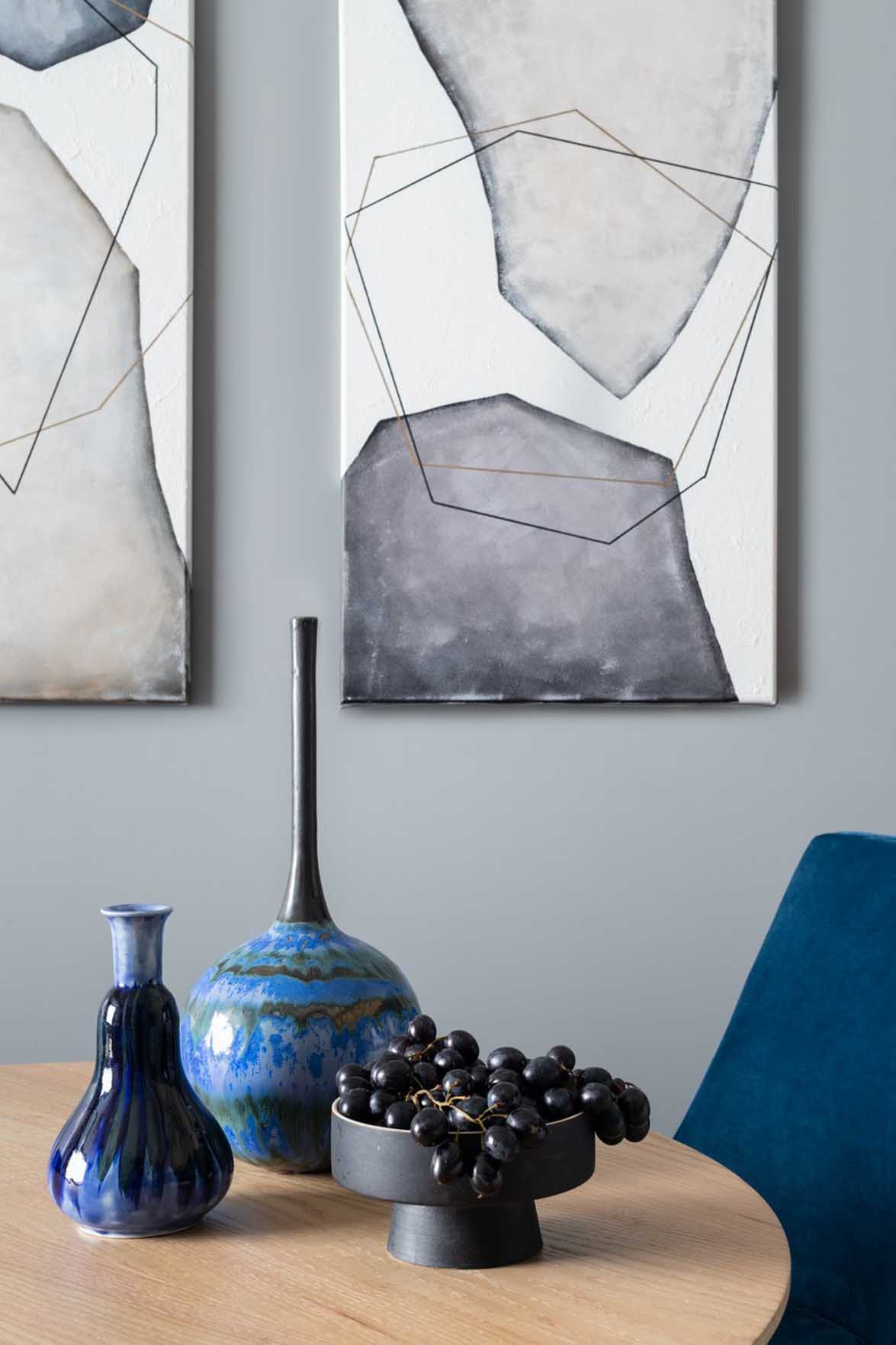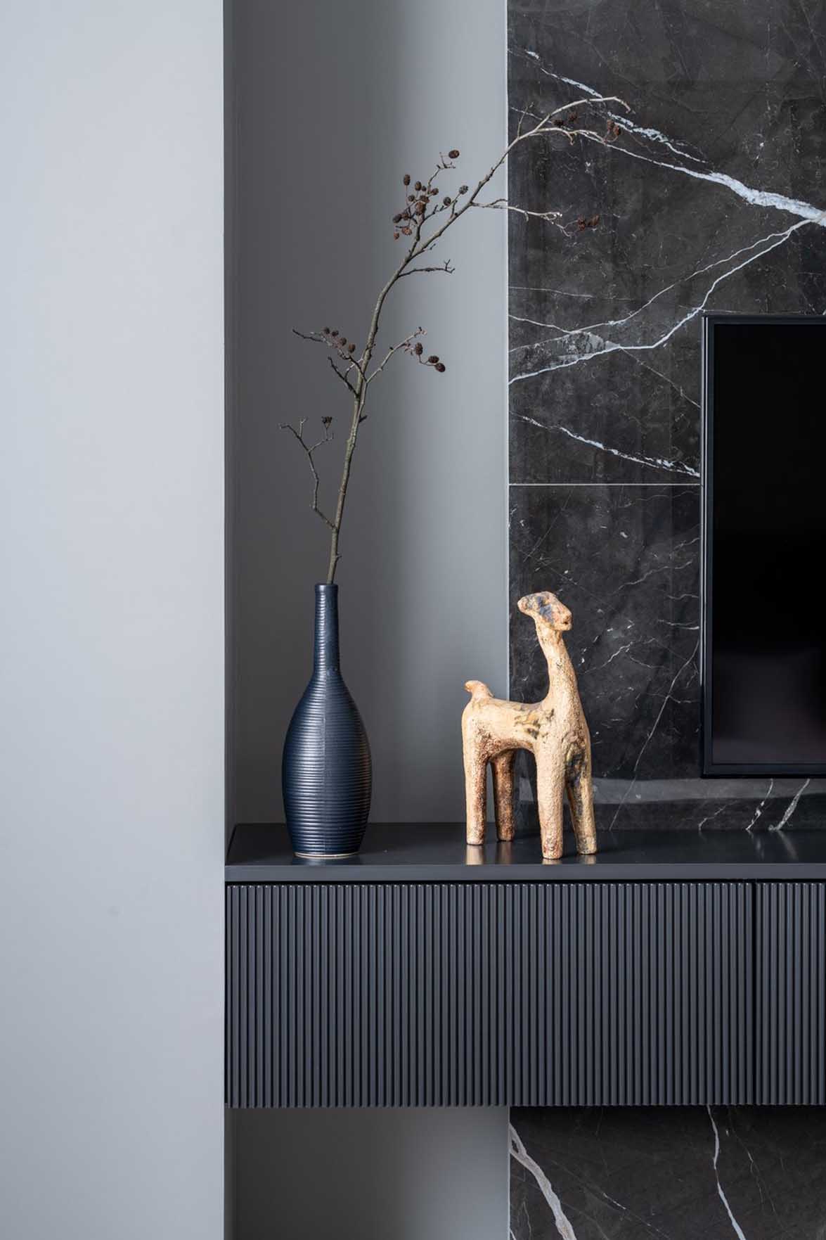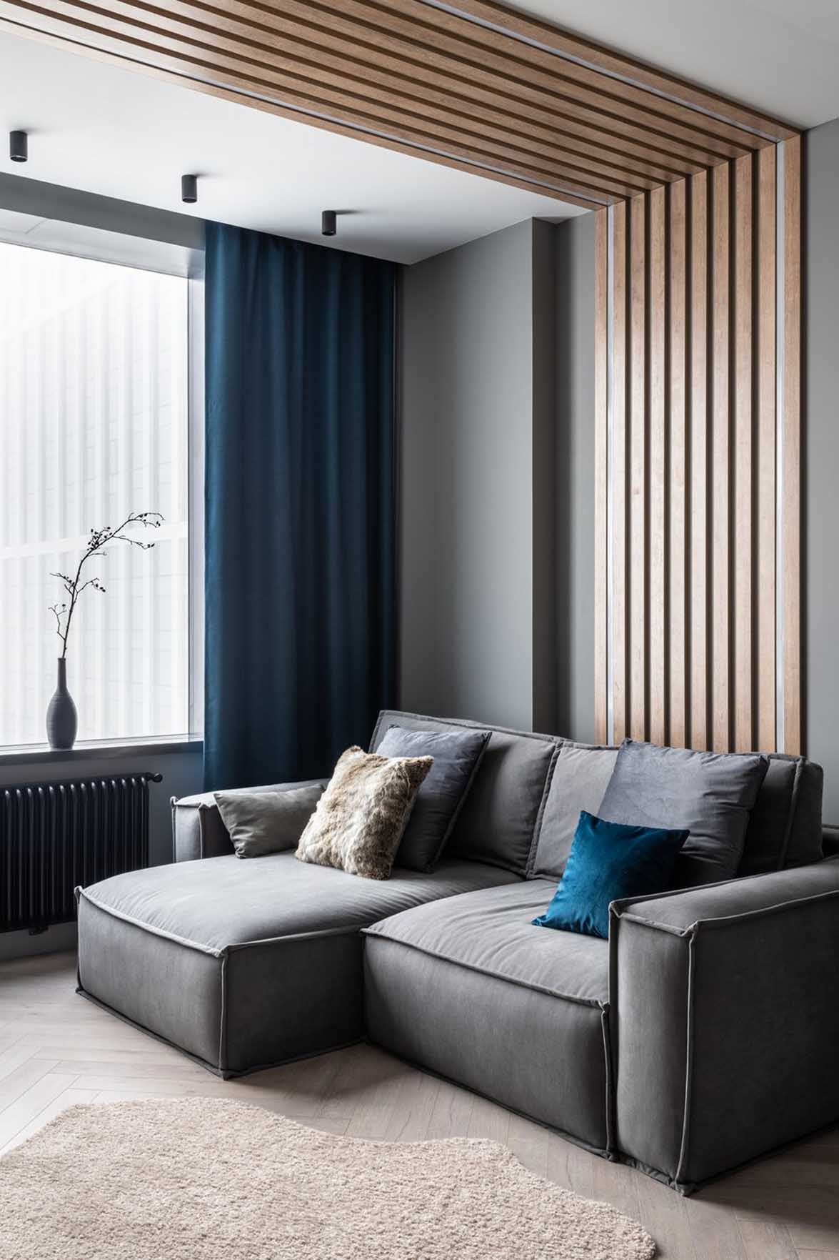 Ebben az 52 m²-es lakásban a modern stílus nem csupán a formavilágban, hanem az anyagok és színek tudatos, finom egyensúlyában nyilvánul meg. A tervező egy olyan enteriőrt alkotott, amely egyszerre sugároz professzionális megjelenést és otthonos meleget. A szürke és a mélykék árnyalatai, valamint a fa és a kő felületeinek találkozása egy olyan kifinomult életteret eredményezett, ahol a funkcionalitás és az esztétika is fontos szerepet kapott.