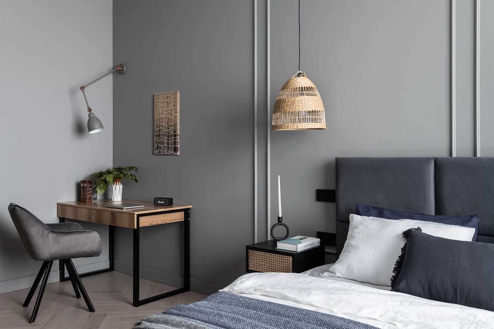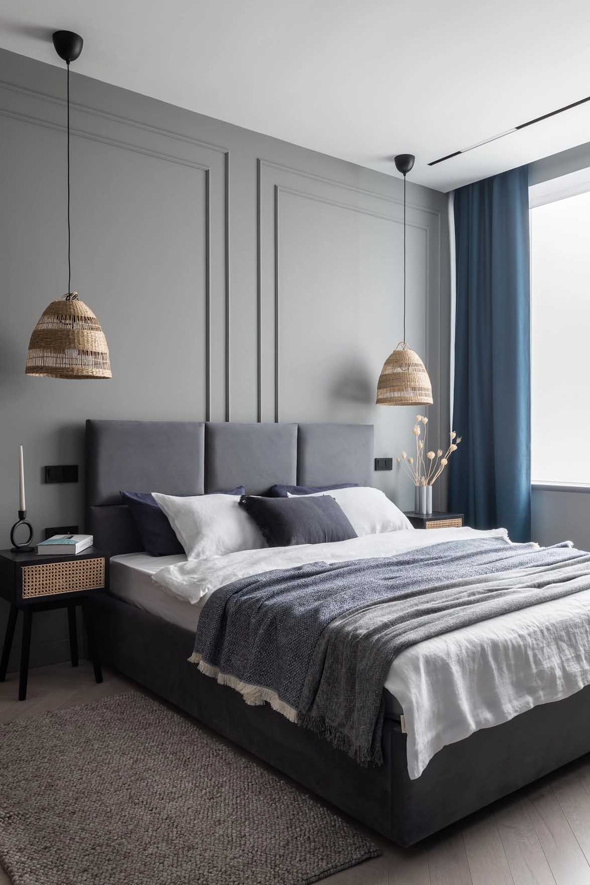 A hálószobában a kék függönyök mélysége és a rattan lámpák könnyedsége teremt harmóniát. A tervező elkülönített egy dolgozósarkot is, amely bár nincs az ablak közvetlen közelében, az átgondolt világításnak köszönhetően teljes értékű munkaterület.