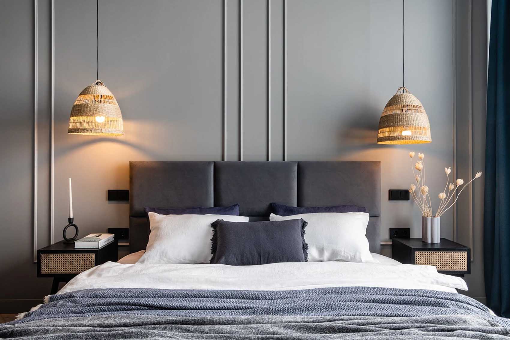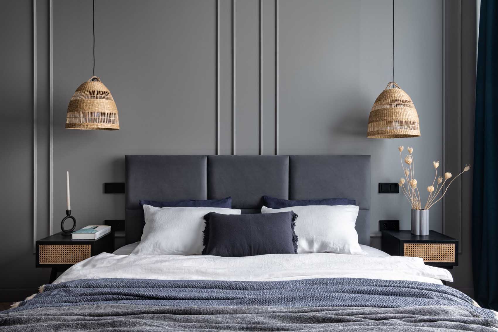 Pro tipp – Természetes fonatok a modern térben: A hálószobában látható rattan éjjeliszekrények és függesztékek azonnal lágyítják a modern, szürke-kék alapokat. A fonott kiegészítők természetközeli hatást keltenek, ami bizonyítottan csökkenti a stresszt – használjuk őket bátran modern környezetben is.