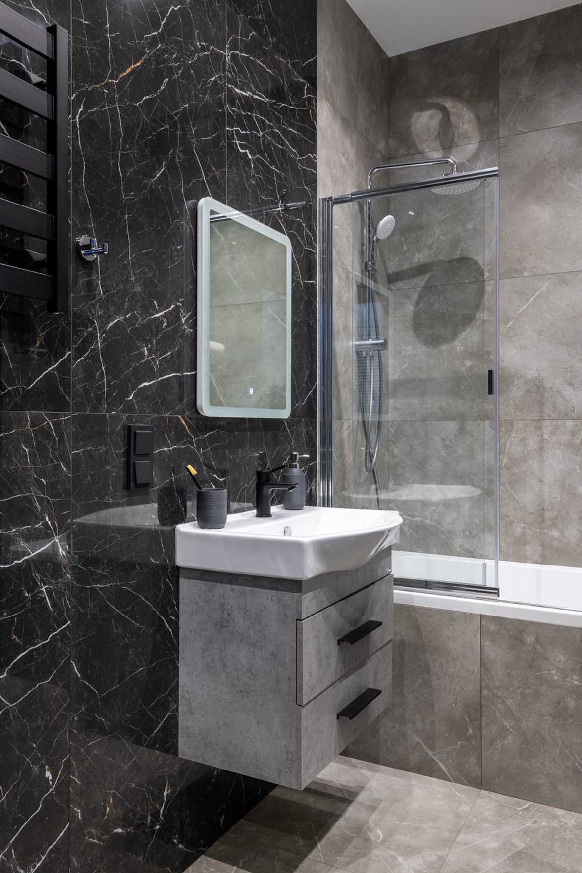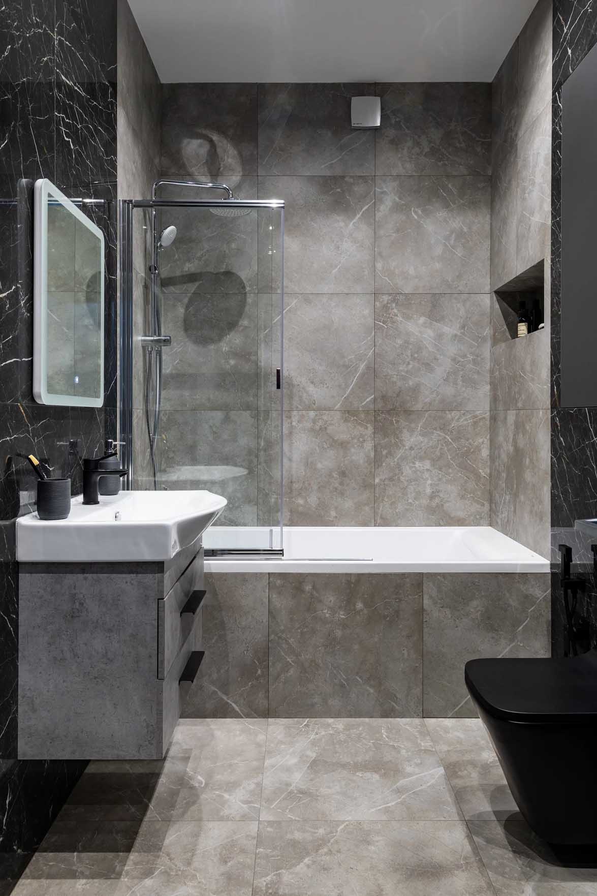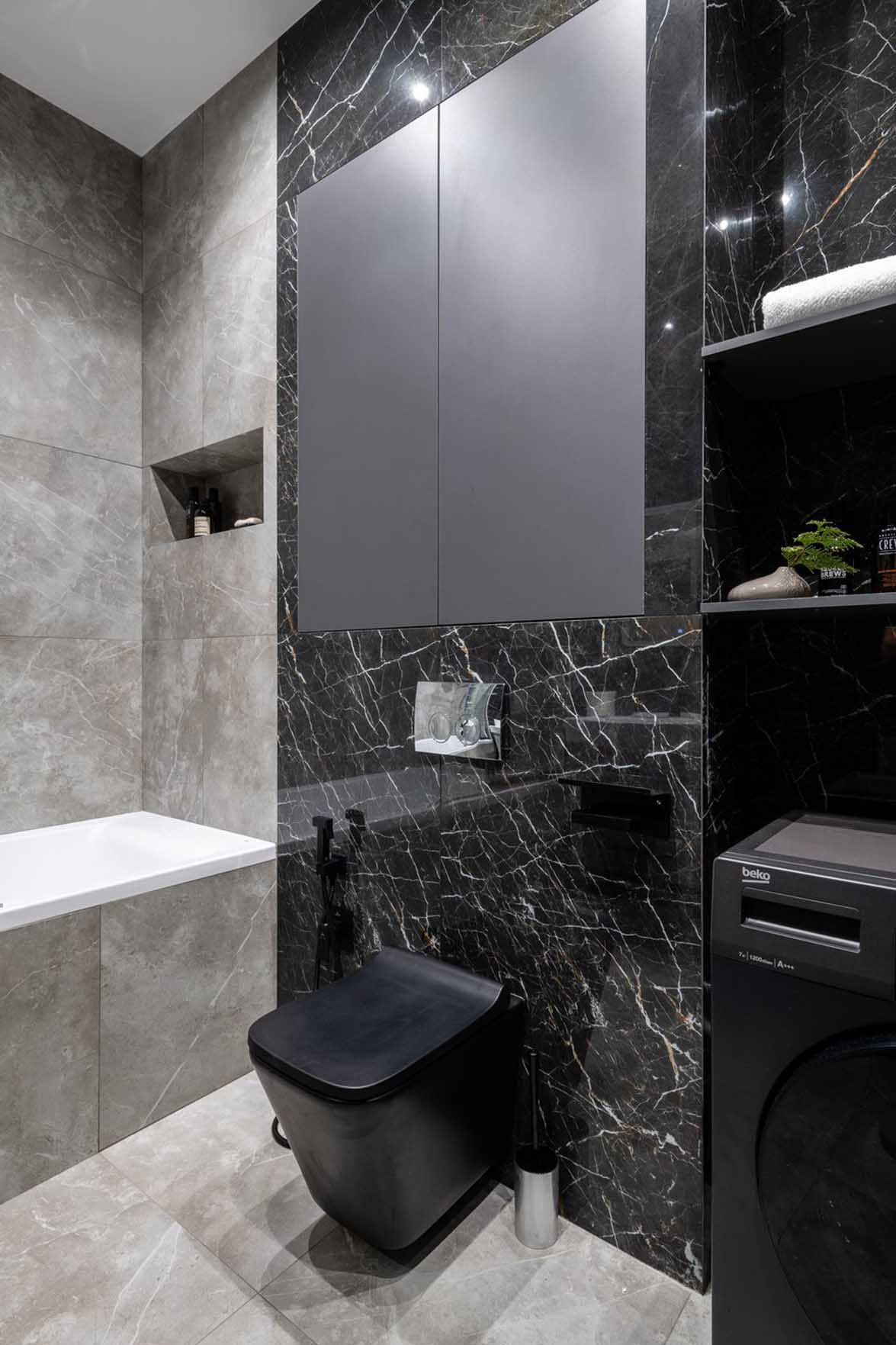 A fürdőszoba a kőhatású burkolatokkal luxus spa élményt idéz. A tárolás itt is profi: a mosógép feletti polcrendszer és a WC feletti rejtett szekrény minden négyzetcentimétert kihasznál.
