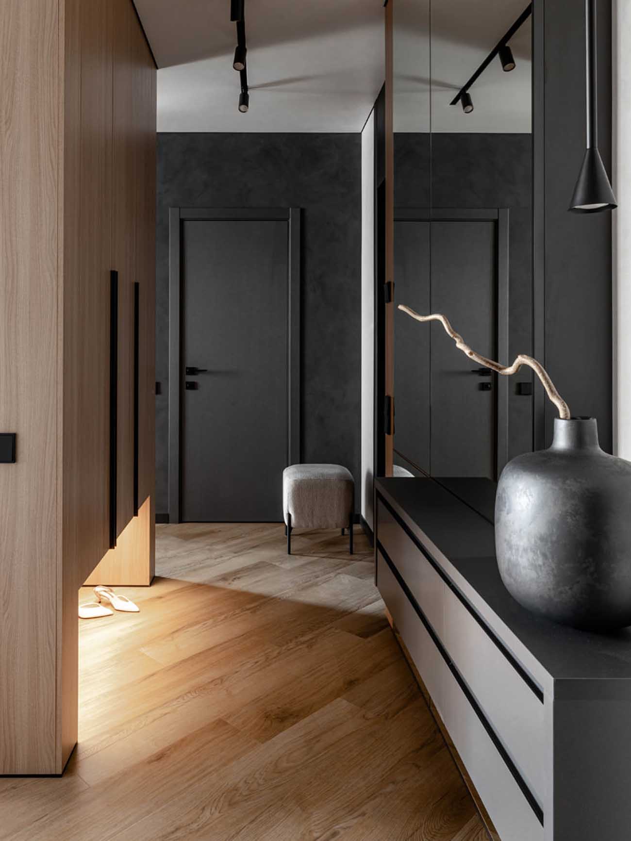 Az előszobába lépve azonnal érzékelhető a következetes anyaghasználat: a meleg fa felületek és a sötét, matt szürke elemek elegáns kontrasztja. A bejárati zónából a közösségi térbe lépve következik az egyik leginnovatívabb megoldás: a közlekedőben elhelyezett, nagyméretű gardróbszekrénybe integrált munkaállomás.